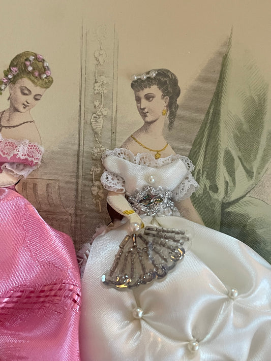 Coppia quadri di profondità con stampe modisteria ‘800 e abiti tessuti a mano