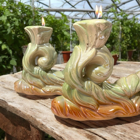 Coppia candelabri Art Nouveau anni ‘30 ceramica iridescente