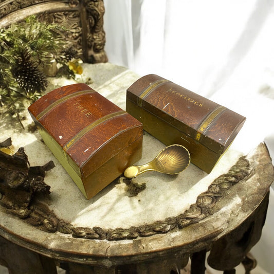 Coppia Scatole latta tè e cucchiaini a scrigno olandesi primo novecento