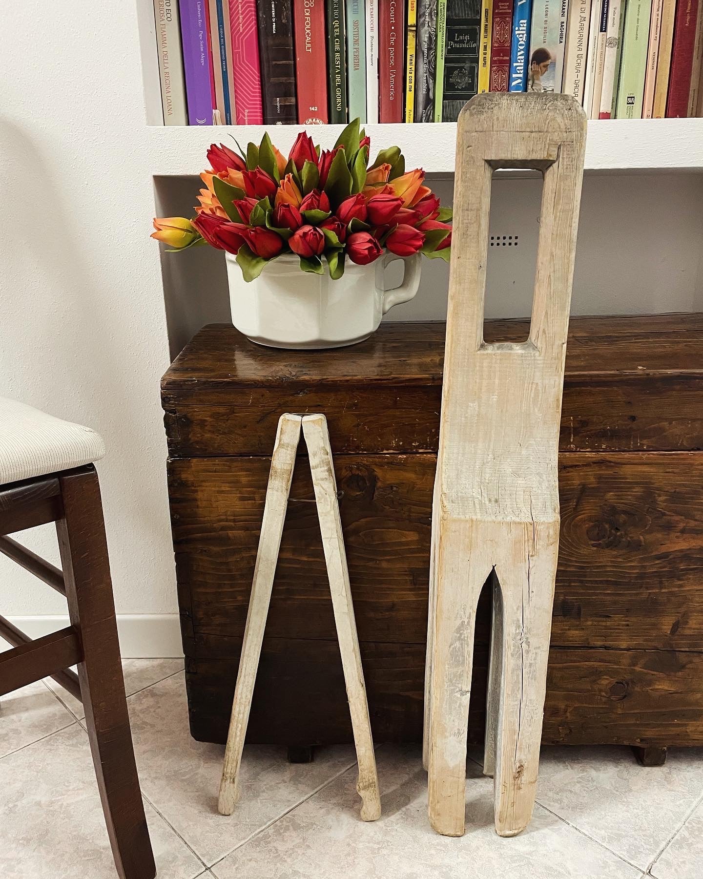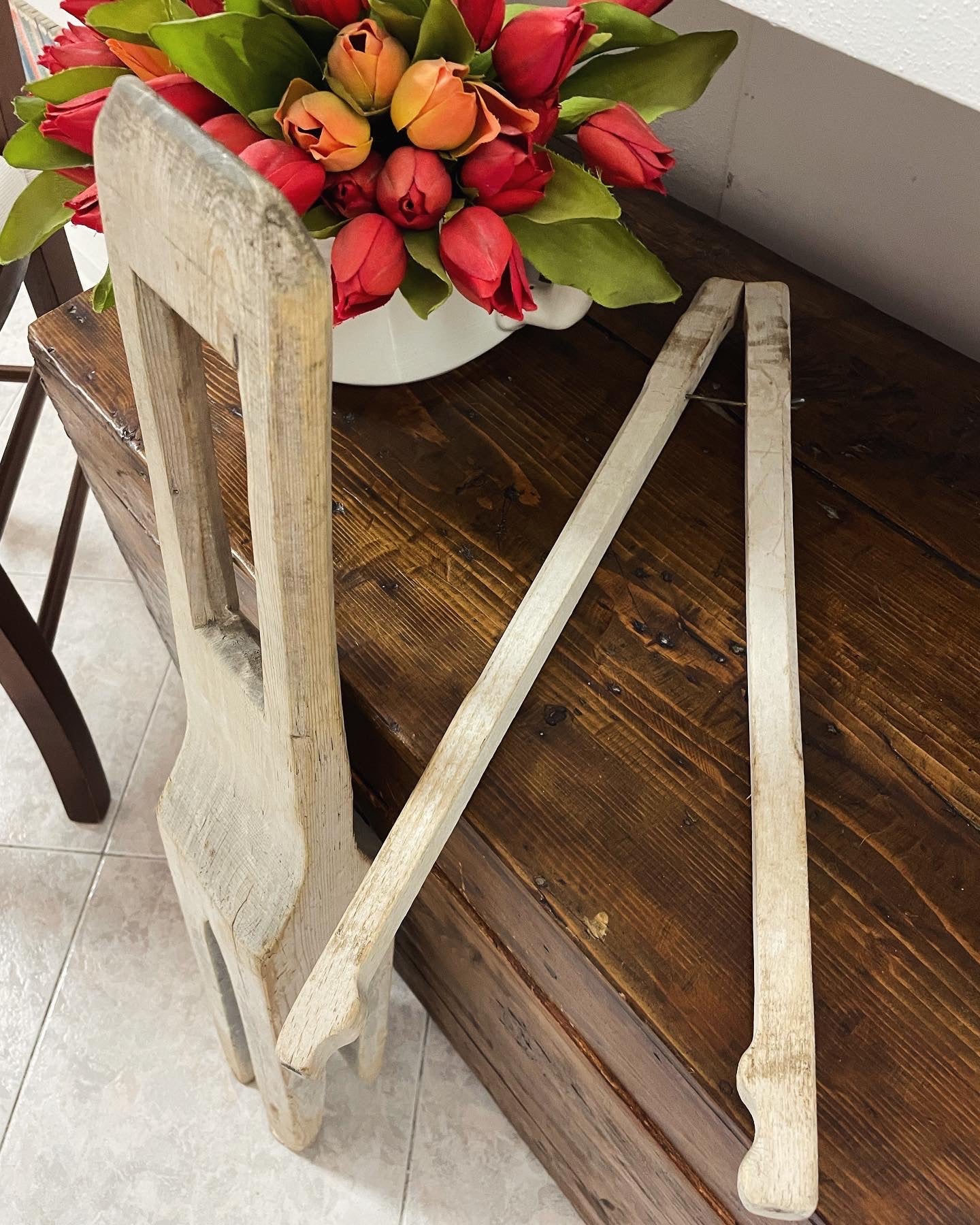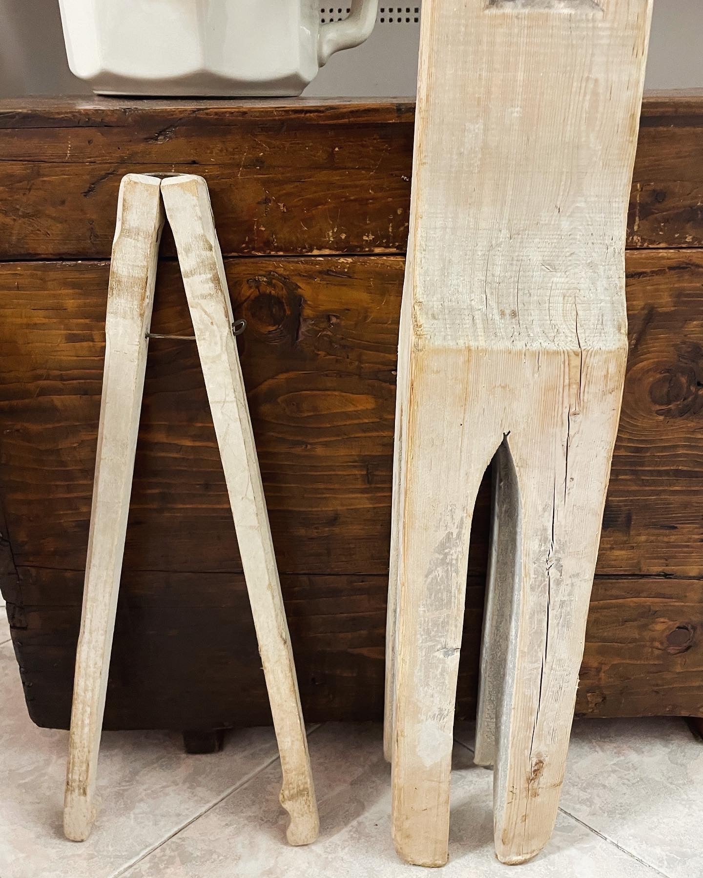 Some objects are so large and so exclusive that they need a known reference: this is why we have displayed them near a chair! So you can realize their size... but above all answer the question: what is it?!? An ancient STIRRER for clothes and relative tongs. Patented in the Victorian era, this model with four wooden arms allowed washerwomen to stir the laundry in boiling water with soda. Bear in mind that it is 81 cm long!! Then, to avoid damaging the skin of the hands due to the chemicals and excessive heat, the clothes were extracted from the large tubs with the appropriate tongs - this example is 48 cm long. The period of the examples on sale is early 1900s; truly beautiful, curious and exclusive furnishing accessories... accompanied by their history, they will enchant your customers and guests.