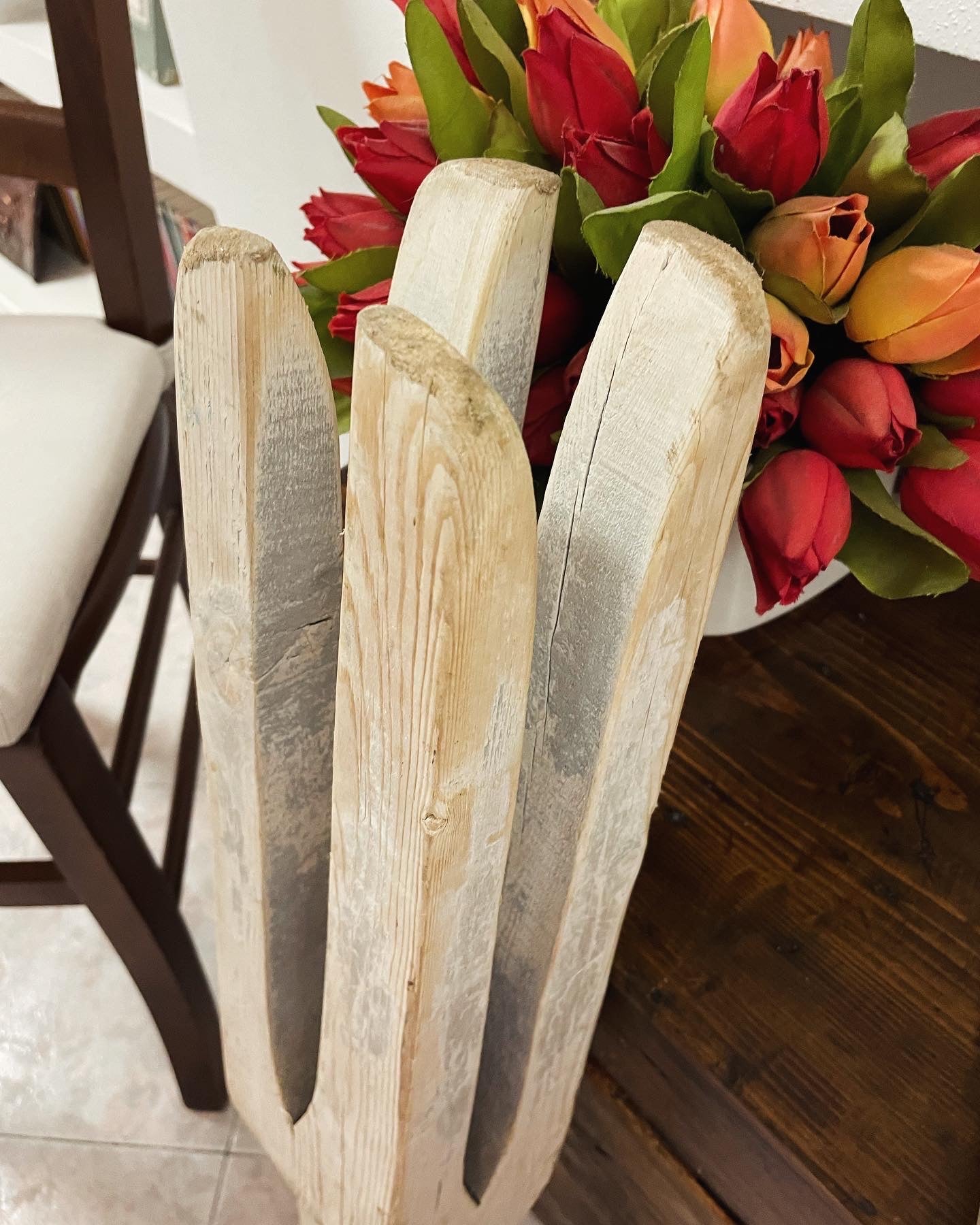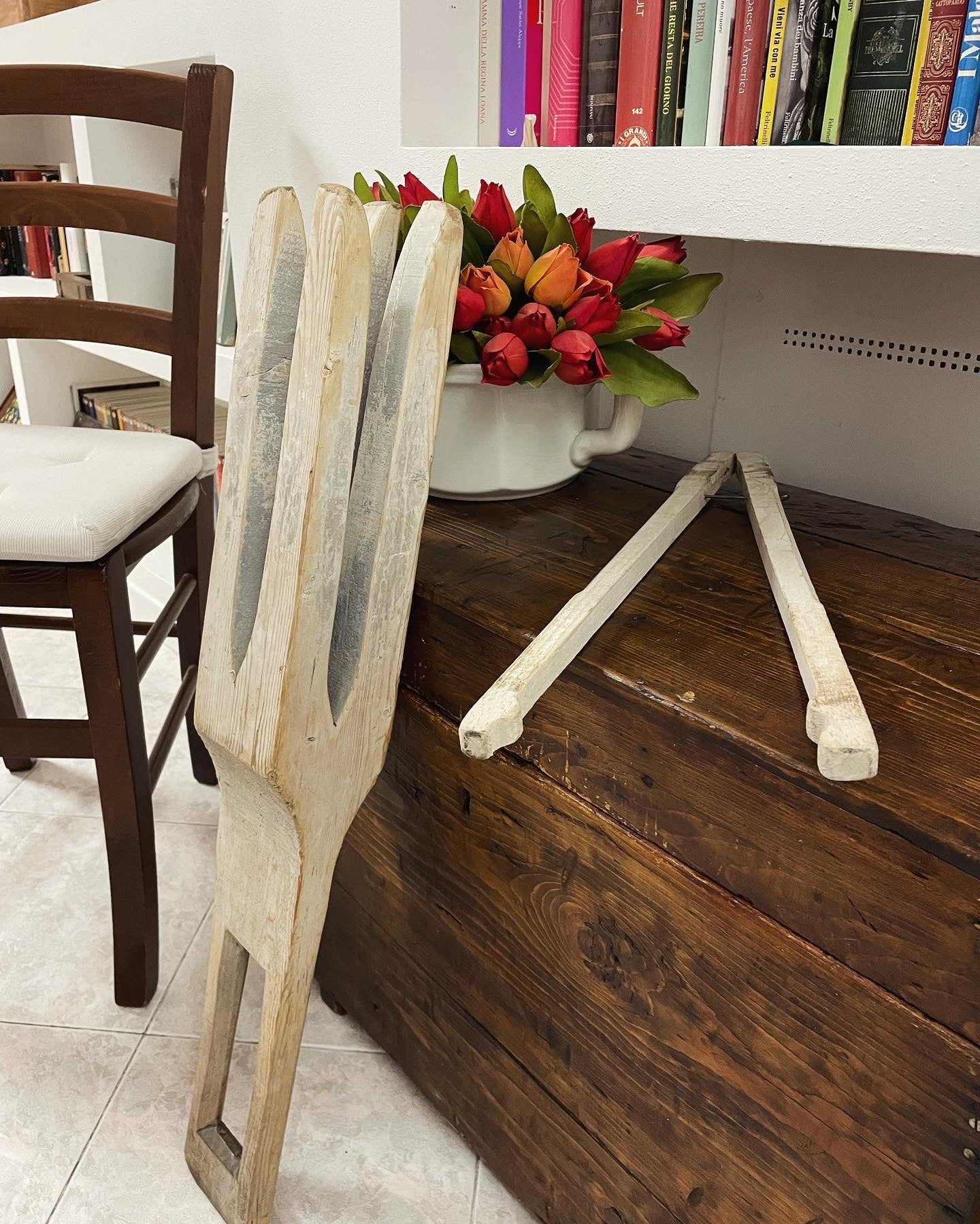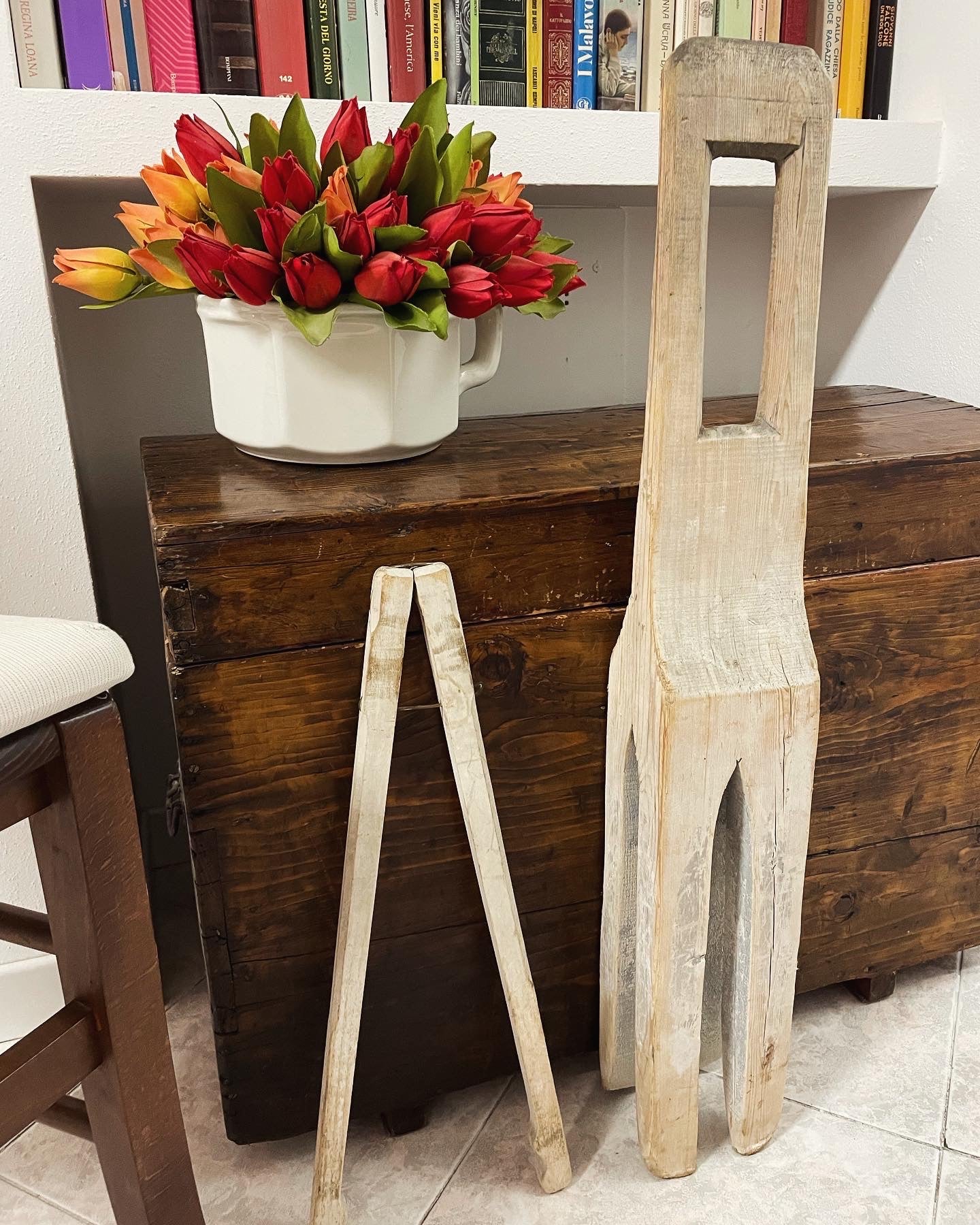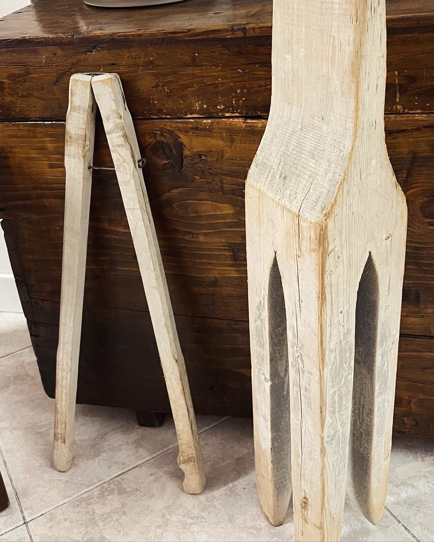 Some objects are so large and so exclusive that they need a known reference: this is why we have displayed them near a chair! So you can realize their size... but above all answer the question: what is it?!? An ancient STIRRER for clothes and relative tongs. Patented in the Victorian era, this model with four wooden arms allowed washerwomen to stir the laundry in boiling water with soda. Bear in mind that it is 81 cm long!! Then, to avoid damaging the skin of the hands due to the chemicals and excessive heat, the clothes were extracted from the large tubs with the appropriate tongs - this example is 48 cm long. The period of the examples on sale is early 1900s; truly beautiful, curious and exclusive furnishing accessories... accompanied by their history, they will enchant your customers and guests.