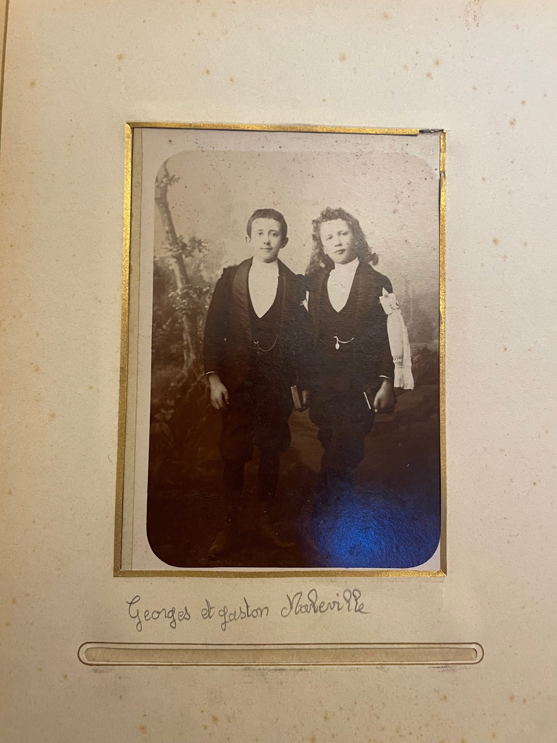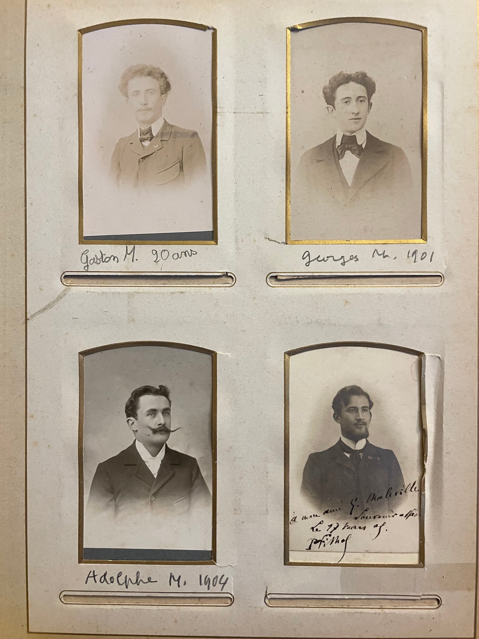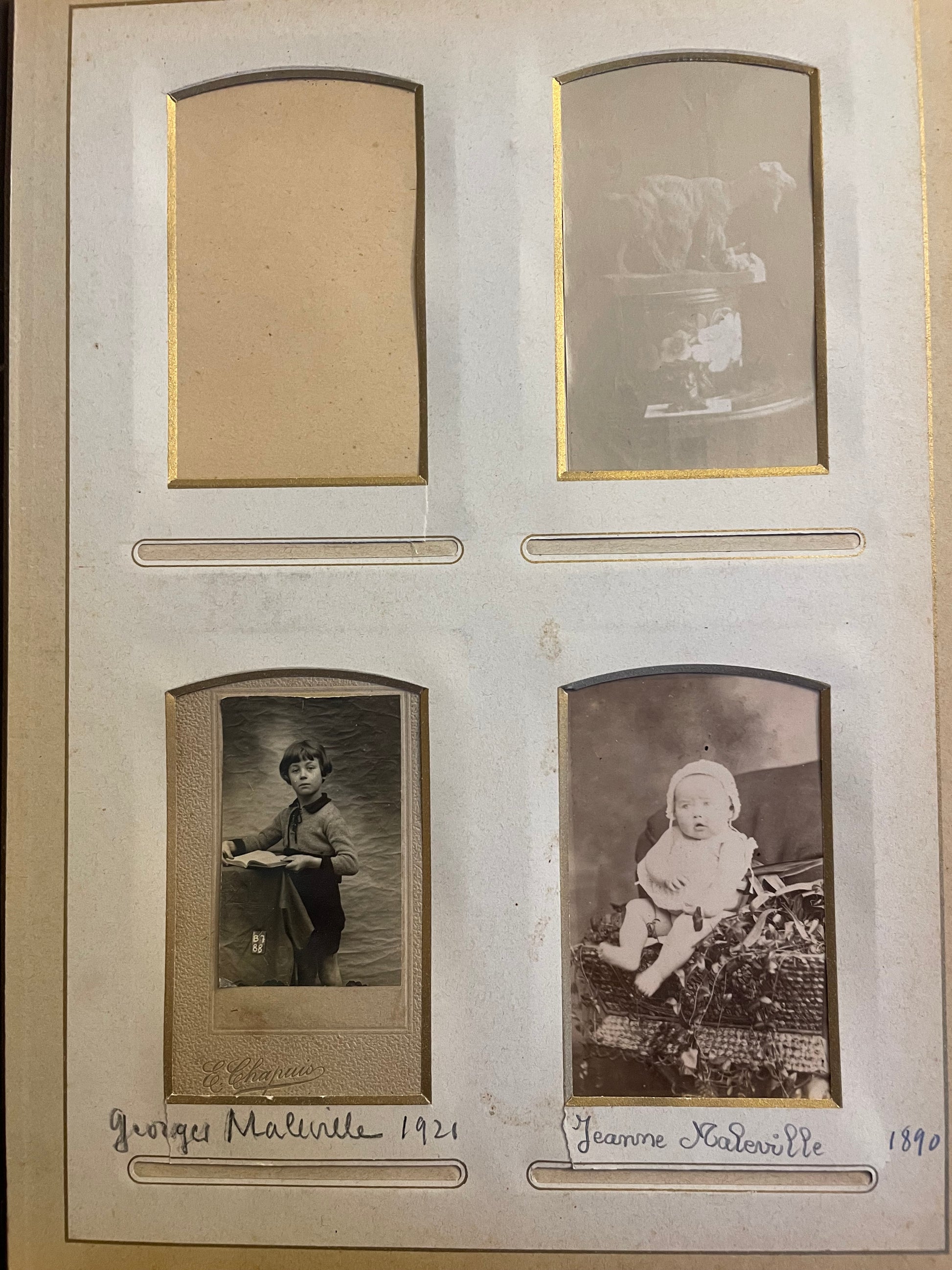 Un album chiuso con cura. Una famiglia intera custodita tra le pagine. Un silenzioso archivio di sguardi e parentele, tracciato con eleganza a matita in una legatura in pelle che conserva ancora la sua chiusura in metallo lavorato perfettamente funzionante. Gli angoli, decorati e solidi, proteggono 19 fotografie originali che ritraggono i membri di una stessa famiglia francese: i Malleville. Ogni immagine è una finestra sulla vita che fu: uomini in divisa, giovani con baffi arricciati, bambini in posa tra drappi e tappeti, nomi scritti con mano decisa. Gaston, Georges, Jeanne, Adolphe… Le date scolpite a matita e le firme d’epoca rendono ogni pagina un frammento autentico di biografia. Un pezzo adatto a collezionisti, appassionati di genealogia o semplicemente a chi ama l’intimità delle storie familiari dimenticate.