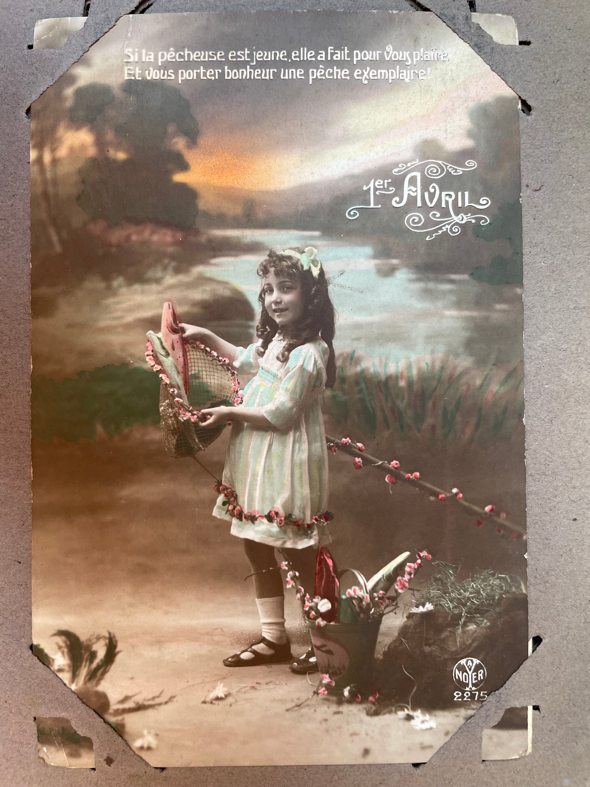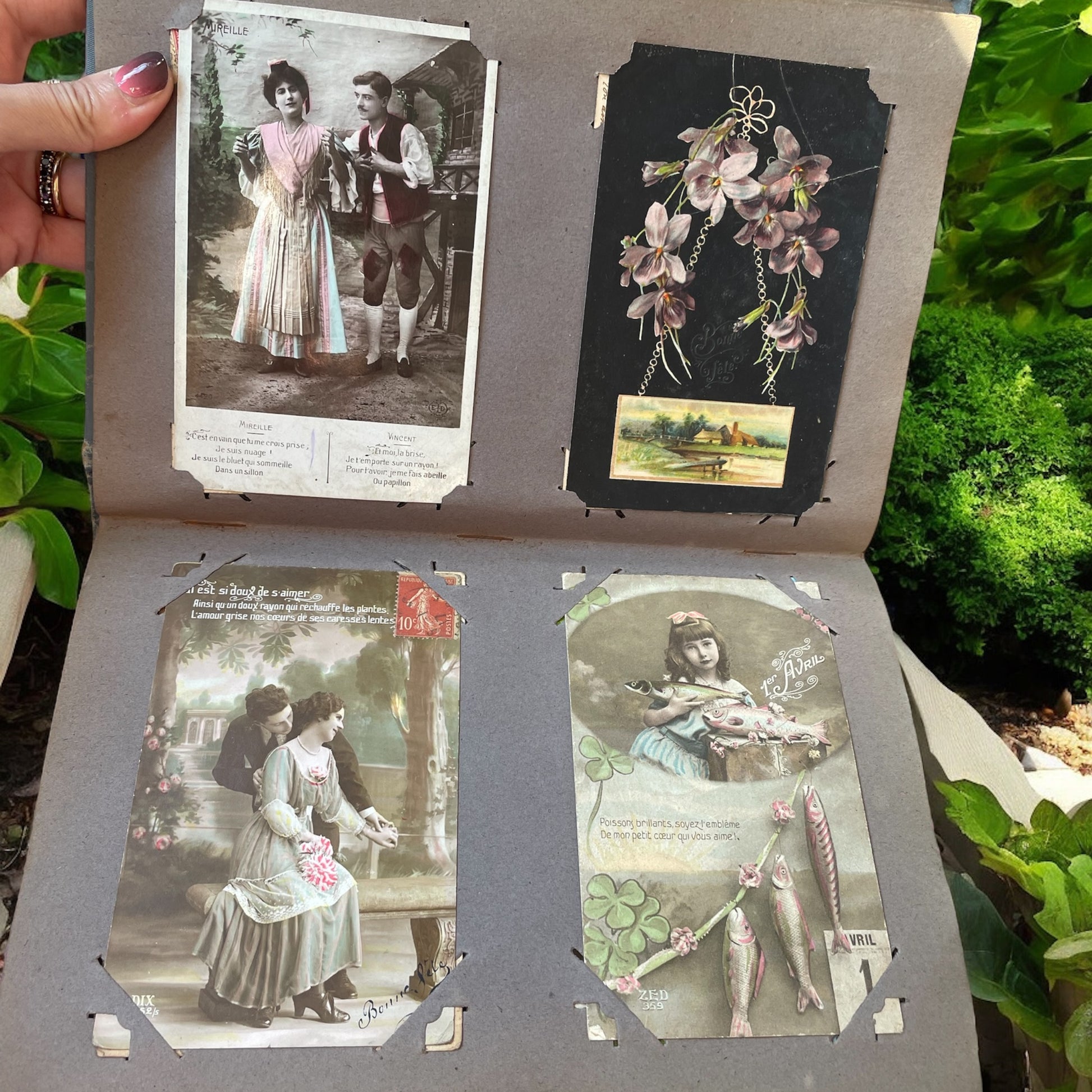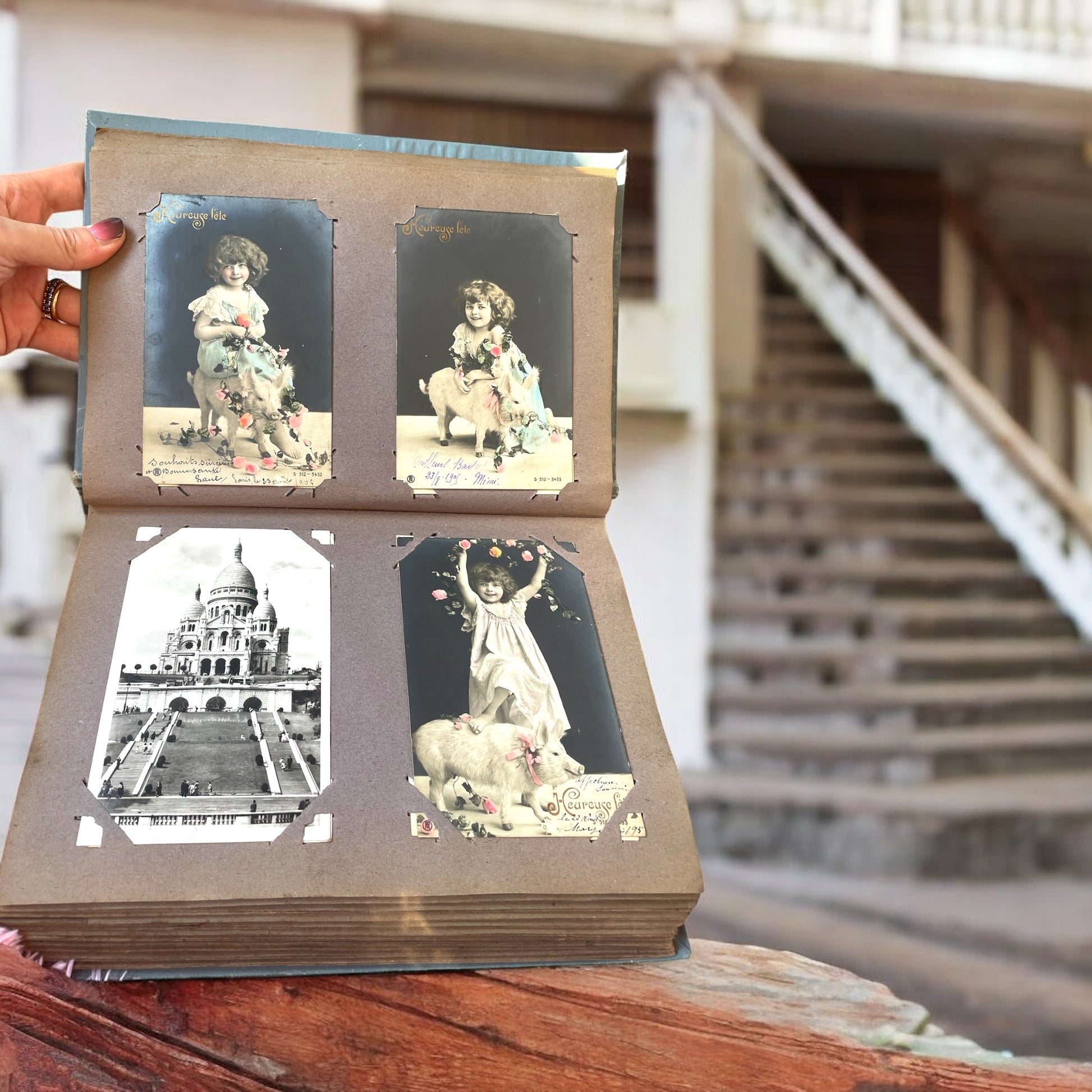 Questo straordinario album custodisce più di 170 cartoline d’epoca, preziosi frammenti di memoria che ci riportano al cuore pulsante della Belle Époque, tra il 1900 e il 1910 per la maggioranza. Ogni cartolina è un piccolo capolavoro, impreziosito da una minuta grafia in francese, che narra gli intrecci di una storia di famiglia ormai lontana, ma ancora vibrante di emozioni. Le cartoline raccontano un viaggio nel tempo, attraverso tipologie diverse, tutte unite da un fil rouge che attraversa la vita della famiglia che le ha raccolte: donne eleganti dai volti sereni, dipinte con colori delicati e fiori che sembrano sbocciare al tocco della luce; bambine sorridenti che posano in scene affettuose, portatrici di auguri e tenerezza; vedute suggestive di luoghi iconici, come il Sacro Cuore di Montmartre, che evocano viaggi, sogni e incontri. Tra queste pagine si nasconde anche la rarità, come le cartoline a tema del pesce d’aprile, un dettaglio che aggiunge un tocco giocoso e unico a questa raccolta. Non sono semplicemente immagini, ma frammenti di vita, biglietti spediti con amore, saluti affettuosi e ricordi condivisi, che si intrecciano in un dialogo silenzioso tra le generazioni. Sfogliare questo album è come immergersi in un racconto visivo e scritto, capace di attraversare il tempo. Non è soltanto una collezione, ma una finestra su un passato che si può quasi toccare, un invito a immaginare la vita, le emozioni e i pensieri di chi, con gesti di cura e affetto, ha custodito ogni singola cartolina. Questo pezzo unico rappresenta una testimonianza storica e artistica, ma soprattutto umana, che saprà incantare collezionisti e amanti della bellezza senza tempo.