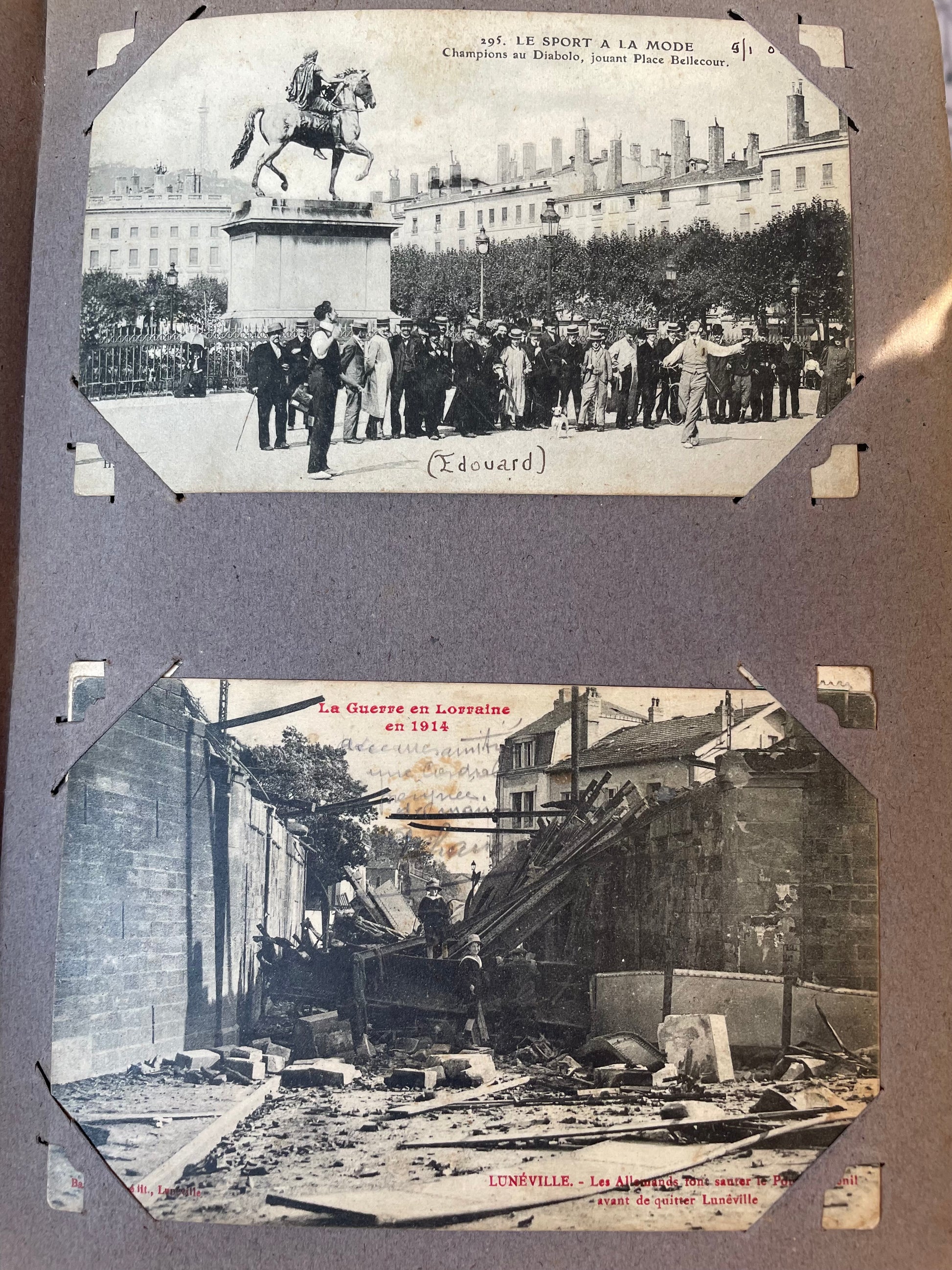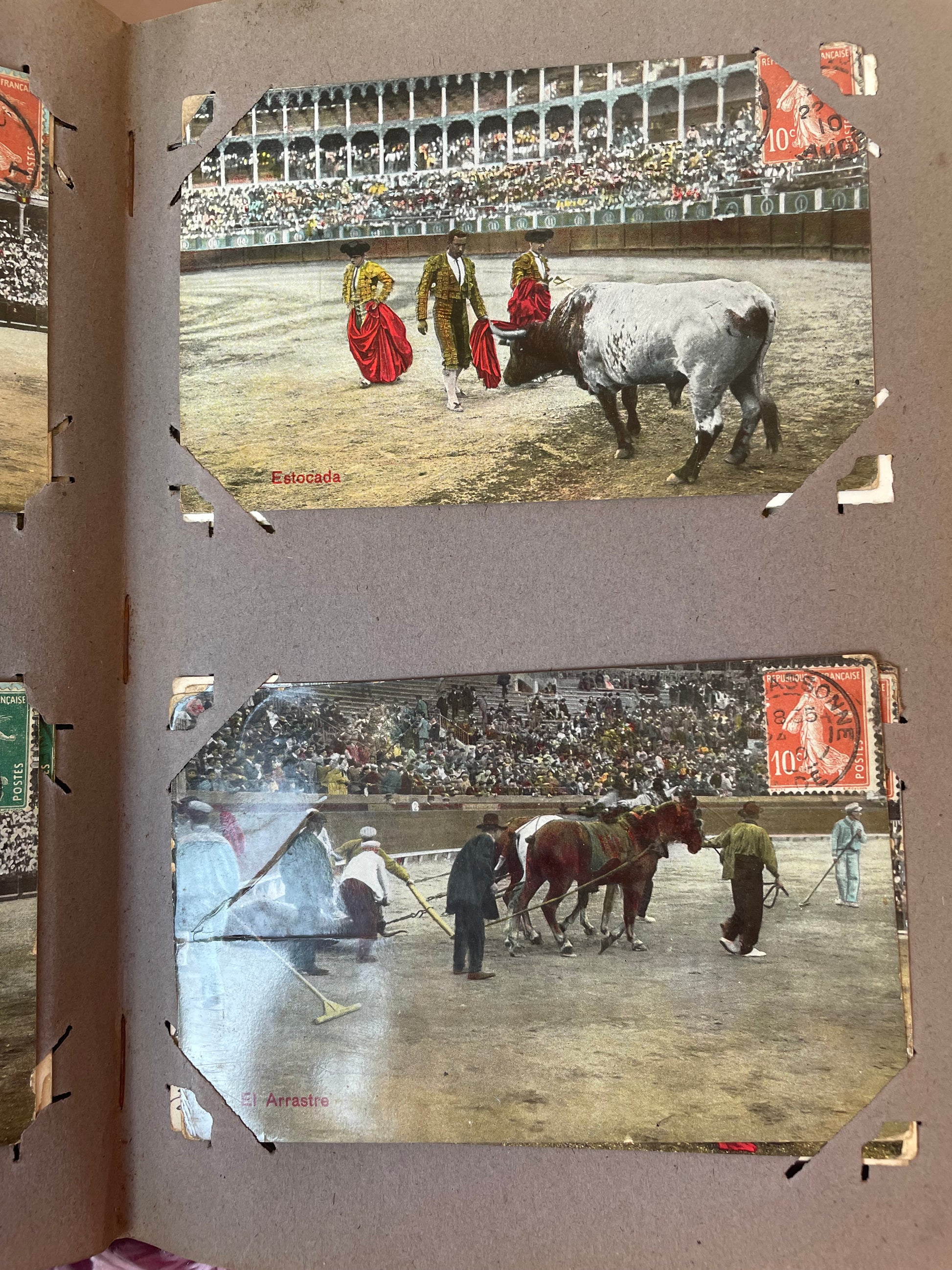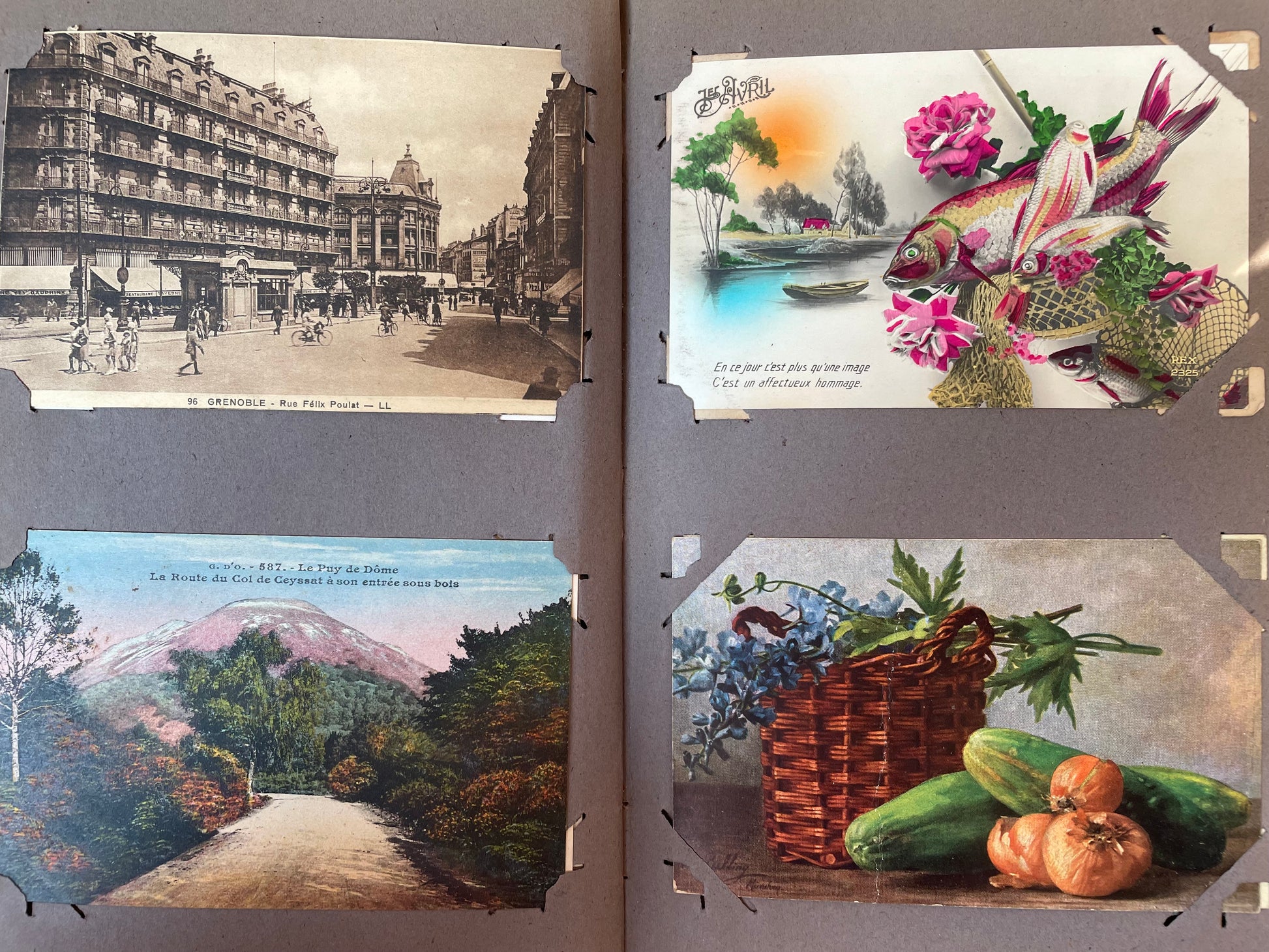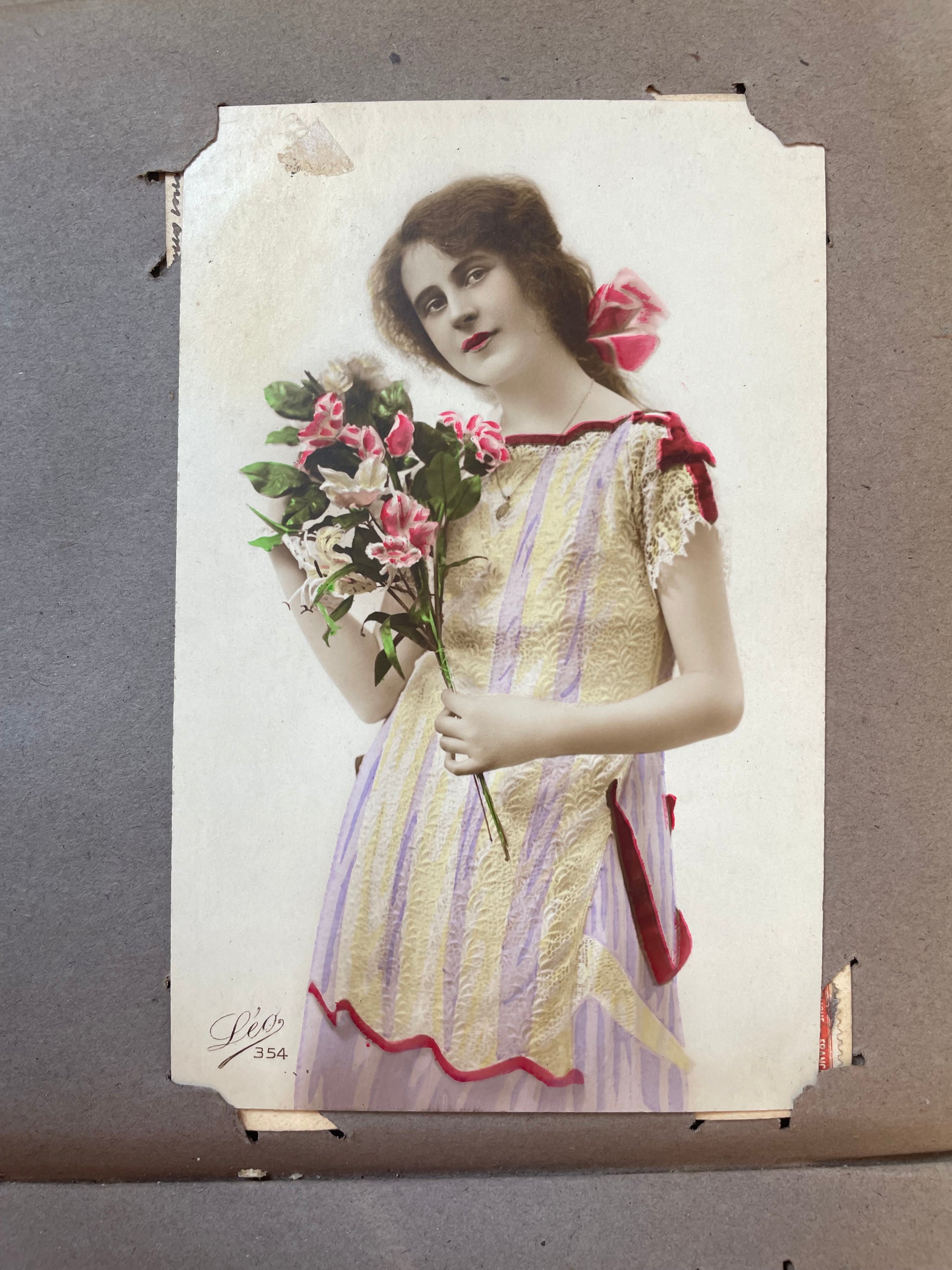Questo straordinario album custodisce più di 170 cartoline d’epoca, preziosi frammenti di memoria che ci riportano al cuore pulsante della Belle Époque, tra il 1900 e il 1910 per la maggioranza. Ogni cartolina è un piccolo capolavoro, impreziosito da una minuta grafia in francese, che narra gli intrecci di una storia di famiglia ormai lontana, ma ancora vibrante di emozioni. Le cartoline raccontano un viaggio nel tempo, attraverso tipologie diverse, tutte unite da un fil rouge che attraversa la vita della famiglia che le ha raccolte: donne eleganti dai volti sereni, dipinte con colori delicati e fiori che sembrano sbocciare al tocco della luce; bambine sorridenti che posano in scene affettuose, portatrici di auguri e tenerezza; vedute suggestive di luoghi iconici, come il Sacro Cuore di Montmartre, che evocano viaggi, sogni e incontri. Tra queste pagine si nasconde anche la rarità, come le cartoline a tema del pesce d’aprile, un dettaglio che aggiunge un tocco giocoso e unico a questa raccolta. Non sono semplicemente immagini, ma frammenti di vita, biglietti spediti con amore, saluti affettuosi e ricordi condivisi, che si intrecciano in un dialogo silenzioso tra le generazioni. Sfogliare questo album è come immergersi in un racconto visivo e scritto, capace di attraversare il tempo. Non è soltanto una collezione, ma una finestra su un passato che si può quasi toccare, un invito a immaginare la vita, le emozioni e i pensieri di chi, con gesti di cura e affetto, ha custodito ogni singola cartolina. Questo pezzo unico rappresenta una testimonianza storica e artistica, ma soprattutto umana, che saprà incantare collezionisti e amanti della bellezza senza tempo.