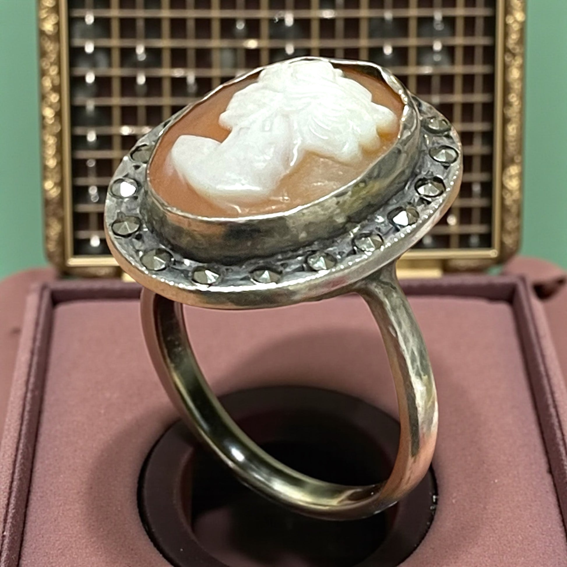 Anello anni ‘40 con cameo conchiglia, argento 800 e marcasiti
