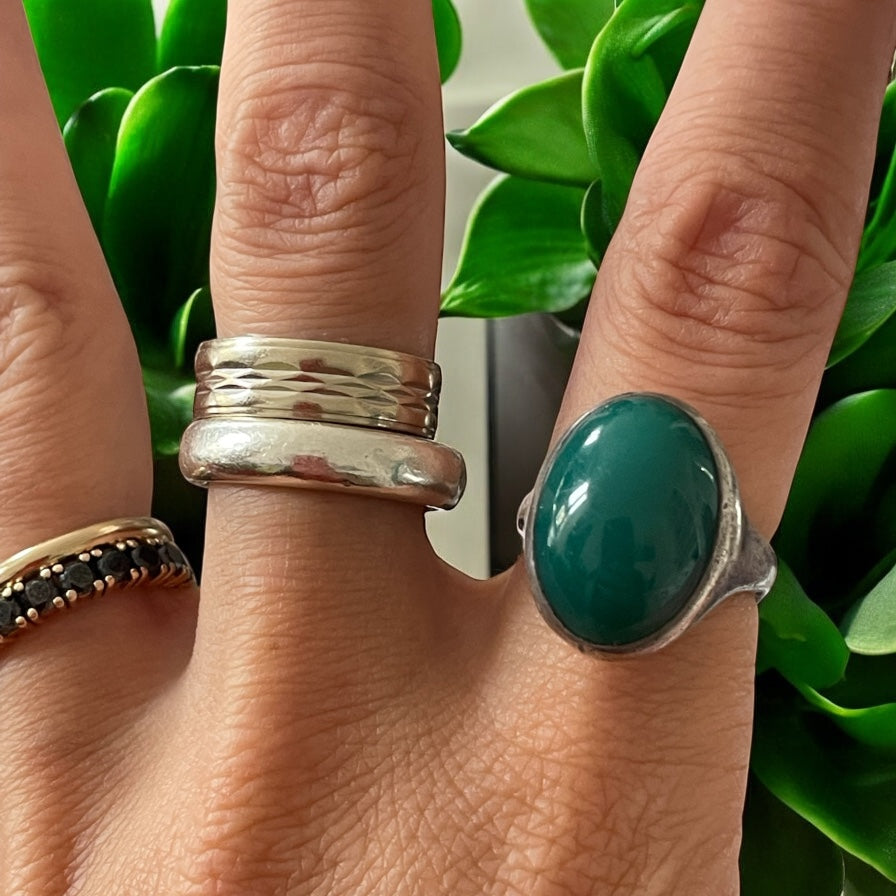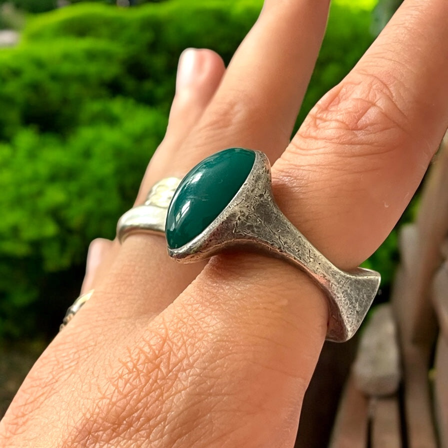 Immaginalo nascere tra le mani esperte di un artigiano in un laboratorio degli anni Settanta, dove il metallo si piegava ancora al fuoco e al gesto, non alla macchina. Ogni linea, ogni curva di questo anello racconta una scelta: niente simmetria perfetta, niente compromessi. Solo materia viva e presenza. È un anello per una donna che sa osare, che non ha paura di catalizzare gli sguardi. Una donna che si muove nello spazio con il passo di chi non chiede permesso, che fa della propria unicità una firma riconoscibile. Le sue dita cercano l’invisibile e lo rendono visibile. Il verde intenso della pietra non è solo una questione di estetica: è un simbolo di rinnovamento, di equilibrio, di forza gentile. È il colore del cuore che sa rimanere aperto, anche dopo le tempeste. Questo non è un anello. È un segnale.
