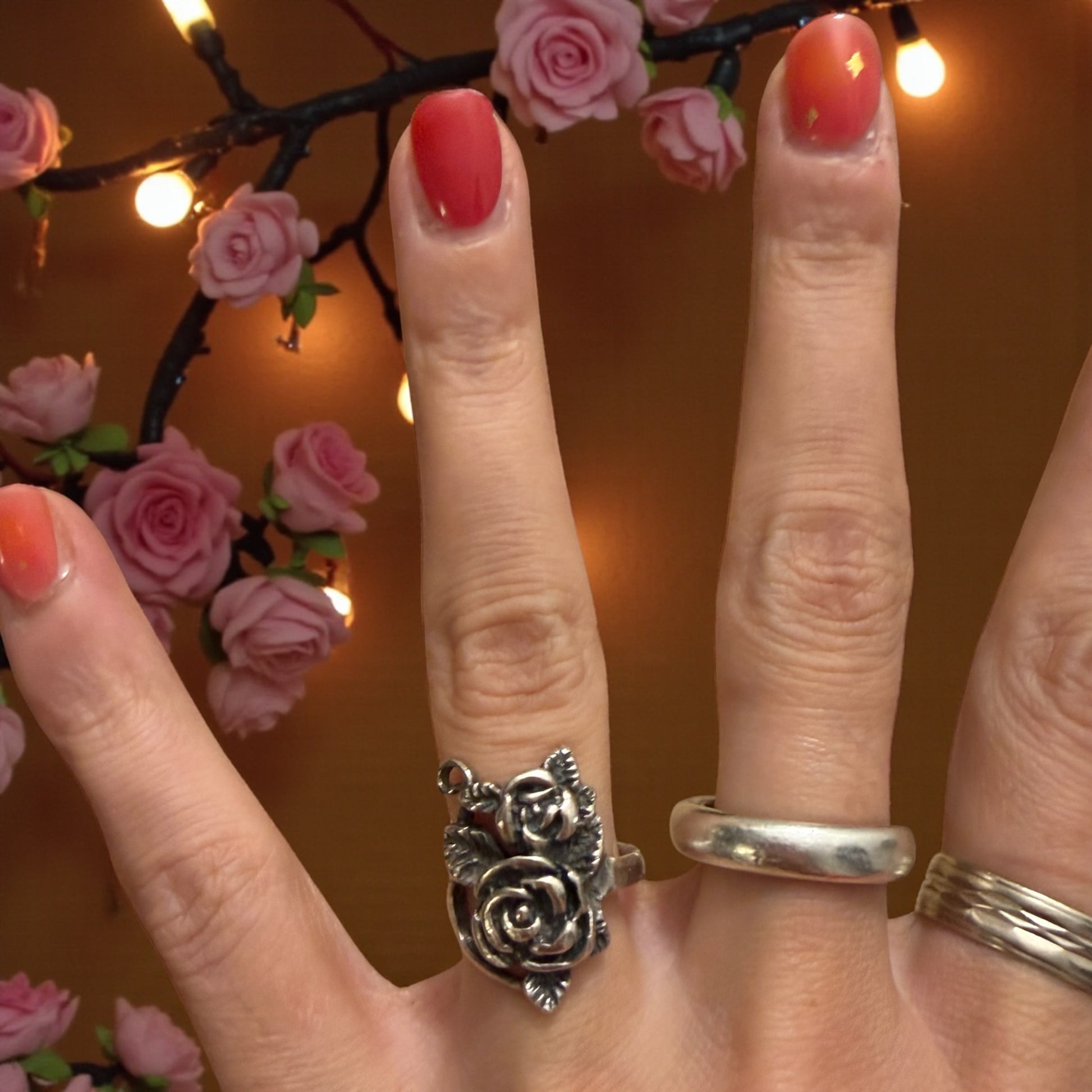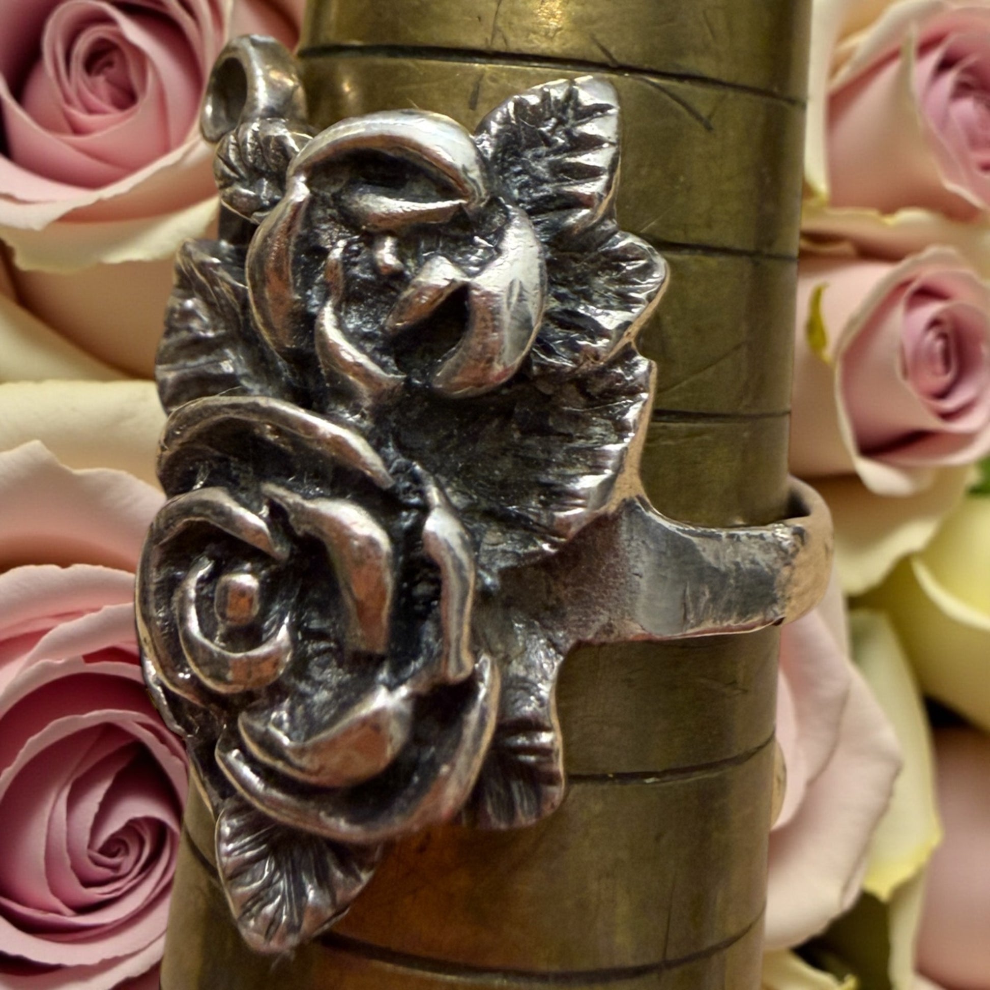 “Stat rosa pristina nomine…”: la rosa antica sopravvive nel nome, eppure continua a fiorire ogni volta che qualcuno la guarda. Questo anello sembrava aspettare proprio questo: uno sguardo nuovo capace di riconoscere il mistero racchiuso nella forma della rosa. Due fiori intrecciati, scolpiti nell’argento come se il metallo fosse diventato un petalo, un soffio, un segno lasciato da mani che conoscevano bene l’arte di evocare ciò che non si può spiegare. La rosa è il più antico simbolo del femminino: fragilità apparente, forza interiore, bellezza che non ha bisogno di essere dimostrata. È l’archetipo della donna che custodisce, che trasforma, che resiste pur rimanendo delicata. In questo anello, la rosa grande accoglie la rosa piccola come un gesto silenzioso di continuità: passato e presente che si s-fiorano. Indossarlo è come portare con sé una memoria che non appartiene solo a chi l’ha posseduto, ma a tutte le donne che la Rosa rappresenta. Ogni volta che la luce accarezza i petali scolpiti, sembra riecheggiare quel verso antico: la rosa antica vive ancora, anche se del suo nome conserviamo solo un’eco. E tu… quale significato daresti alla tua rosa?