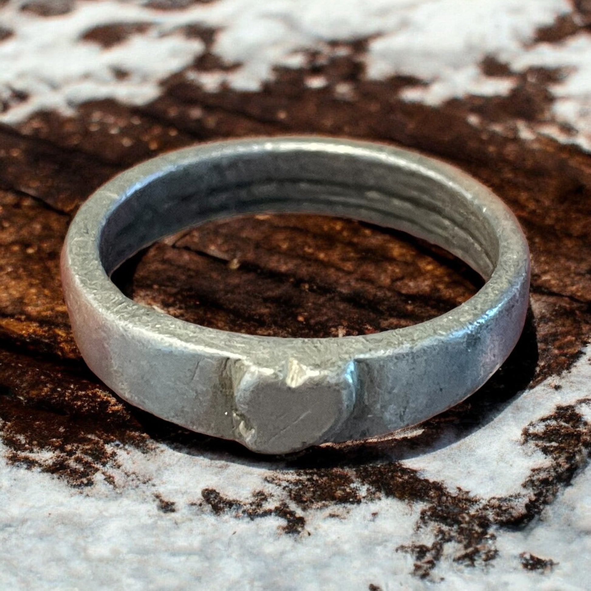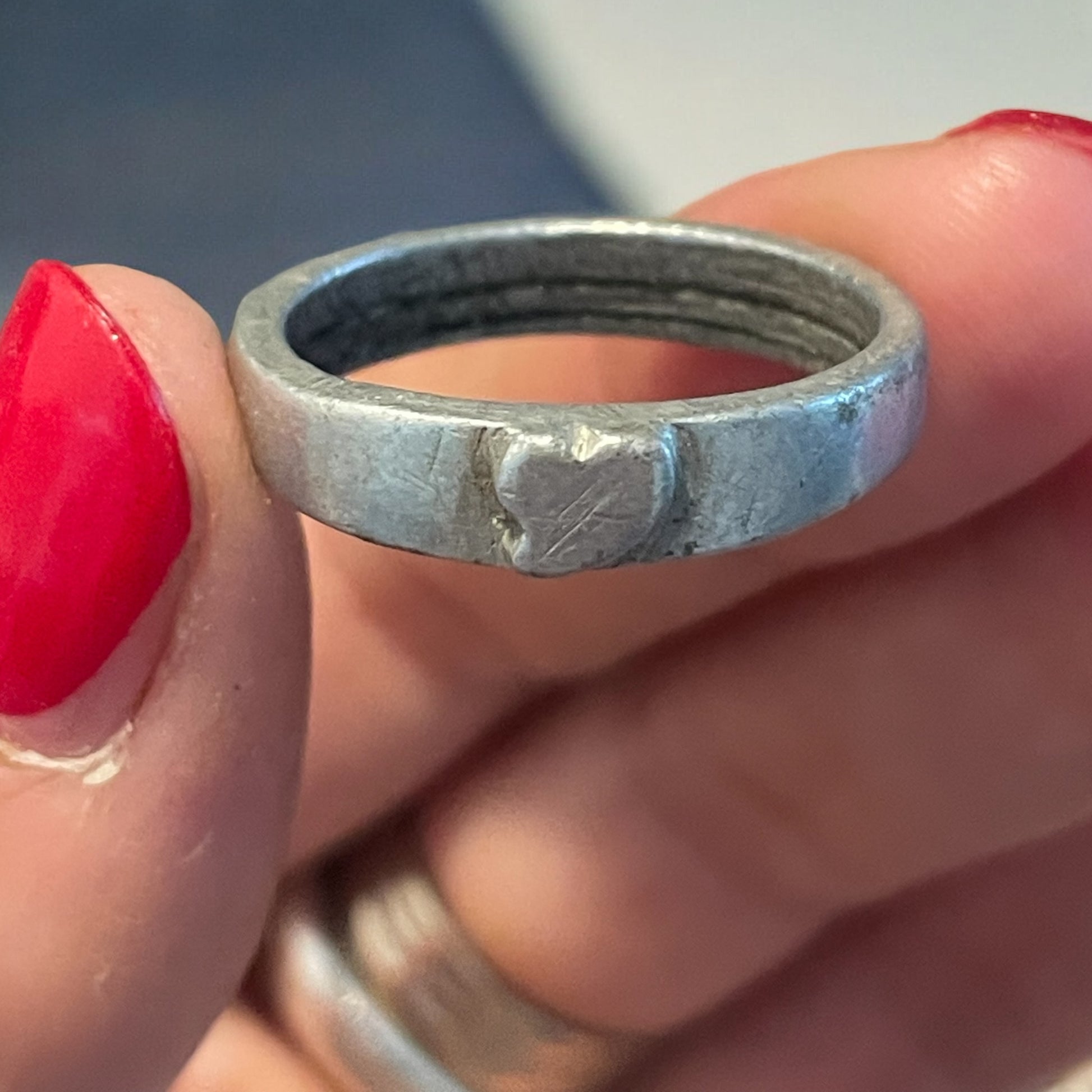 Anello di trincea, Prima Guerra Mondiale. Forgiato a mano con utensili di fortuna da un soldato francese. Metallo povero, simbolo ricco: un cuore inciso per restare umano anche nell’orrore. Misura: diametro interno mm 21-22. Vestibilità adatta anche ad un uomo. Oggetto autentico, emozionalmente incalcolabile.