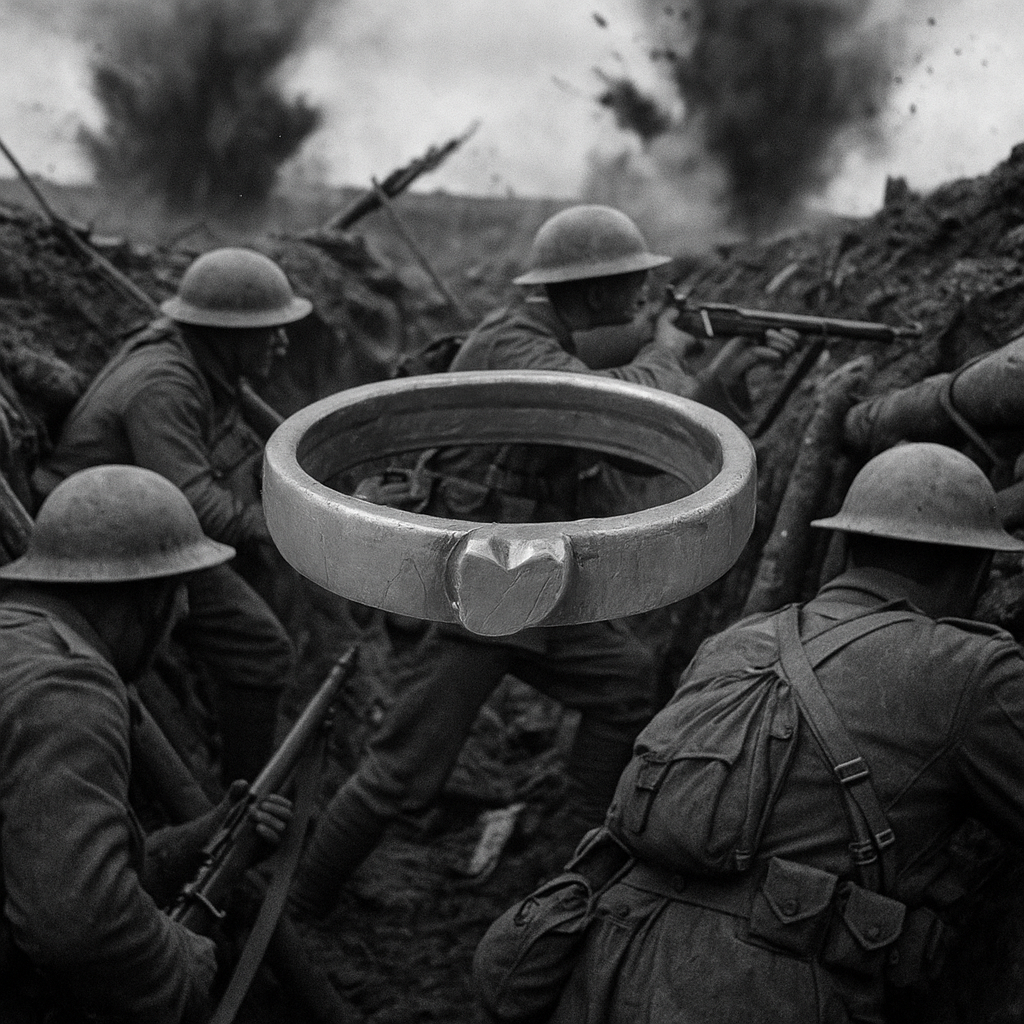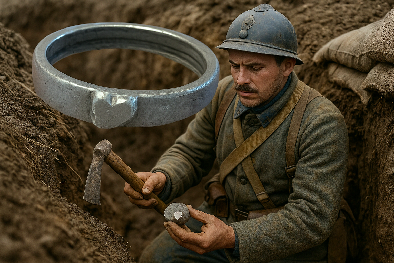 Un soldato, nel fango di una trincea francese, ha trovato un momento di silenzio. Con mani sporche e strumenti improvvisati, ha trasformato un pezzo di metallo recuperato da qualche frammento — forse un proiettile, forse un attrezzo spezzato — in un anello.