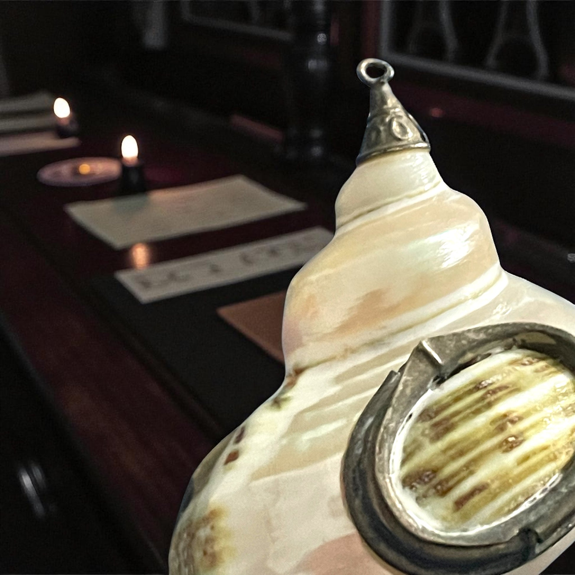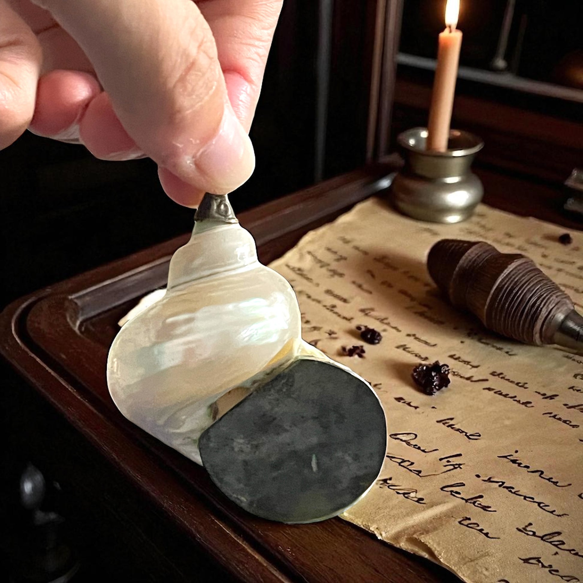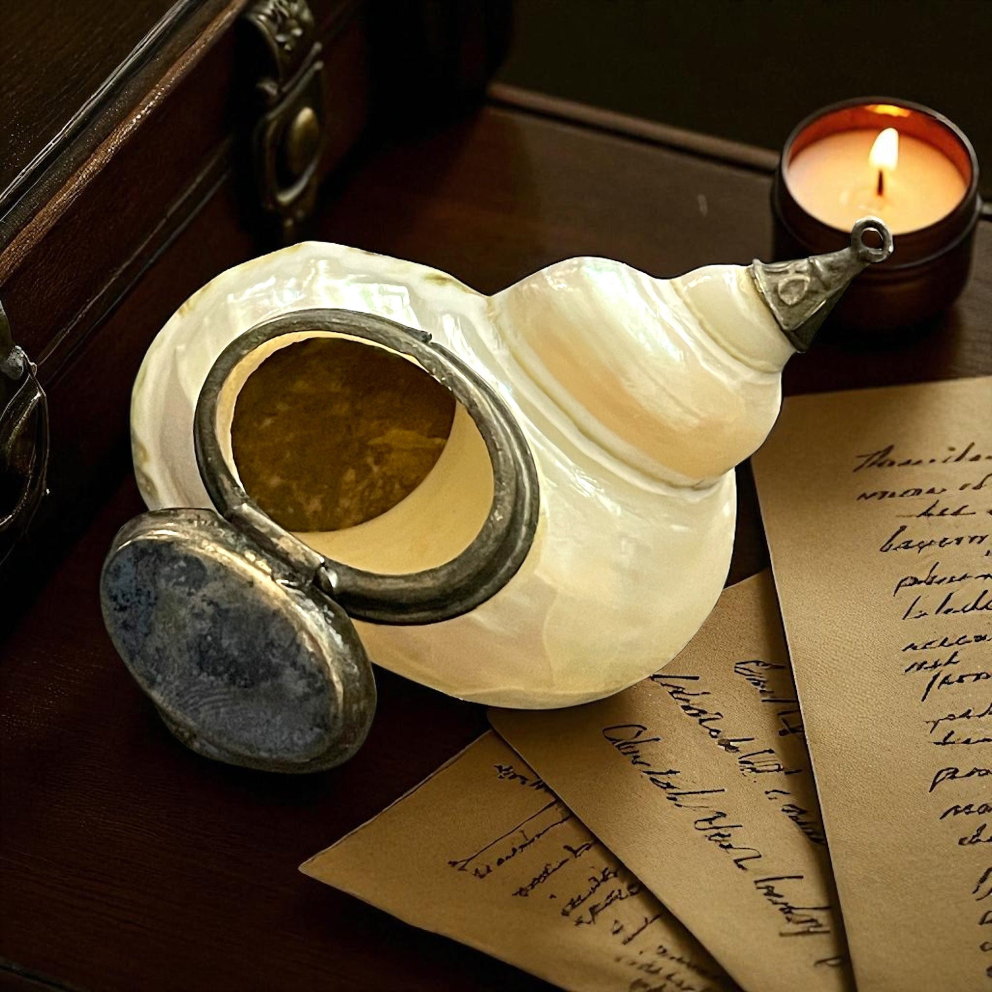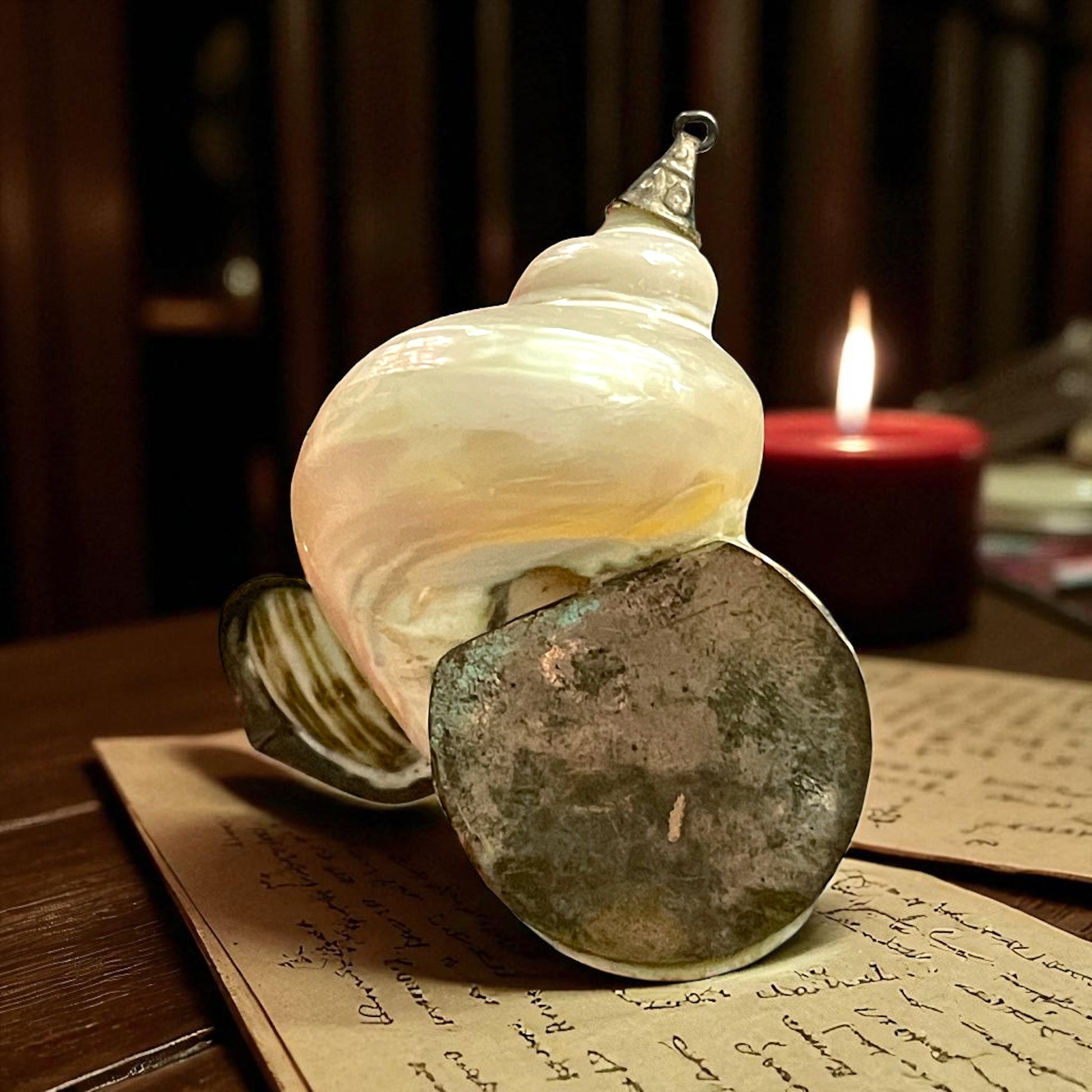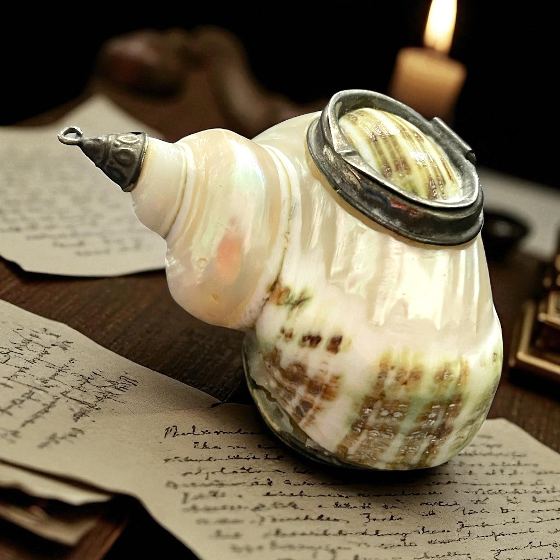 ✨ Una conchiglia, lucida come madreperla, custodisce un segreto. Il guscio marino, simbolo di pellegrinaggio e rinascita, è stato trasformato in un delicato reliquiario portatile. La montatura in metallo, scurita dal tempo, racchiude un vano con coperchio incernierato: vi era custodito un frammento di scapolare, un piccolo segno di protezione e fede da portare sempre con sé. Purtroppo, essendo in carta e molto vecchio, non è sopravvissuto. L’anellino in punta racconta di catene, rosari o nastri a cui restava appeso, vicino al cuore della sua proprietaria. Un oggetto che unisce il mare e il sacro, il viaggio terreno e la speranza spirituale, pronto a narrare ancora la sua silenziosa devozione.