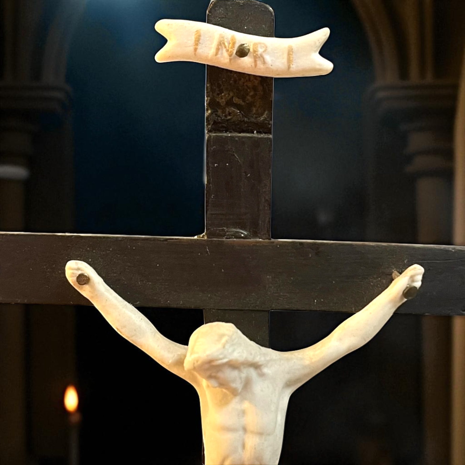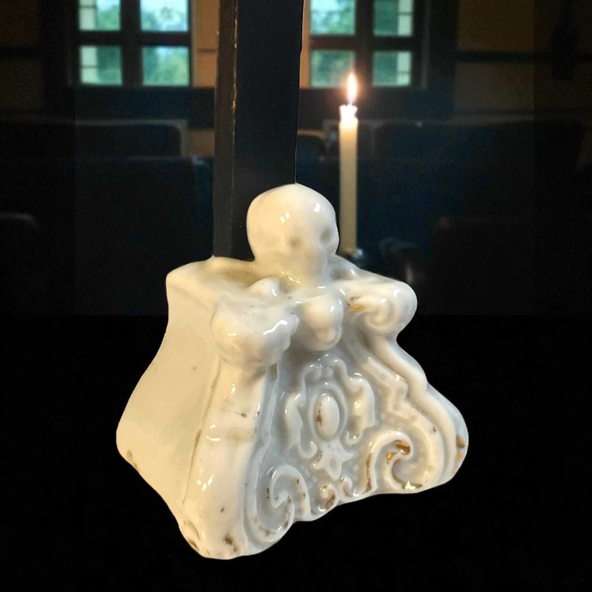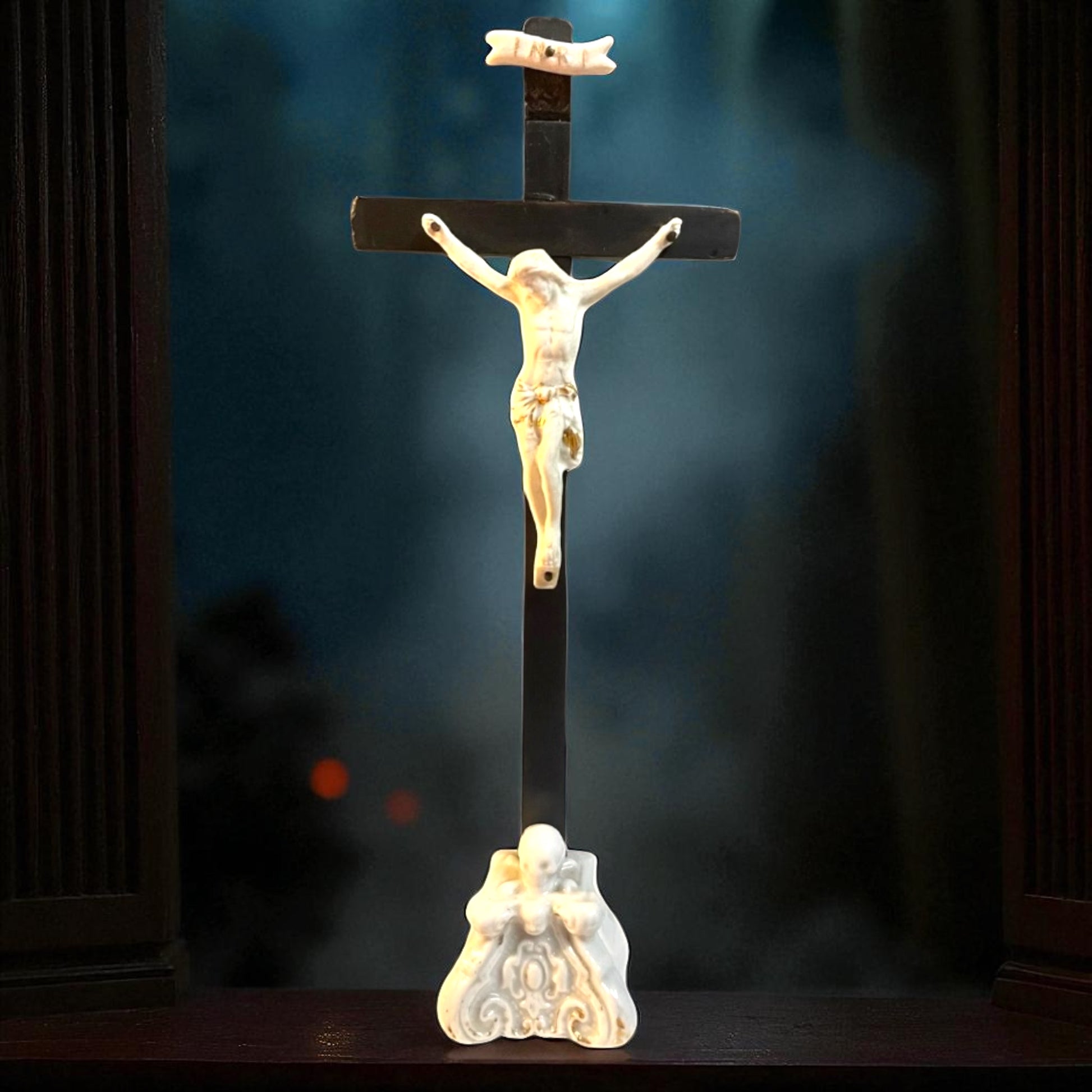 Questa croce antica in legno e ceramica custodisce un simbolismo tanto austero quanto consolante. Alla base, un piccolo teschio scolpito emerge come severo memento mori, eredità di una tradizione medievale che vedeva nel Golgota il sepolcro di Adamo, il primo uomo. È il segno della fragilità della vita, della terra che reclama ogni corpo. Ma subito sotto, quasi sorretto dalle volute dorate, un angelo in preghiera si offre come contrappunto luminoso. Nelle manifatture francesi di Vieux Paris dell’Ottocento, questi accostamenti erano frequenti: un dialogo tra morte e grazia, paura e speranza. Croci come questa venivano poste nelle stanze da letto o negli oratori domestici, per accompagnare la preghiera quotidiana, ammonendo e confortando allo stesso tempo. La croce diventa così un piccolo catechismo visivo: la morte è certa, ma non è l’ultima parola. L’oscurità e la luce convivono, e l’una trova senso solo nell’altra. Iconografia molto rara, circa metà ‘800, qualche segno del tempo. Dimensioni: altezza 25 cm. Base rifissata in epoca successiva mediante vitina.