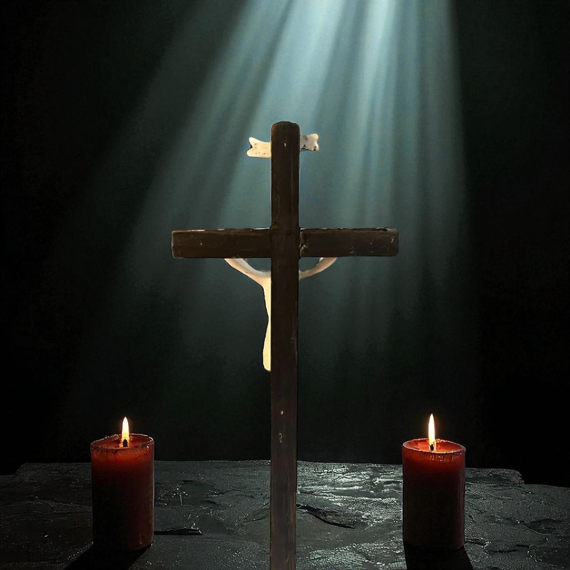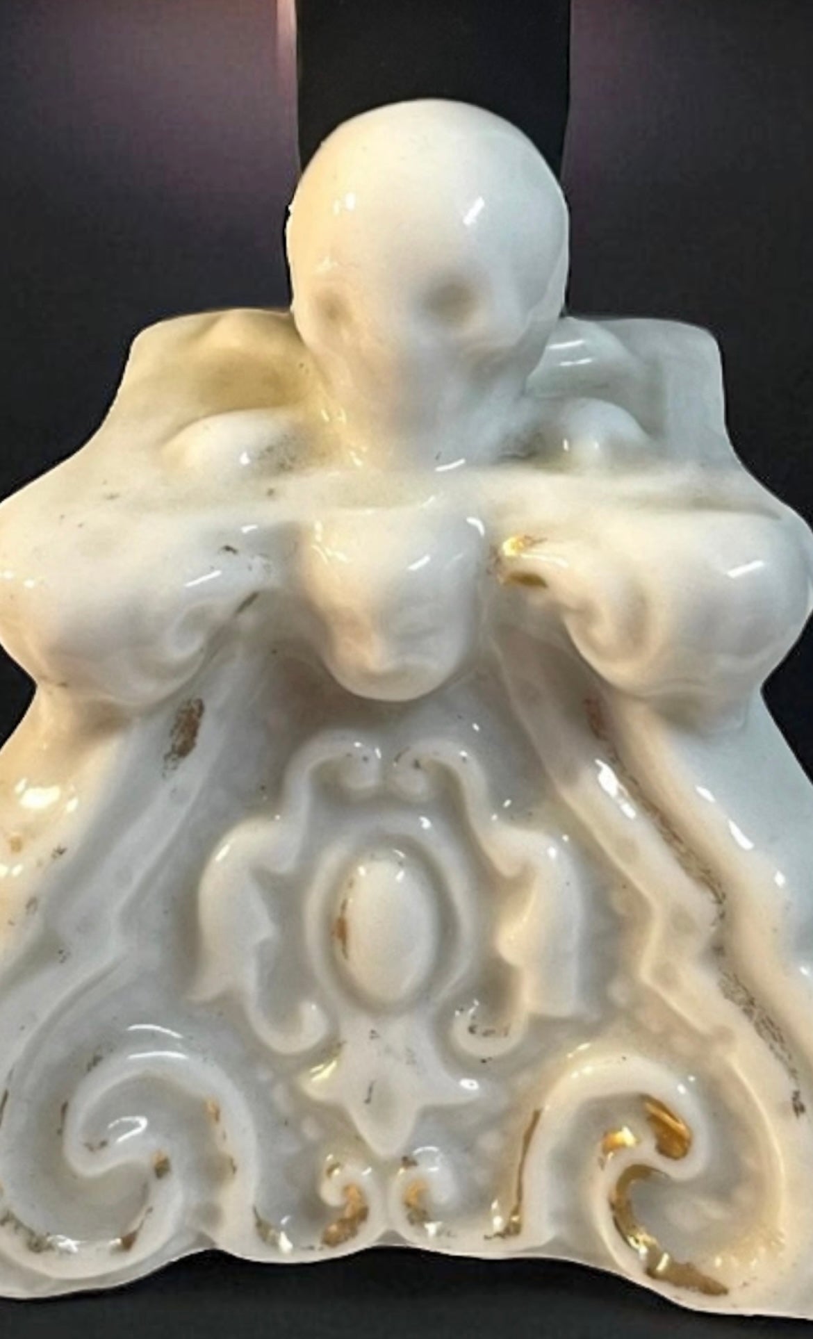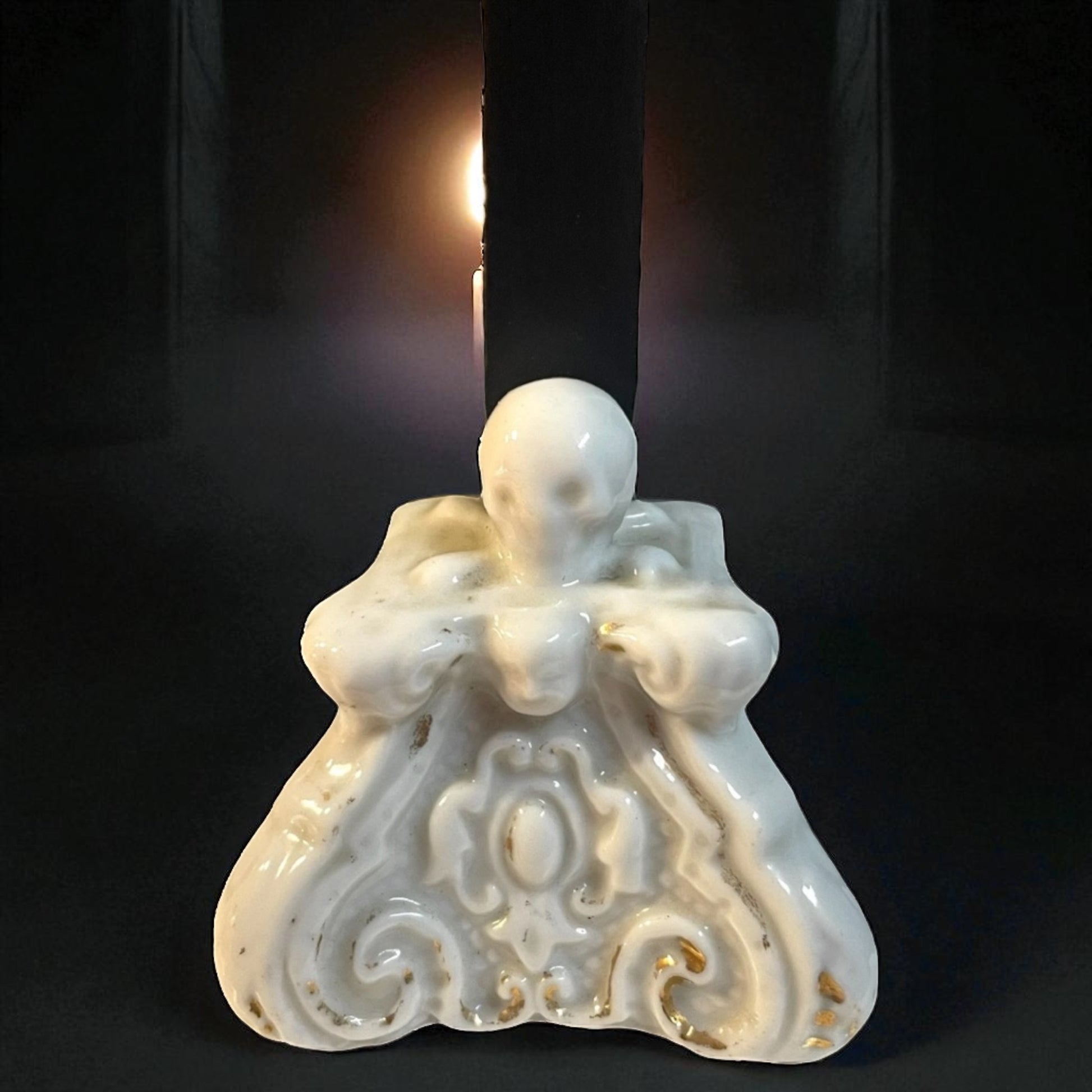 Questa croce antica in legno e ceramica custodisce un simbolismo tanto austero quanto consolante. Alla base, un piccolo teschio scolpito emerge come severo memento mori, eredità di una tradizione medievale che vedeva nel Golgota il sepolcro di Adamo, il primo uomo. È il segno della fragilità della vita, della terra che reclama ogni corpo. Ma subito sotto, quasi sorretto dalle volute dorate, un angelo in preghiera si offre come contrappunto luminoso. Nelle manifatture francesi di Vieux Paris dell’Ottocento, questi accostamenti erano frequenti: un dialogo tra morte e grazia, paura e speranza. Croci come questa venivano poste nelle stanze da letto o negli oratori domestici, per accompagnare la preghiera quotidiana, ammonendo e confortando allo stesso tempo. La croce diventa così un piccolo catechismo visivo: la morte è certa, ma non è l’ultima parola. L’oscurità e la luce convivono, e l’una trova senso solo nell’altra. Iconografia molto rara, circa metà ‘800, qualche segno del tempo. Dimensioni: altezza 25 cm. Base rifissata in epoca successiva mediante vitina.