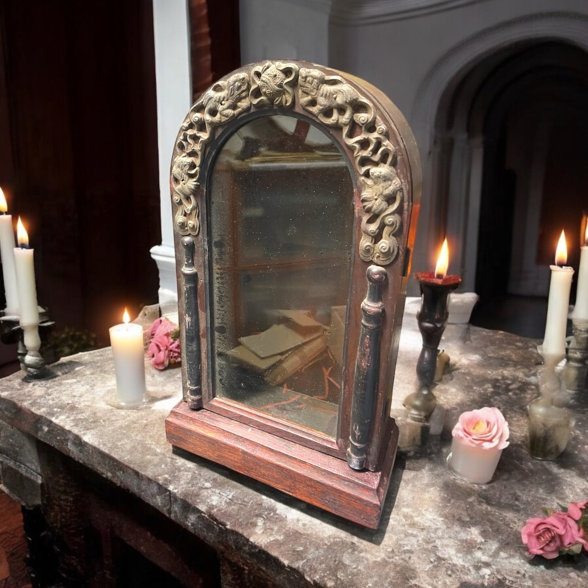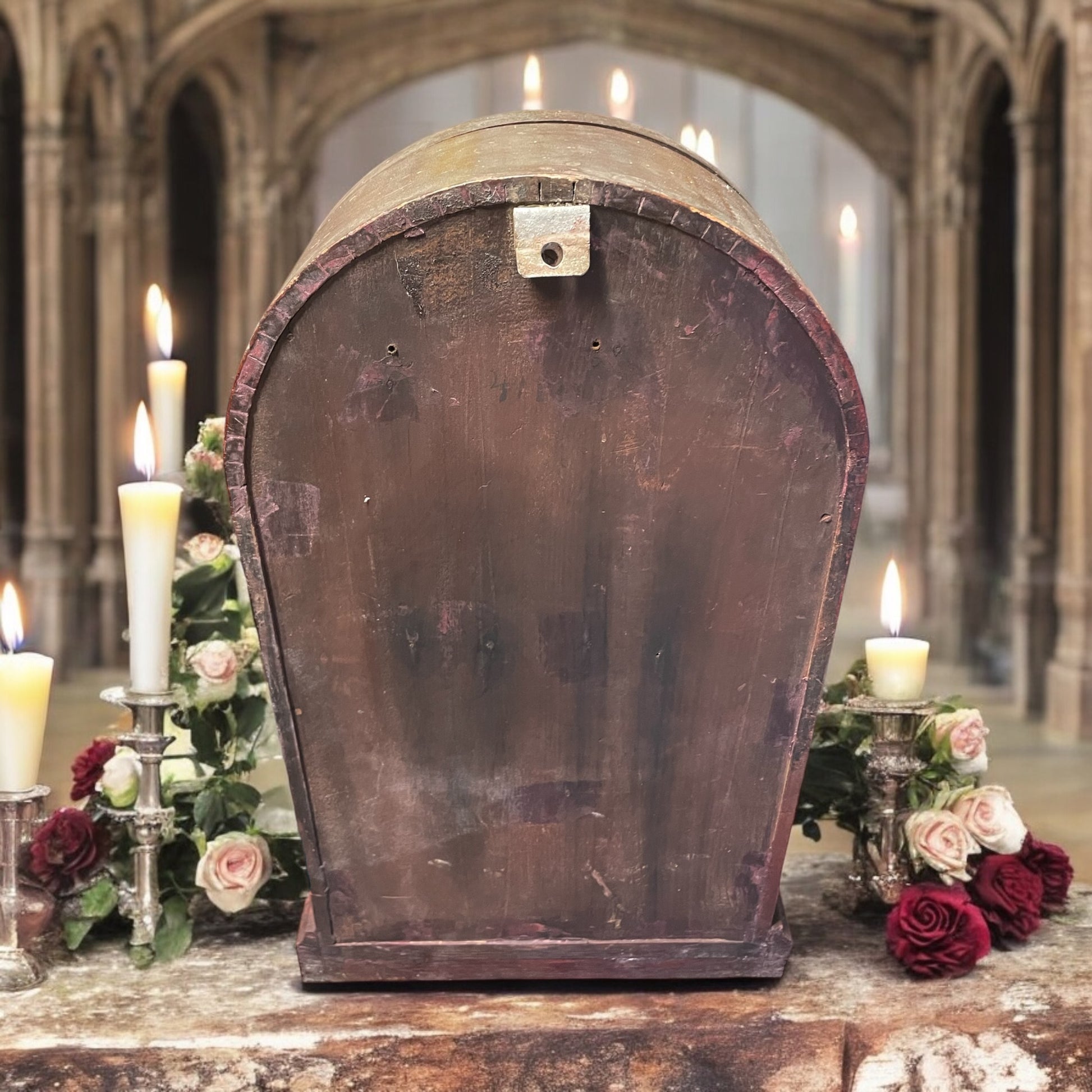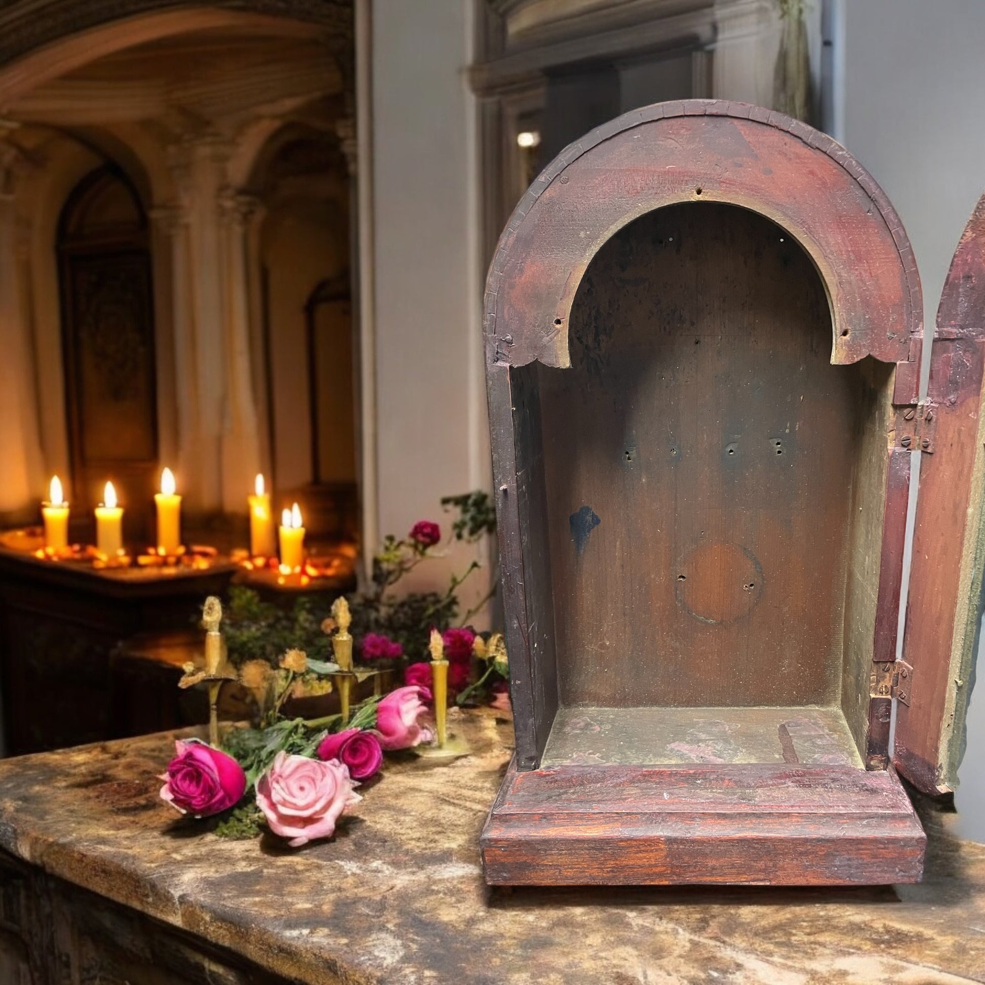 Raro e affascinante ritiro da una dimora olandese chiusa da anni: antica edicola in legno con fregi e colonnine, vetro intatto, chiusura con piccolo gancio funzionante. Un oggetto che ha decisamente fascino da vendere e anche molto mistero, dal momento che non abbiamo ritrovato il contenuto. Bella patina, dimensioni: 43.4 x 33.5 profondità 10.5 cm.