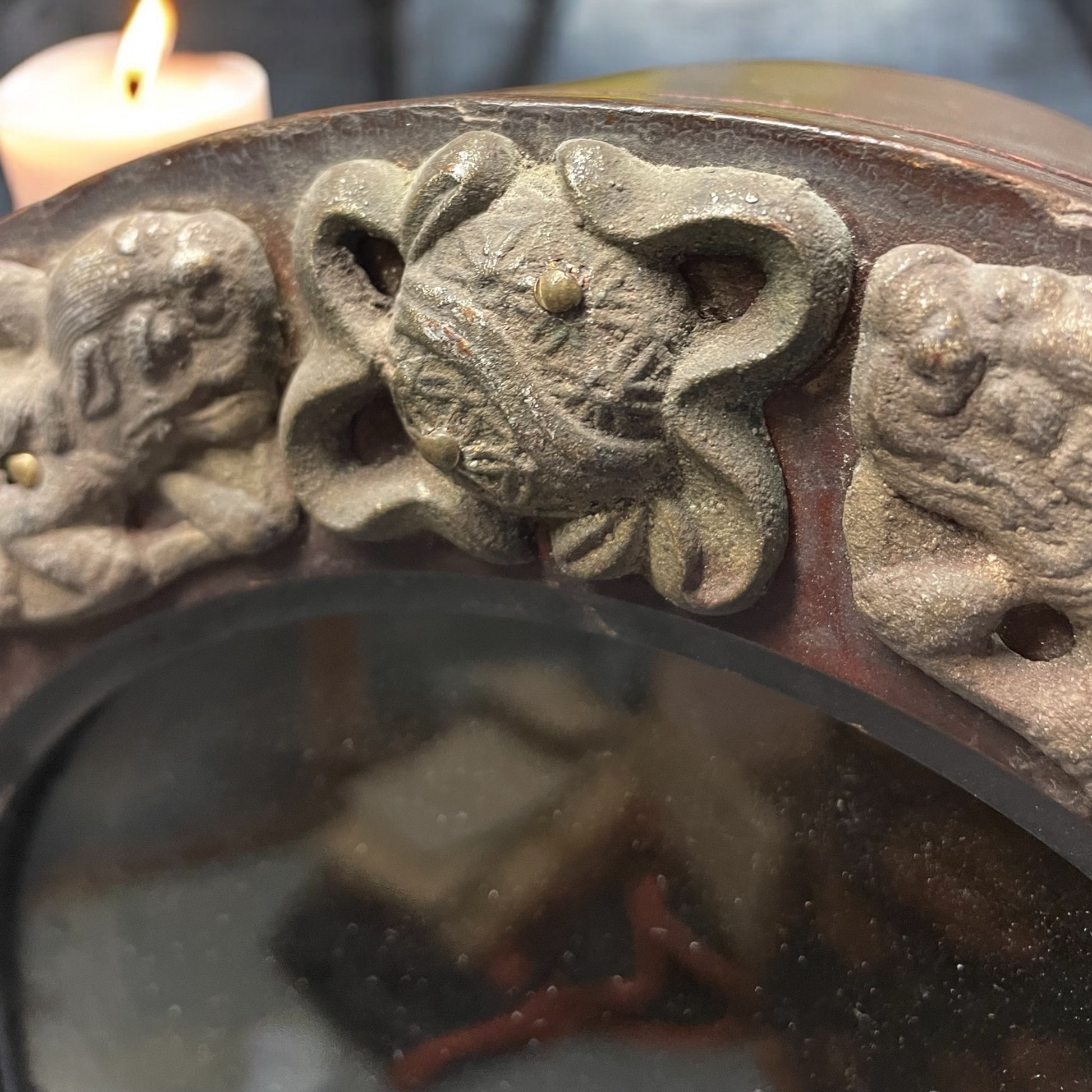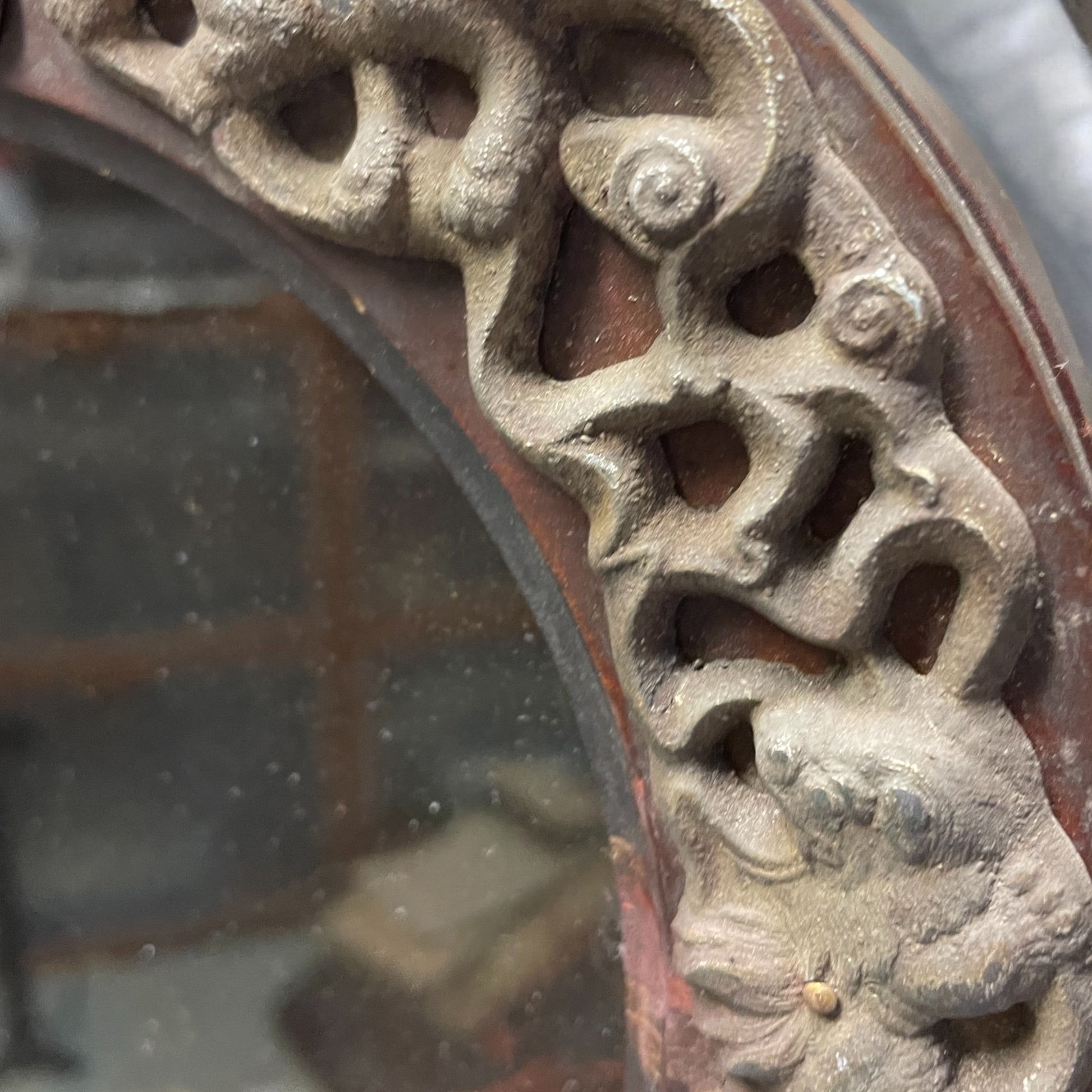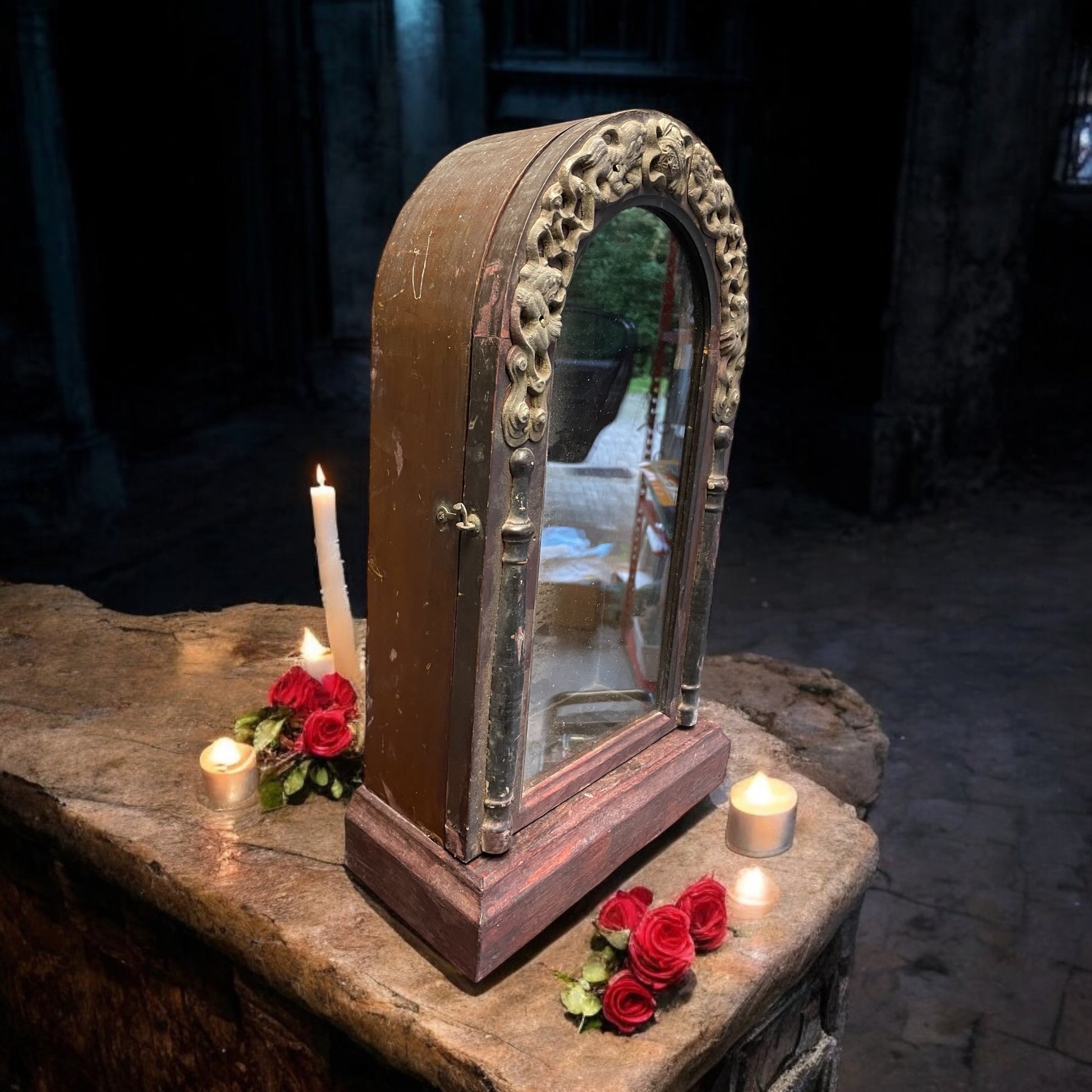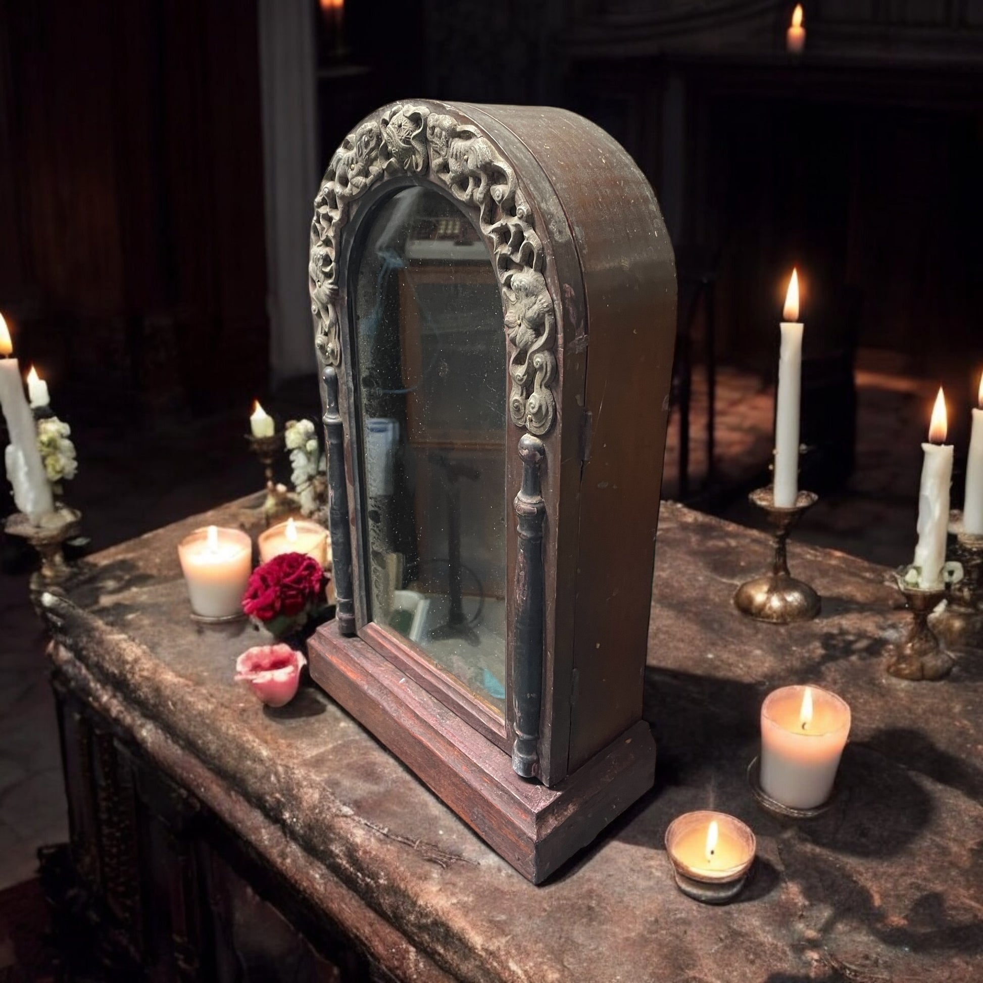 Raro e affascinante ritiro da una dimora olandese chiusa da anni: antica edicola in legno con fregi e colonnine, vetro intatto, chiusura con piccolo gancio funzionante. Un oggetto che ha decisamente fascino da vendere e anche molto mistero, dal momento che non abbiamo ritrovato il contenuto. Bella patina, dimensioni: 43.4 x 33.5 profondità 10.5 cm.