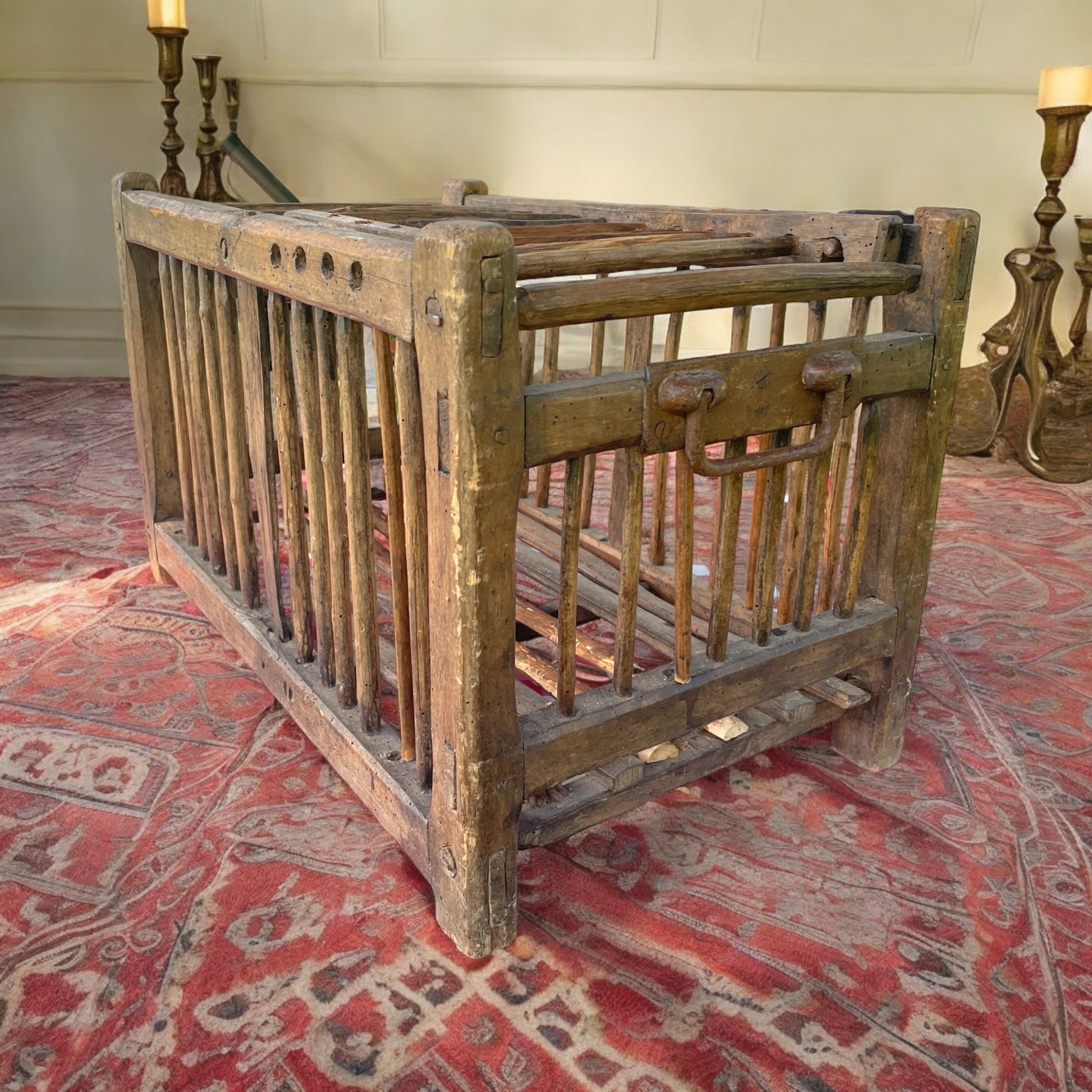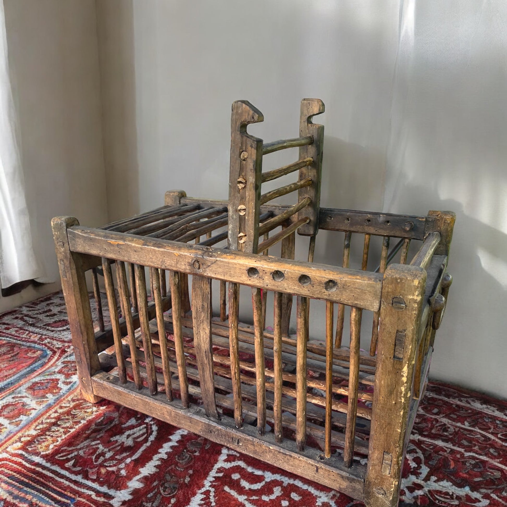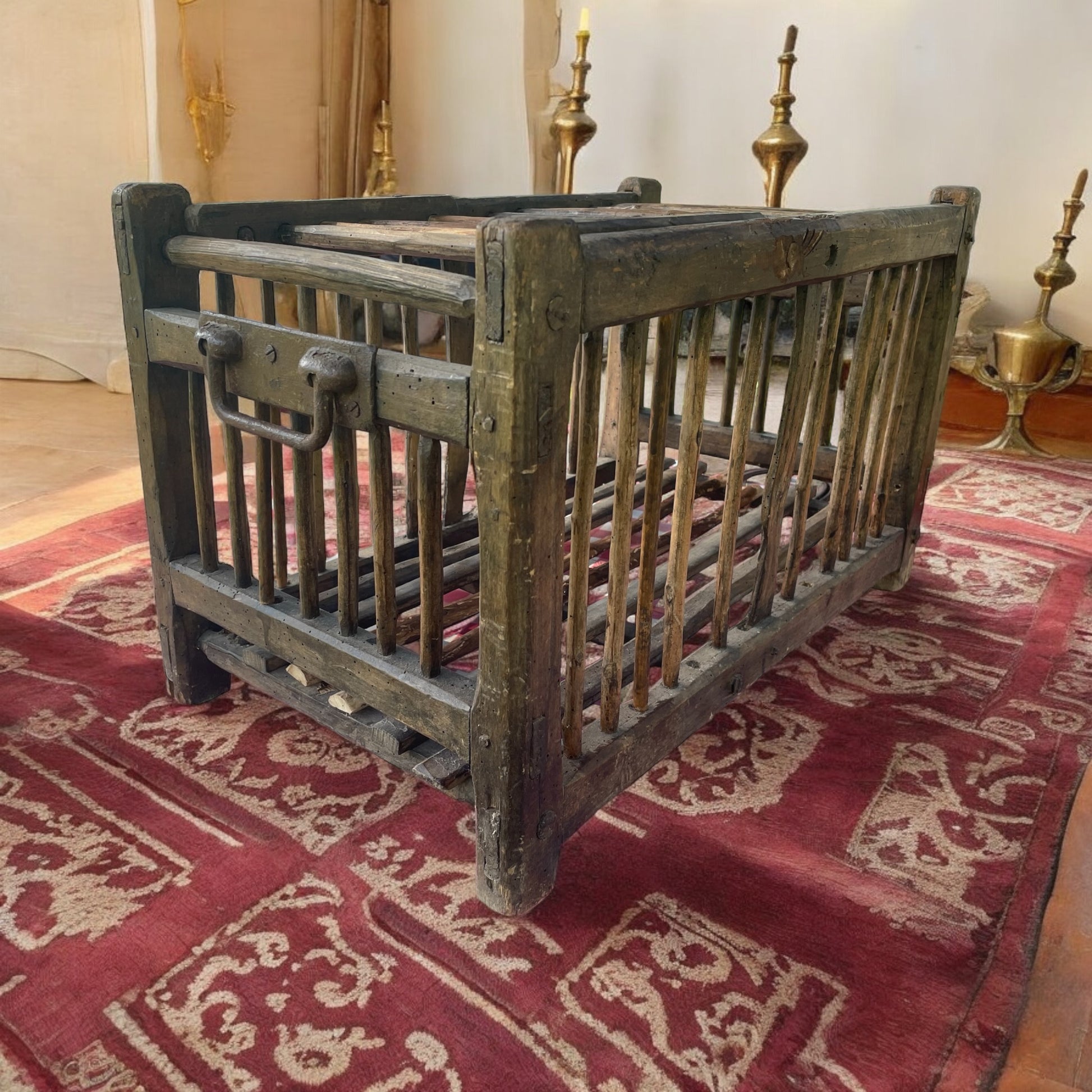 …we picked up this beautiful old cage from a Dutch country house, made with so much love and all by hand. The iron handles on the sides are enchanting, as is the upper opening. All made with turned twigs. It was certainly the home of a little creature much loved, probably this little house was created by a father for his little girl or boy and his pet. It has been cleaned, two strips at the bottom have been replaced, anti-woodworm done. Versatile to use, as we have interpreted it, as a magazine rack enhanced by an old carpet. Dimensions: 51 x 31 height 30