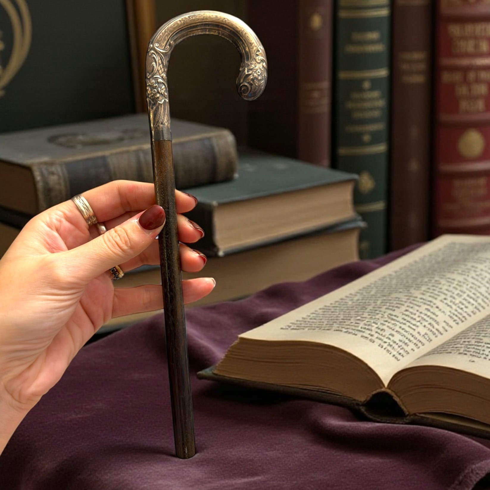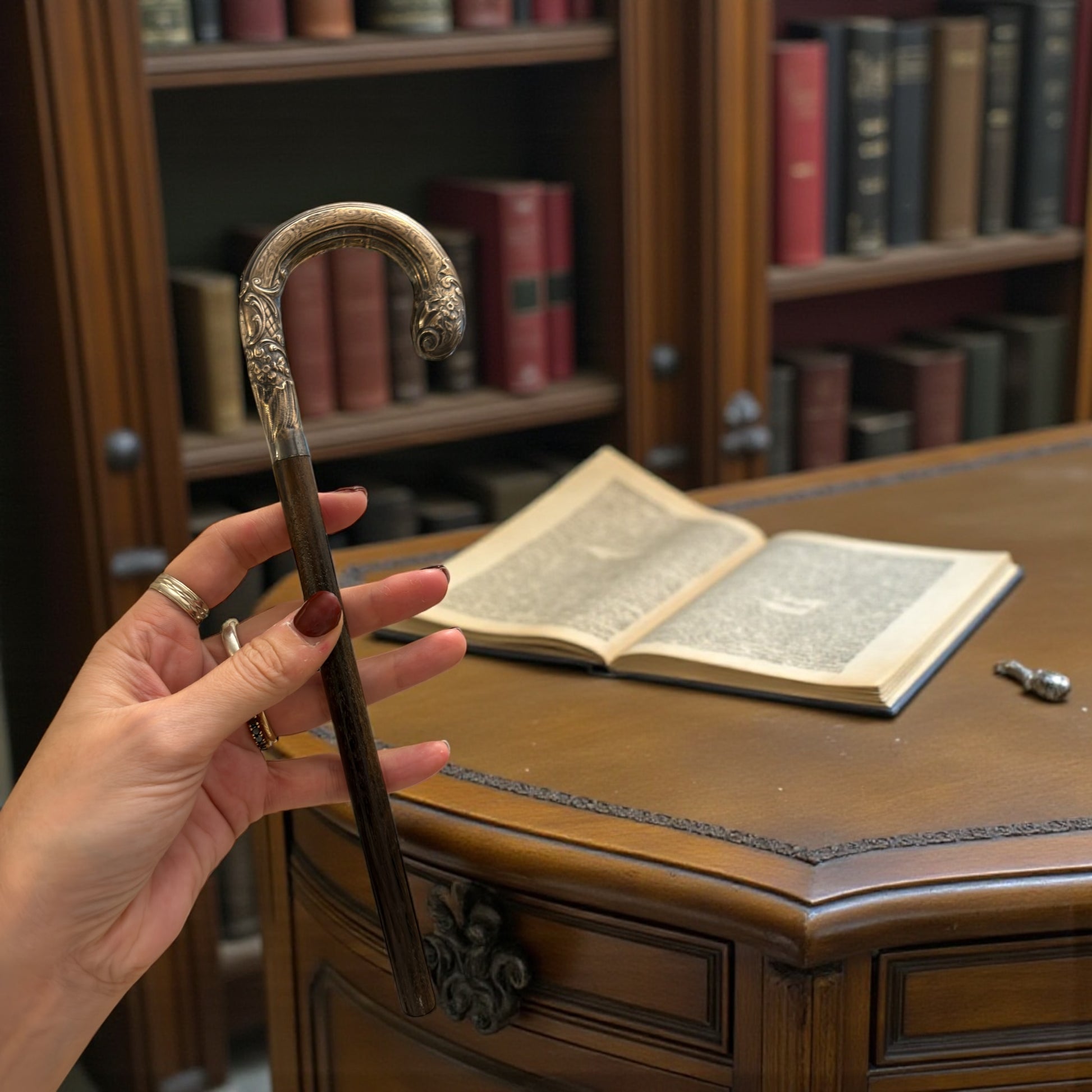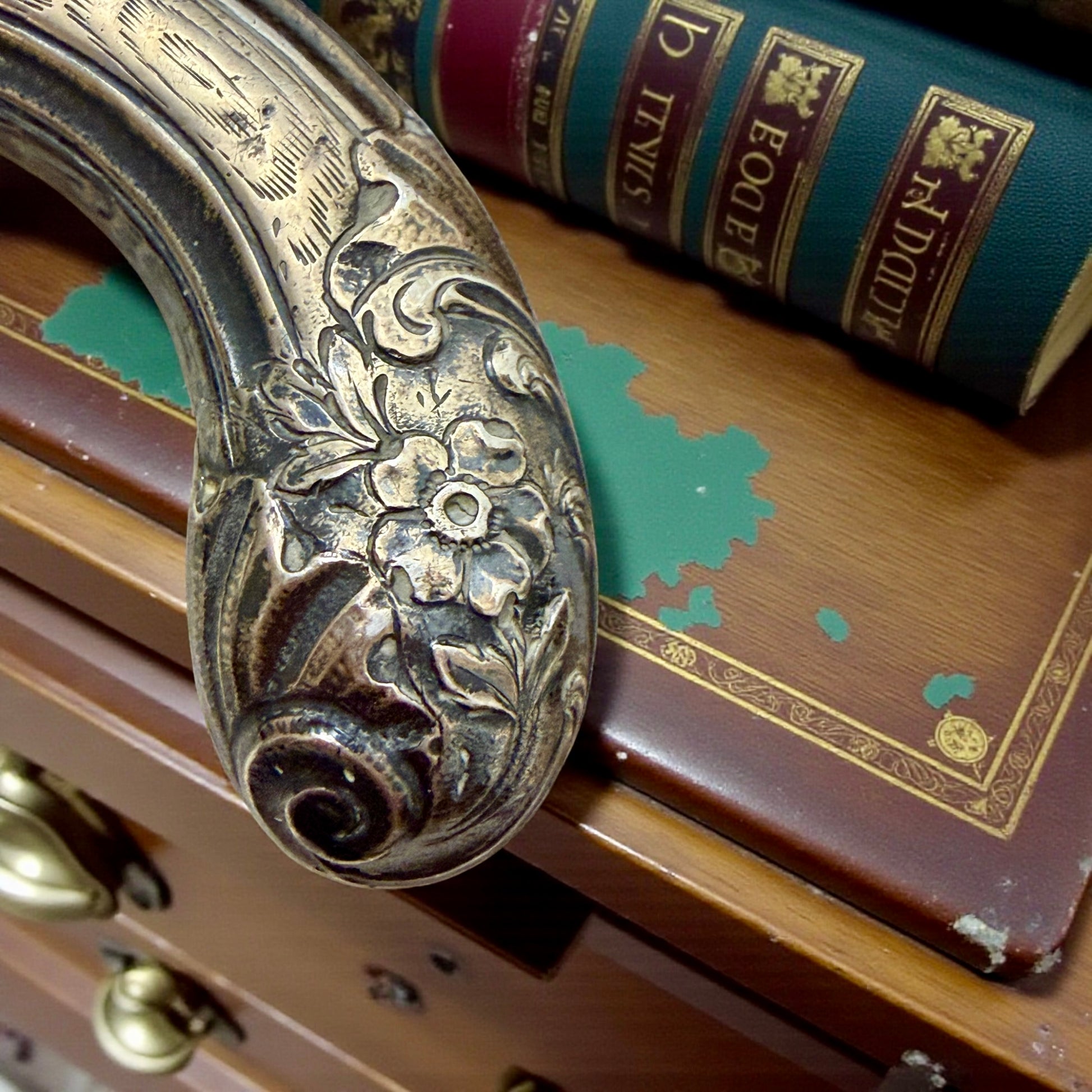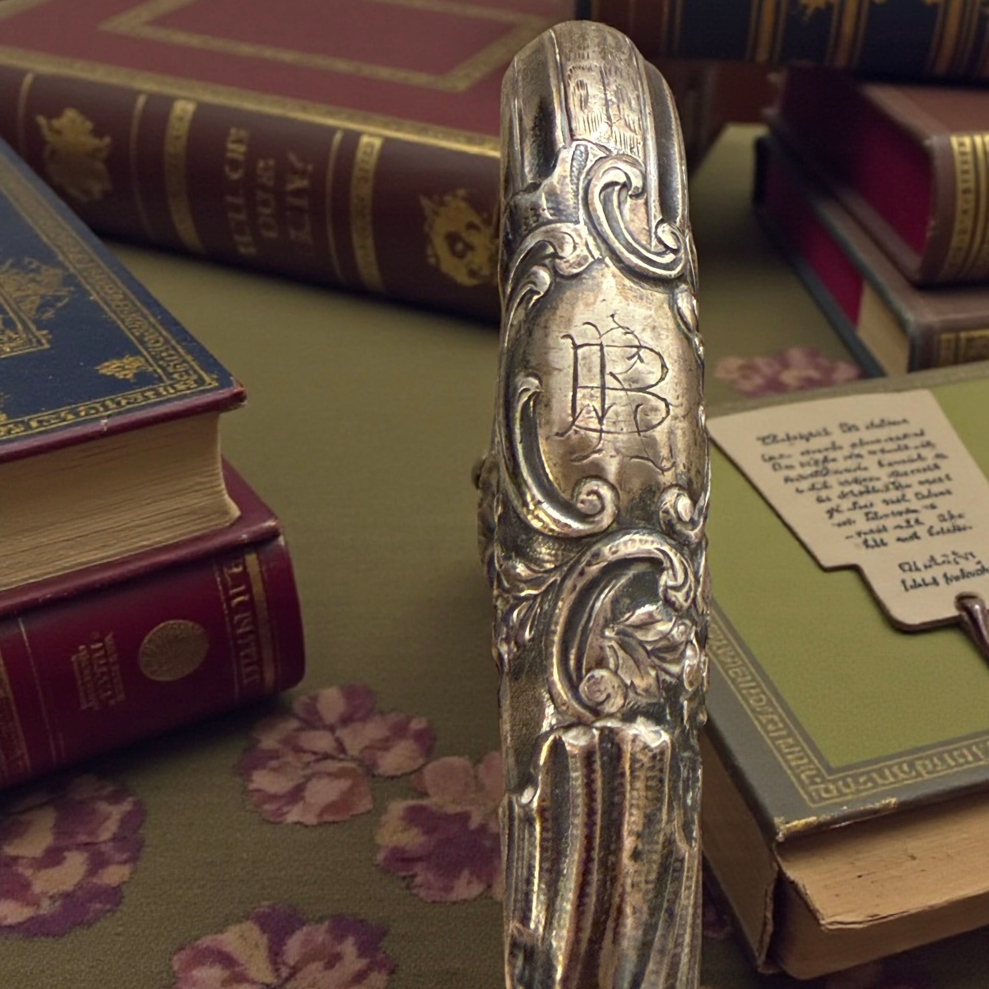 👉 A volte basta un dettaglio d’argento per aprire una porta sulla Belle Époque. Quando ho sfiorato questa impugnatura francese, ho sentito subito la solidità gentile dei suoi decori: fiori morbidi, volute fluenti, linee che sembrano respirare una grazia d’altri tempi. L’argento, inciso e lavorato a mano, conserva ancora una luce sottile, la stessa che un tempo accompagnava le passeggiate eleganti dei boulevard parigini. Lo impugni e sei subito una dama di un’altra epoca. Sul metallo si riconosce il punzone della tête de sanglier, la garanzia ufficiale di argento francese 800 fin dal 1838, e accanto il marchio del maître orfèvre, custode di un sapere lento e prezioso. Ogni segno, ogni ombra, è un piccolo respiro di storie passate. E immagino la sua proprietaria: una donna distinta, habituée dei caffè letterari, che appoggiava la mano proprio qui, lasciando che l’ombrello diventasse una continuazione discreta della propria presenza. Il monogramma inciso — iniziali intrecciate come un pensiero custodito — aggiunge una nota intima, quasi segreta. È curioso come un oggetto così piccolo possa suscitare una percezione così ampia: mentre lo osservi, potresti avvertire quella particolare sensazione di essere davanti a qualcosa che non torna indietro… ma che sa ancora accompagnare.