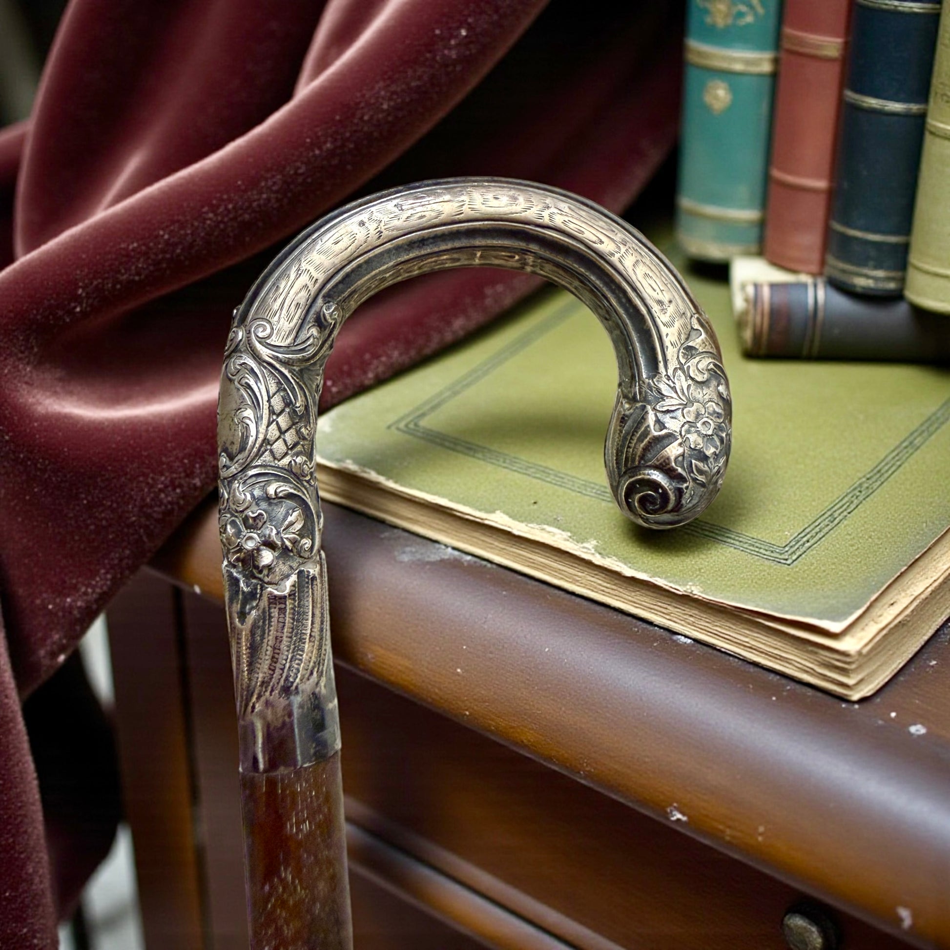 Impugnatura d’argento, Francia. Punzonatura: Tête de sanglier (argento 800/1000, 1838–oggi); punzone del maître orfèvre in losanga. Epoca: ca. 1880–1910. Materiale: Argento 800 lavorato a fusione, sbalzo e cesello. Peso: 68 g. Lunghezza complessiva (con tratto di legno): 25 cm. Decorazione: Rocaille floreale, motivi a intreccio, incisione monogrammata. Condizioni: Molto buone; patina autentica coerente con l’età.