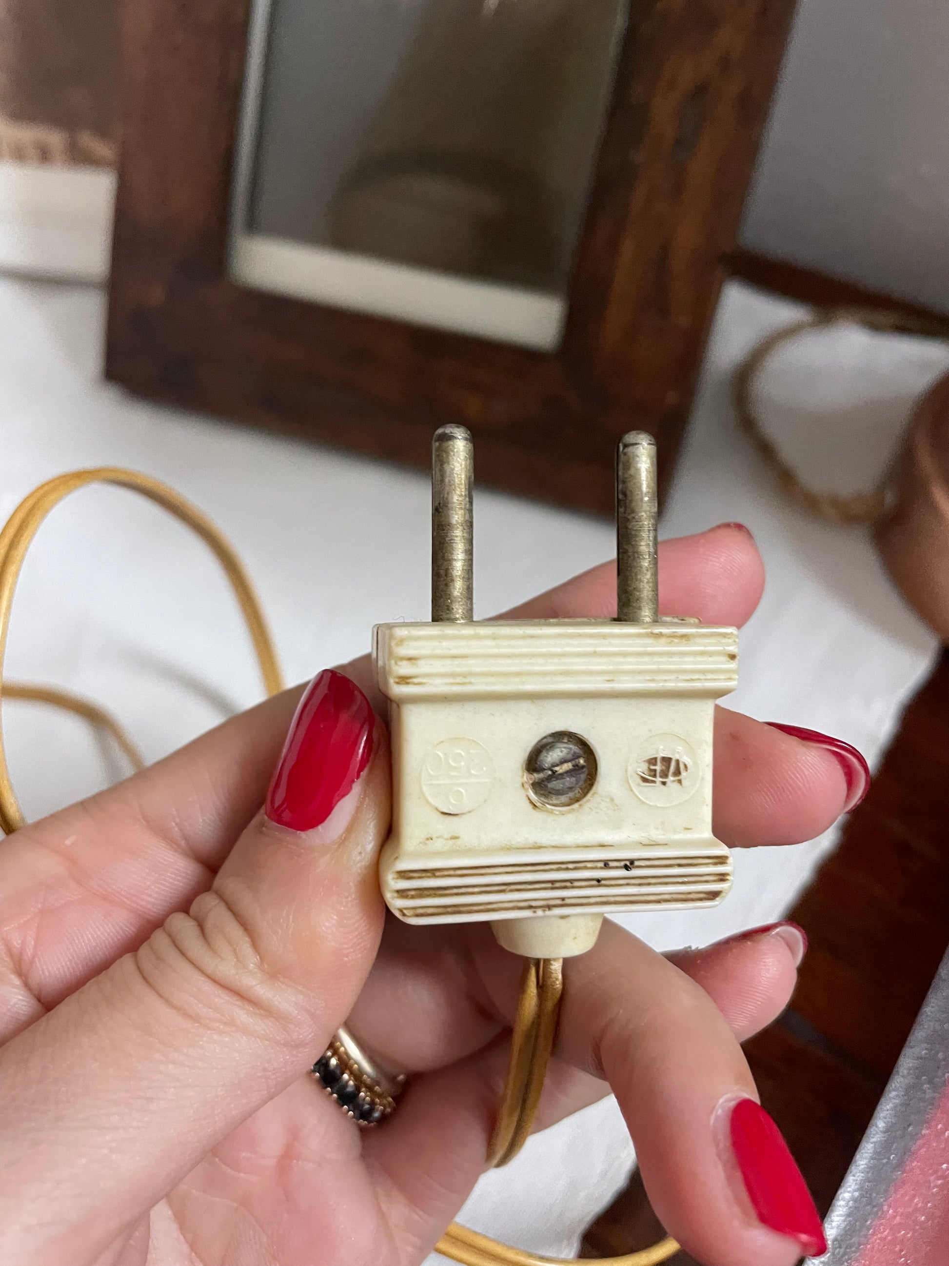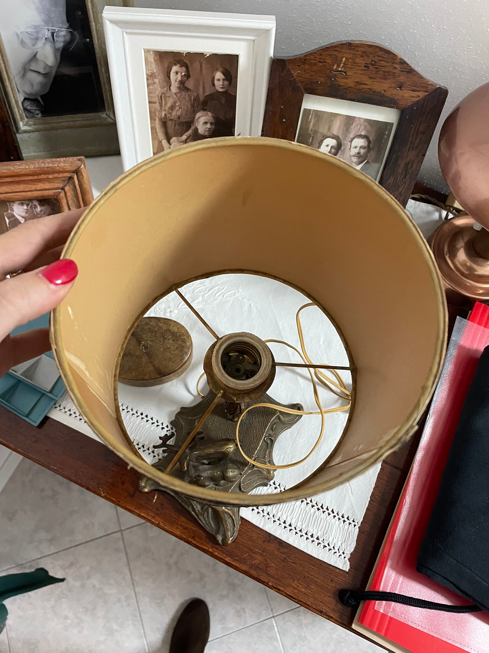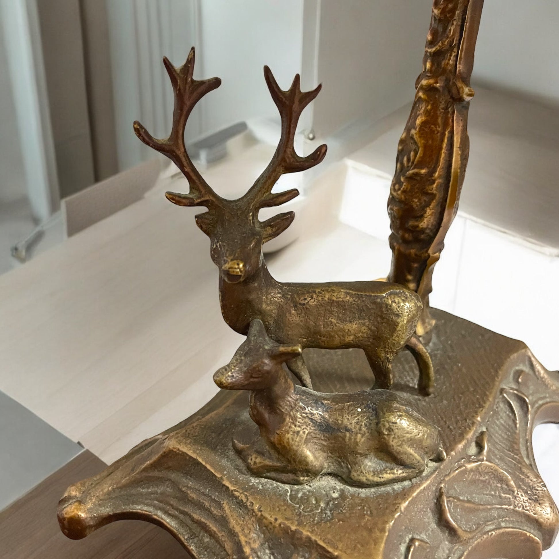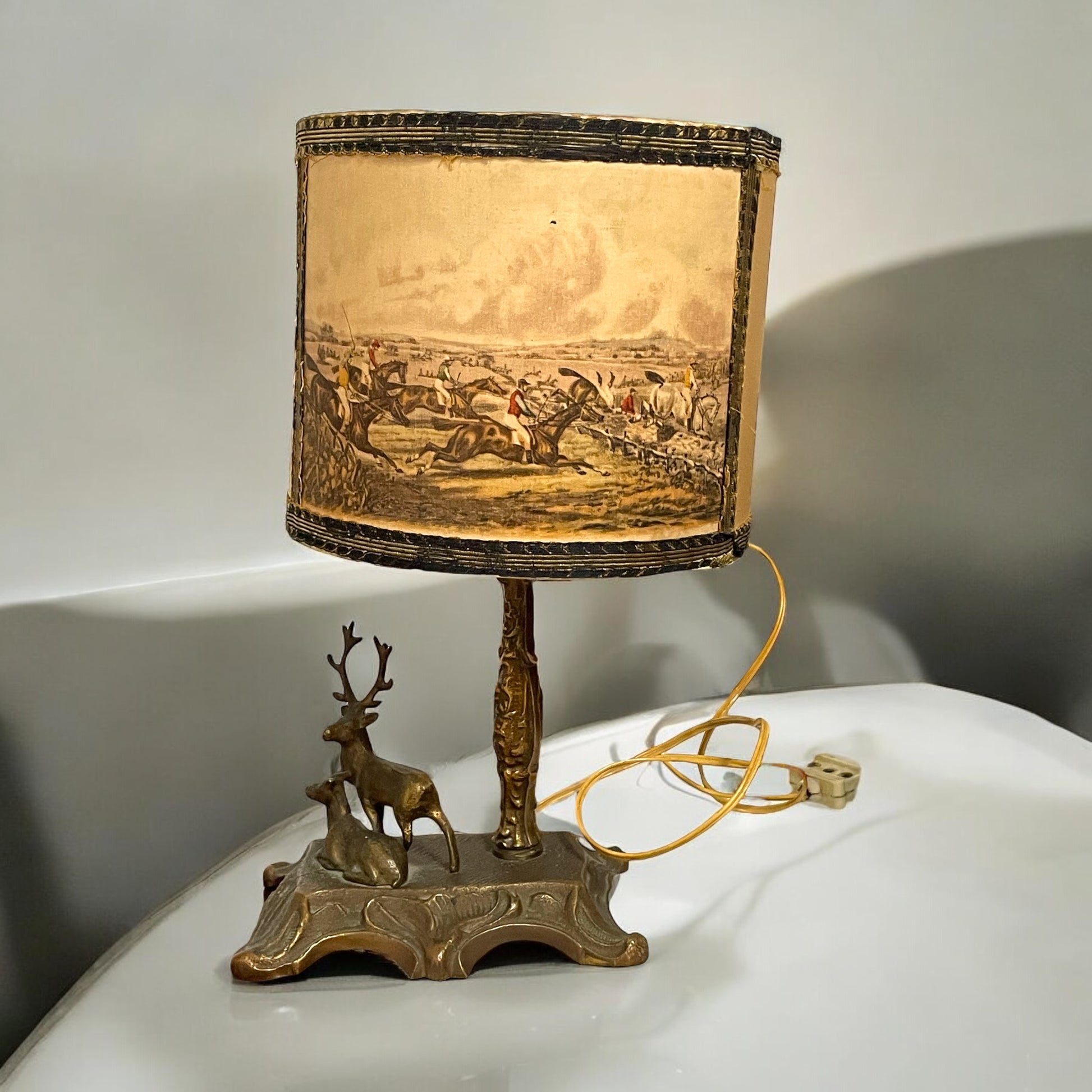 Questa lampada d’epoca, alta 31,5 cm, è un pezzo che richiama alla memoria un tempo di eleganza e raffinatezza. La base, in ottone finemente lavorato, è impreziosita da una scultura che rappresenta due cervi, simbolo di forza e bellezza naturale, fermi in una posa maestosa come se fossero colti in un attimo di quiete nel cuore del bosco. Il paralume è rivestito in stoffa, bordato con una elegante passamaneria dorata, riporta scene di caccia che sembrano uscite da un’antica stampa inglese. Uomini a cavallo e cani da caccia, pronti all’inseguimento, sembrano prendere vita al calare delle tenebre, quando la lampada viene accesa e la luce filtra delicatamente. Nonostante la presa di corrente sia ancora quella originale, a testimonianza dell’autenticità e della storia dell’oggetto, la lampada è funzionante e pronta a illuminare con la sua calda luce qualsiasi angolo della casa, creando un’atmosfera d’altri tempi.