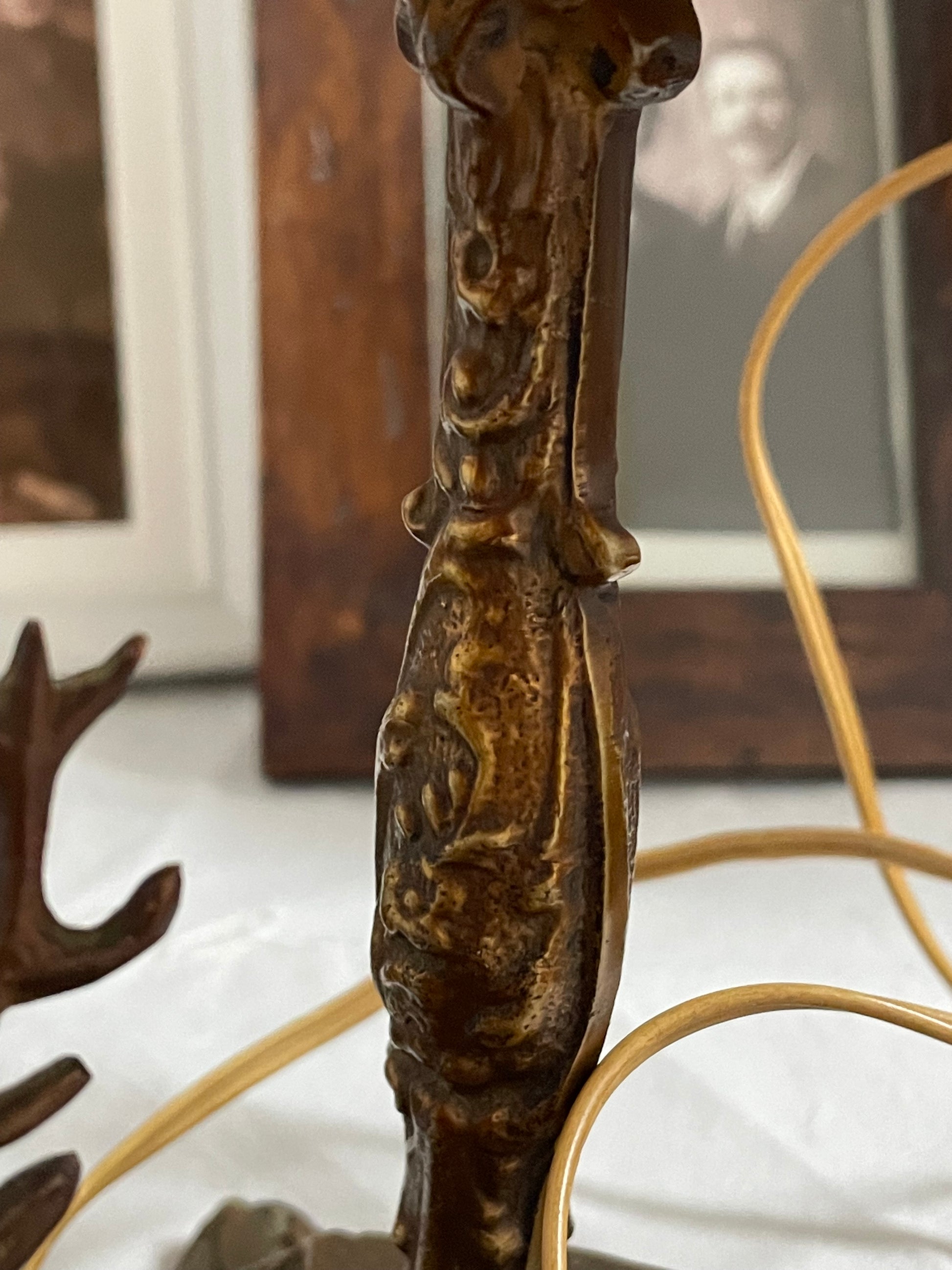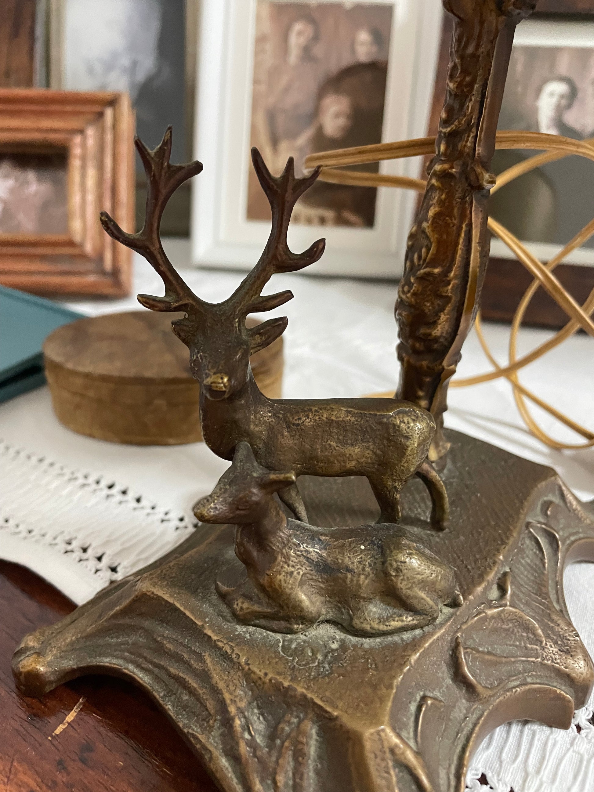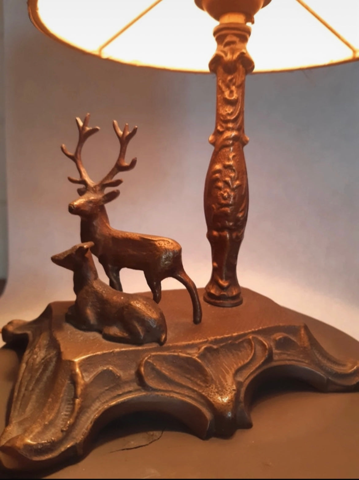 Antica lampada a tema caccia con cervi e paralume decorato