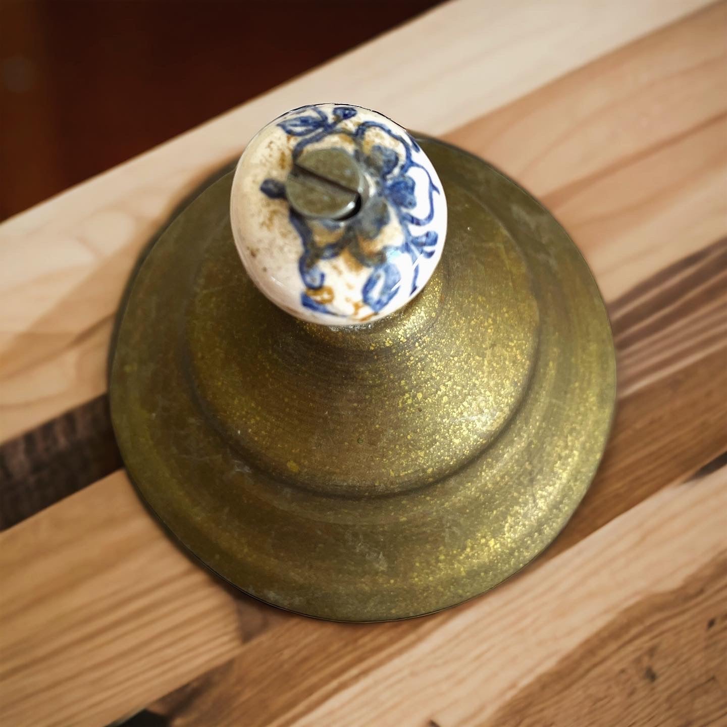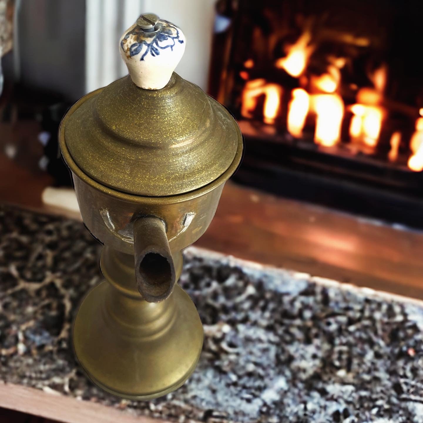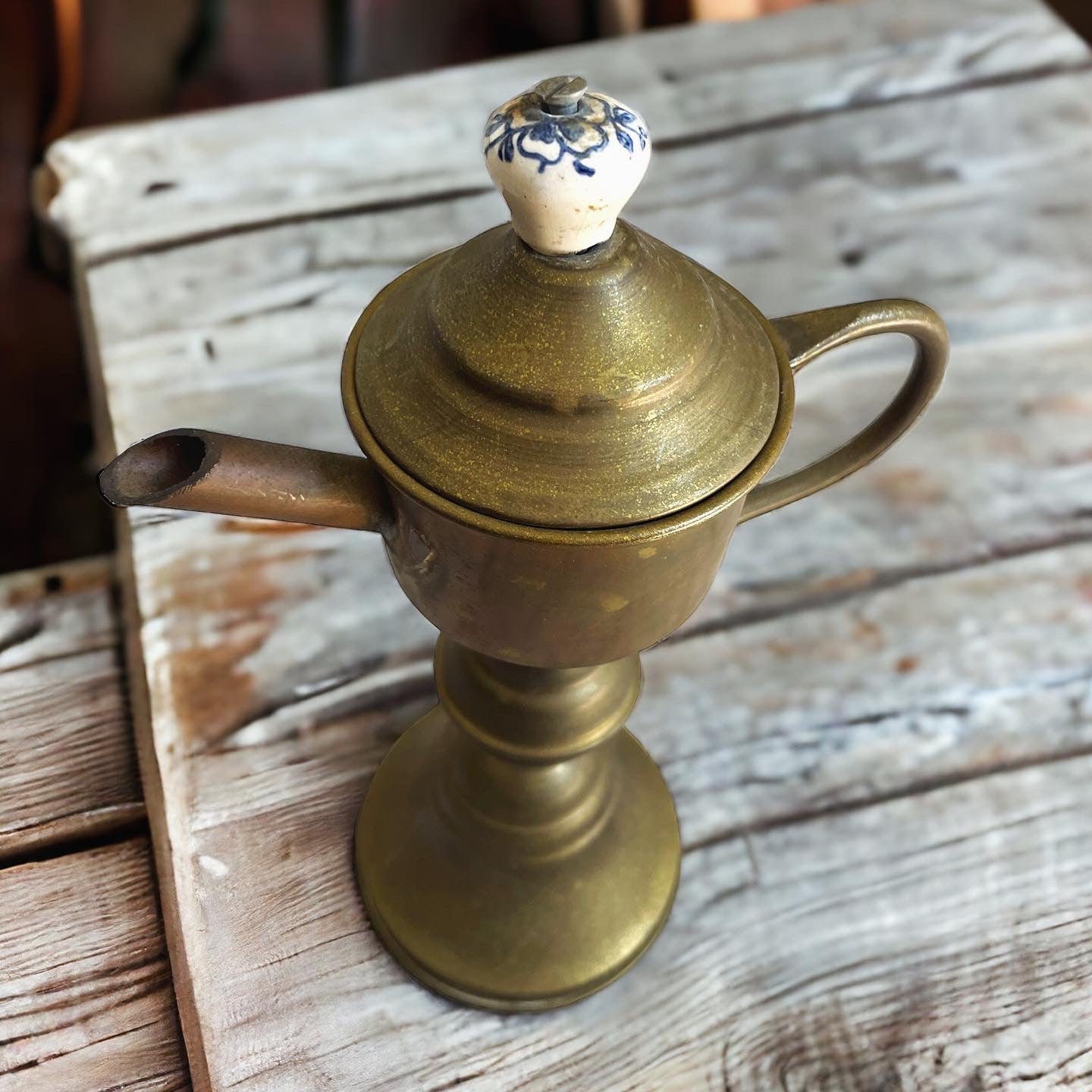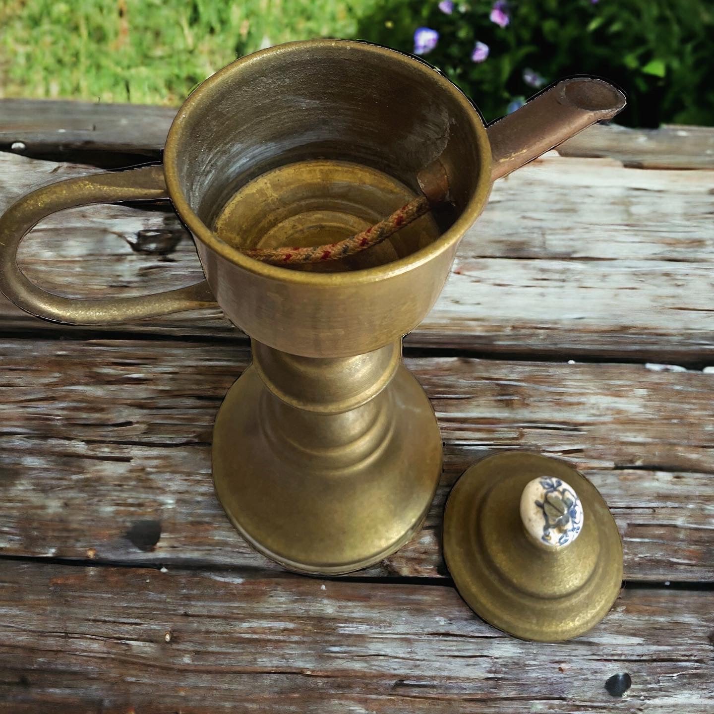 👀 what could this object be? A SNOTNEUS ... a term that in Flemish refers to the "nose" that you can see in photo 4 very well ... this ancient lamp was invented in Holland in the Middle Ages and works with whale oil. This example is from the early 1900s, has a white and blue painted knob on the lid, is about 25 cm high.