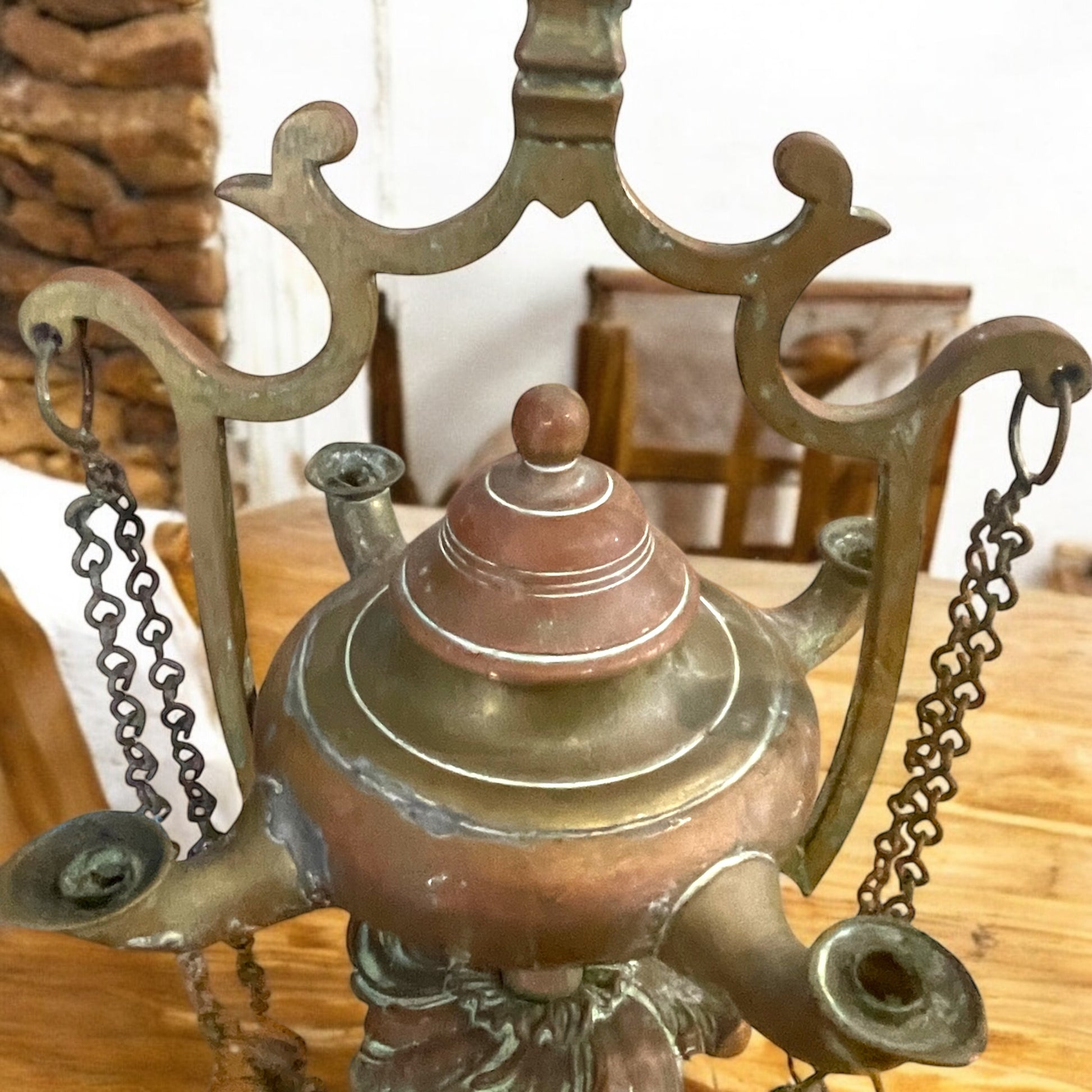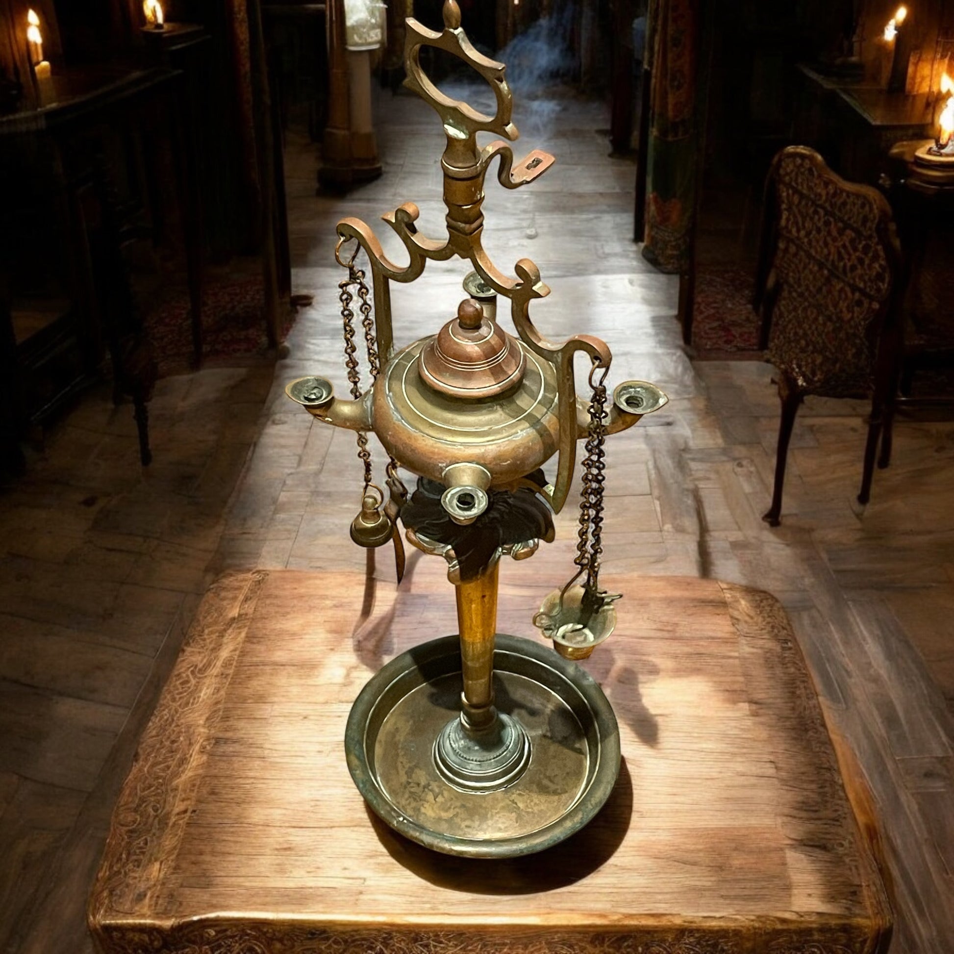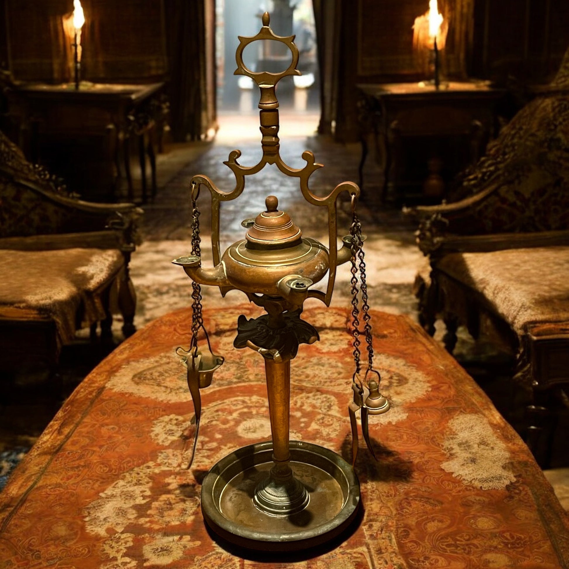 SPOILER: non è una lampada fiorentina…. È una lampada rituale indiana su piedistallo – in ottone, con attrezzi votivi originali. Un oggetto antico, solenne e al tempo stesso profondamente umano. Realizzata in ottone, proviene dall’India meridionale - probabilmente Tamil Nadu o Kerala - e si inserisce nella ricca tradizione delle “samai”: le lampade votive utilizzate nei riti induisti domestici e templari. Da notare il meraviglioso fiore di loto a metà altezza, con i petali che si aprono verso l’esterno. Queste lampade venivano accese all’alba e al tramonto, durante le preghiere quotidiane chiamate “puja”. La fiamma rappresentava la presenza del divino, rischiarava il cammino interiore e purificava lo spazio circostante. L’accensione della lampada era un atto di devozione, di invocazione e di gratitudine. Era posta di fronte all’immagine della divinità. La struttura poggia su un piattino raccogli-goccia, e si eleva con grazia fino al serbatoio centrale, simile a una teiera, da cui si diramano quattro beccucci per gli stoppini. Ciò che rende davvero speciale questa lampada è la presenza degli strumenti votivi originali, ancora sospesi alle catene:
