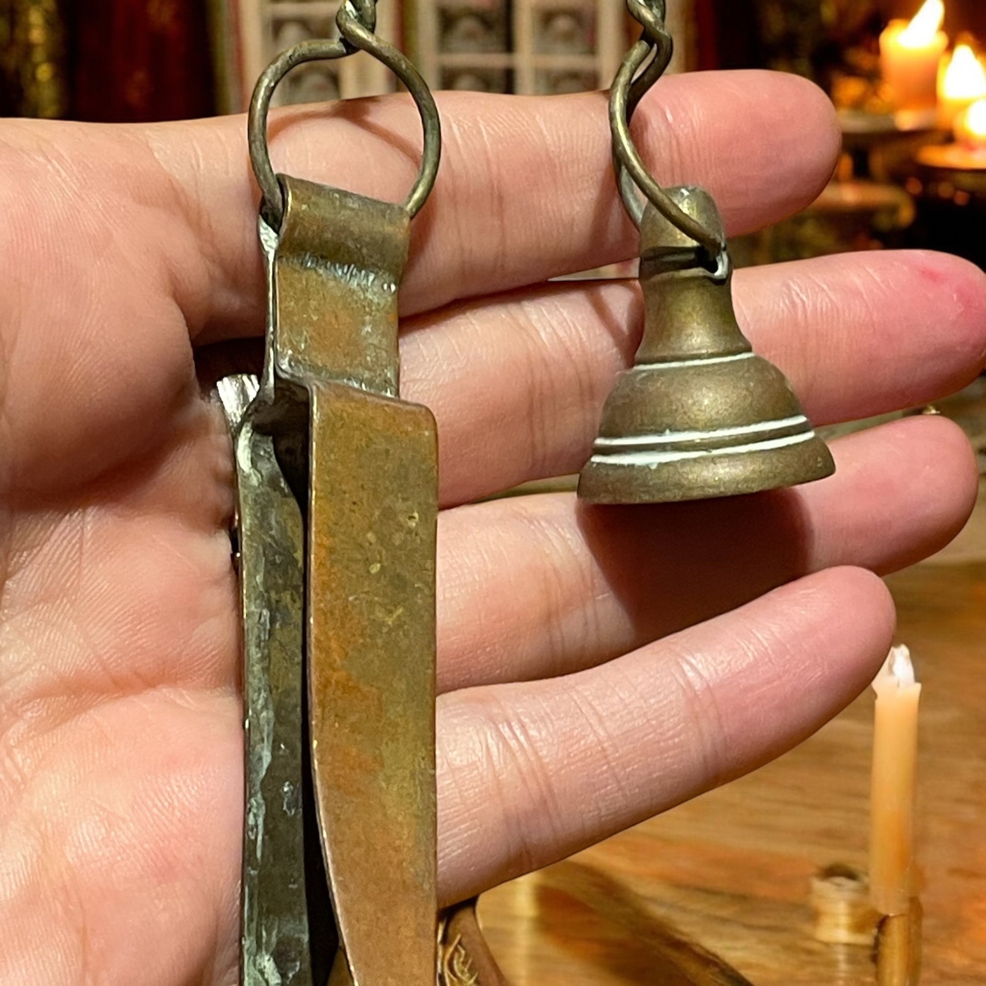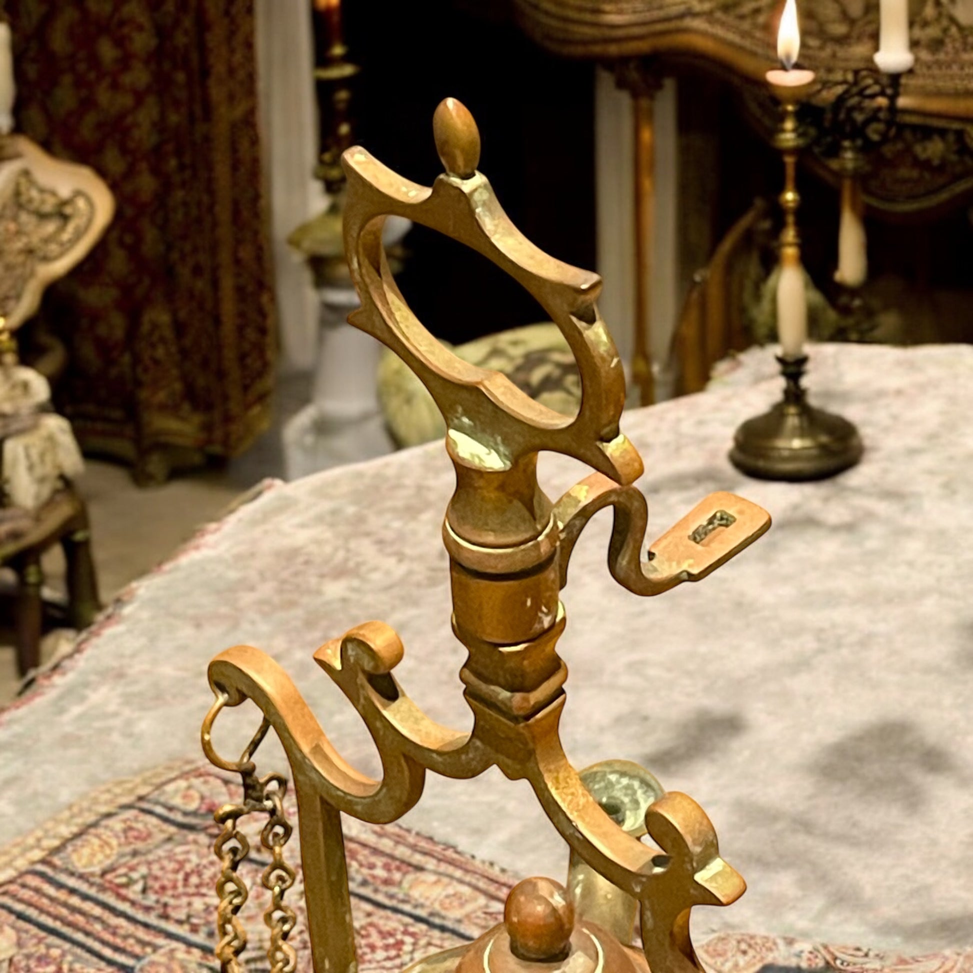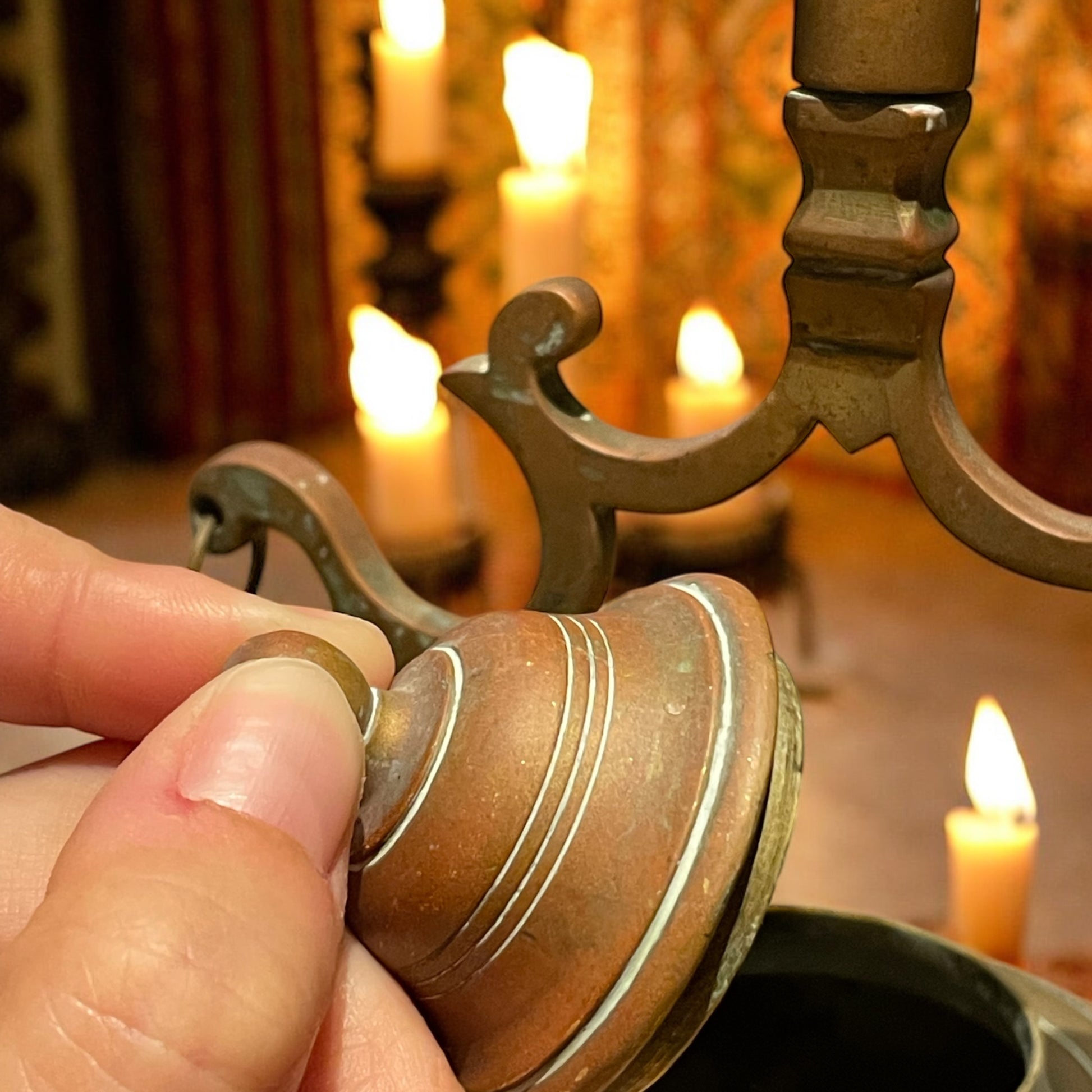 SPOILER: non è una lampada fiorentina…. È una lampada rituale indiana su piedistallo – in ottone, con attrezzi votivi originali. Un oggetto antico, solenne e al tempo stesso profondamente umano. Realizzata in ottone, proviene dall’India meridionale - probabilmente Tamil Nadu o Kerala - e si inserisce nella ricca tradizione delle “samai”: le lampade votive utilizzate nei riti induisti domestici e templari. Da notare il meraviglioso fiore di loto a metà altezza, con i petali che si aprono verso l’esterno. Queste lampade venivano accese all’alba e al tramonto, durante le preghiere quotidiane chiamate “puja”. La fiamma rappresentava la presenza del divino, rischiarava il cammino interiore e purificava lo spazio circostante. L’accensione della lampada era un atto di devozione, di invocazione e di gratitudine. Era posta di fronte all’immagine della divinità. La struttura poggia su un piattino raccogli-goccia, e si eleva con grazia fino al serbatoio centrale, simile a una teiera, da cui si diramano quattro beccucci per gli stoppini. Ciò che rende davvero speciale questa lampada è la presenza degli strumenti votivi originali, ancora sospesi alle catene: