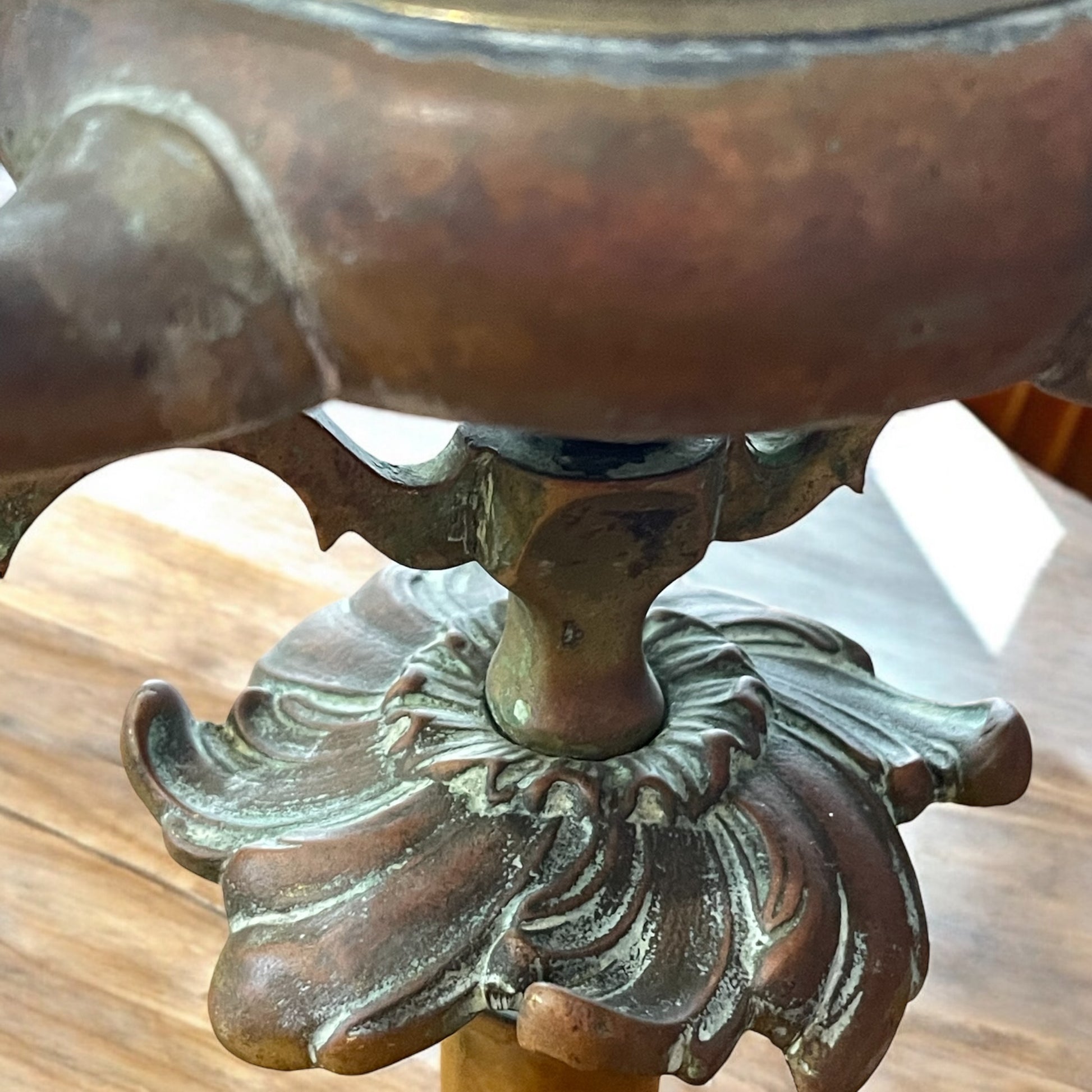 Bella la patina con i suoi verdi ramati, le bruniture antiche e i riflessi dorati; racconta di mani devote, di riti serali, di tempi lenti e intensi. Un oggetto di forte valore simbolico, capace di evocare spiritualità, raccoglimento e arte rituale. Altezza cm 43.