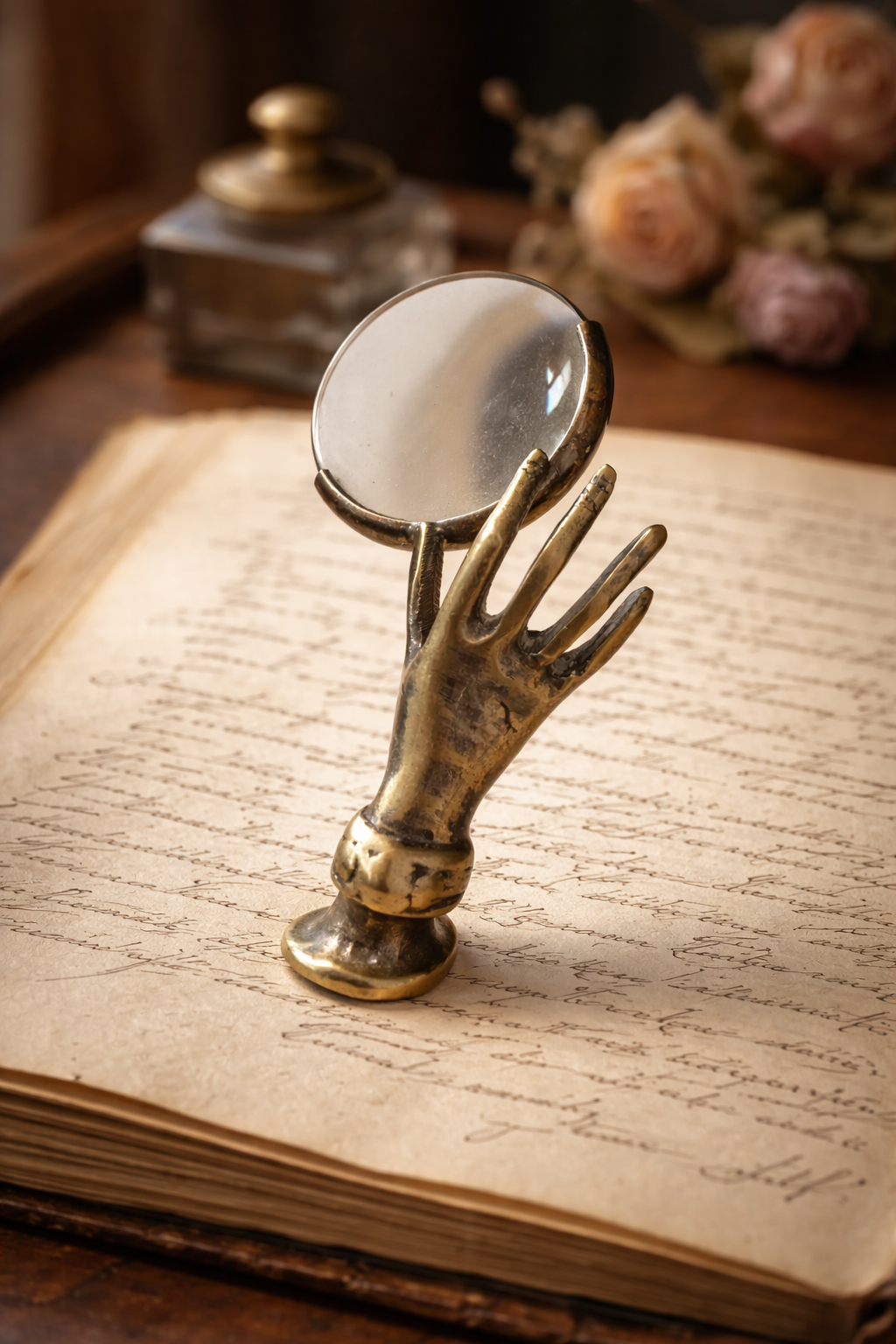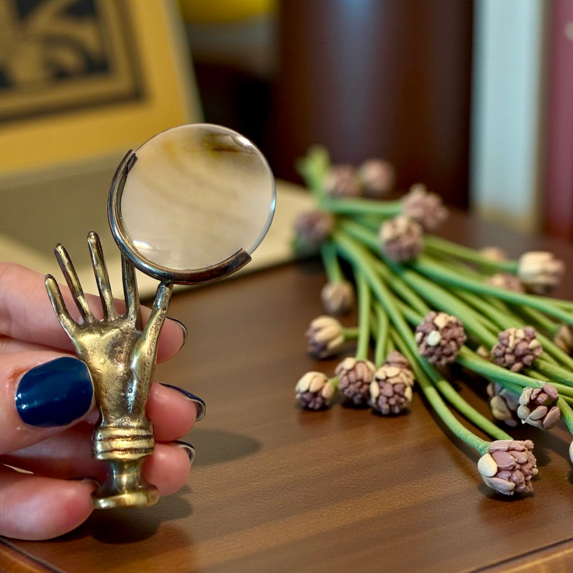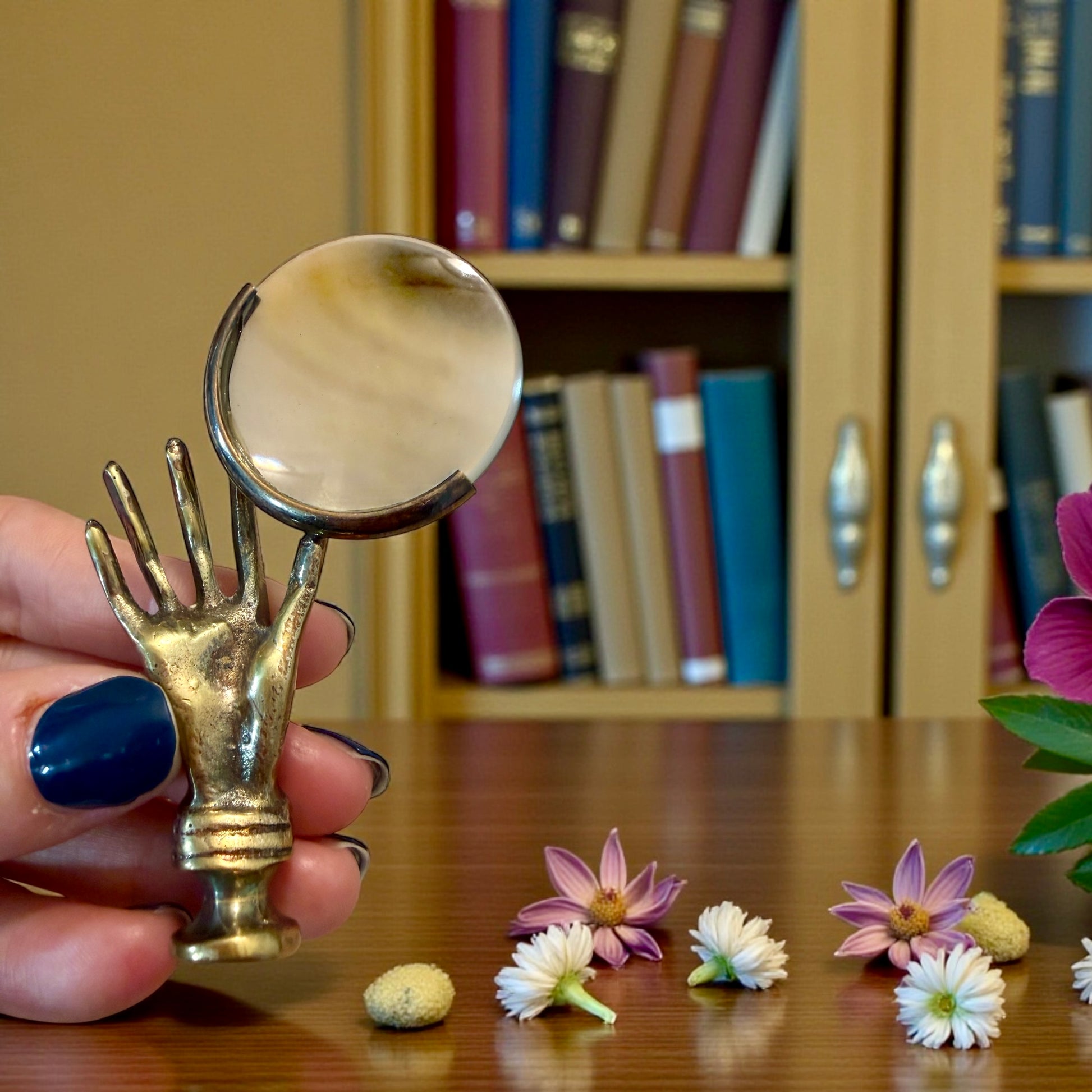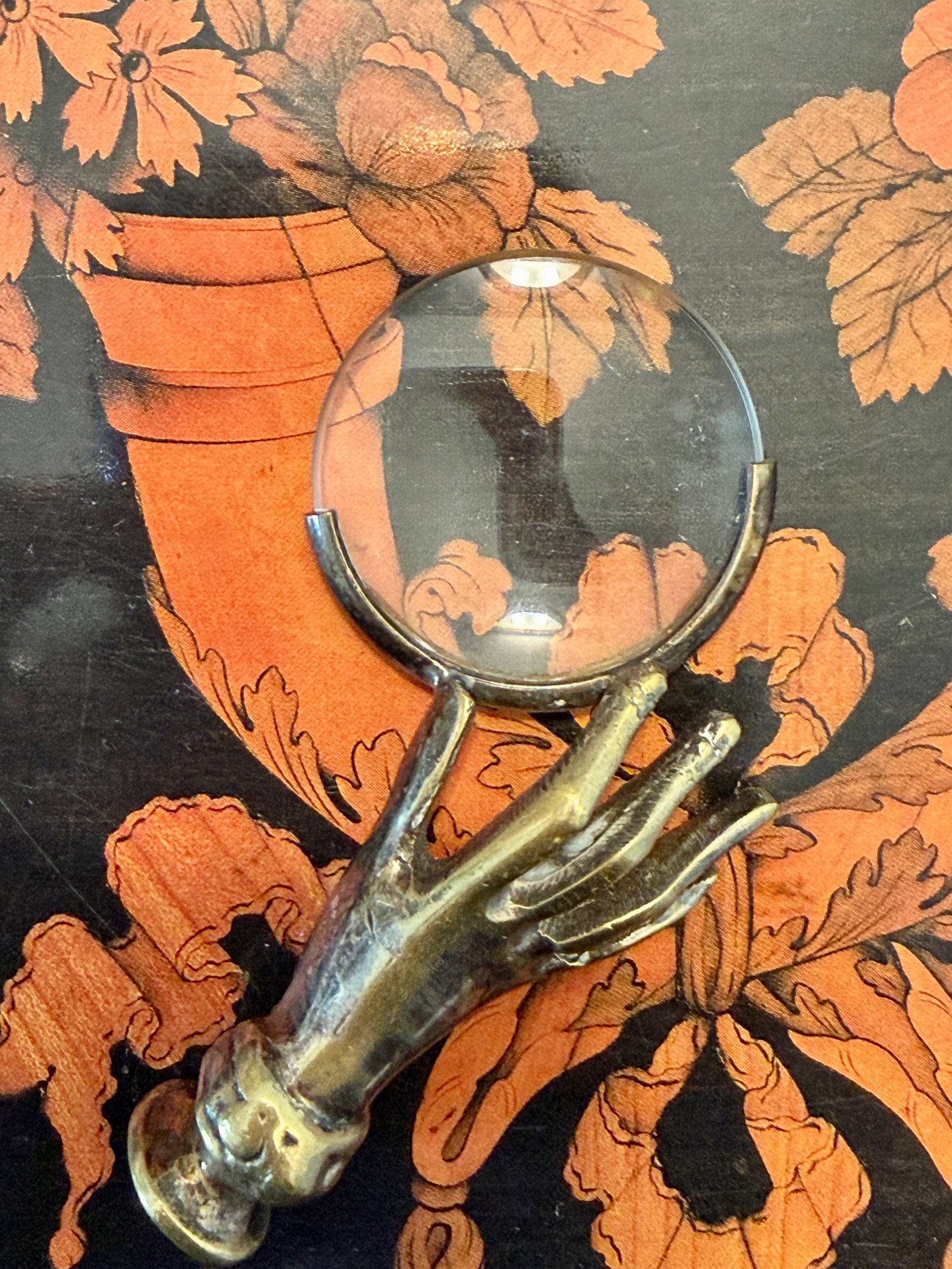 Non tutte le mani stringono: alcune insegnano a guardare. Questa mano in ottone, ferma e paziente, solleva una lente come se stesse offrendo il mondo a chi ha tempo di osservarlo davvero. La superficie racconta anni di uso, di luce che scorre, di dita che l’hanno afferrata senza fretta. La patina è profonda, autentica, mai forzata: quella che solo il tempo sa creare. Immaginala su una scrivania di legno, accanto a fogli ingialliti, lettere scritte a mano, piccoli oggetti da esaminare uno a uno. La lente è ancora perfettamente funzionante, il vetro spesso restituisce un ingrandimento limpido, preciso, sorprendentemente attuale. Non è un oggetto decorativo nato per sembrare antico. È un oggetto che lo è diventato vivendo. E oggi è pronta a tornare a fare ciò per cui è nata: aiutare qualcuno a vedere meglio… anche e soprattutto metaforicamente parlando.