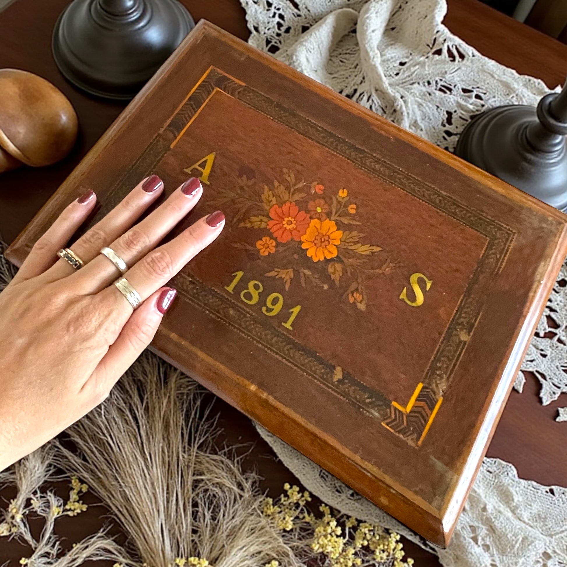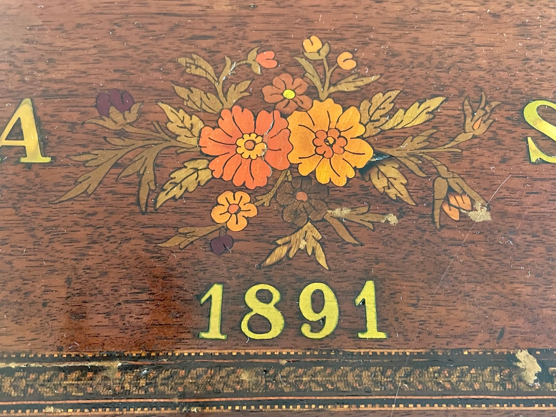 Epoca: 1891, Nord Italia. Materiali: legno massello con impiallacciatura in palissandro, intarsio floreale in essenze policrome, serratura in ottone. Funzione: cofanetto nuziale da cucito / corredo prezioso. Condizioni: buone, con lievi usure della vernice; interno rifoderato negli anni ’60-’70; manca la chiave. Piedini presenti, leggero gioco della cerniera. Dimensioni generose: 30 x 21 altezza 17 cm.