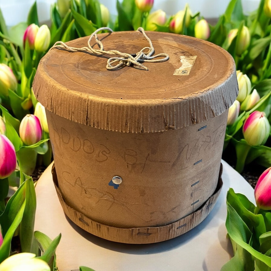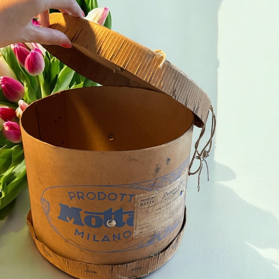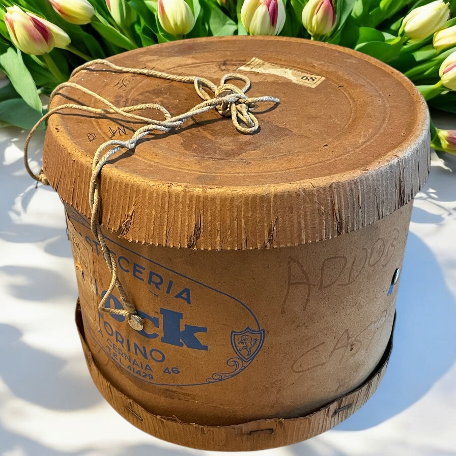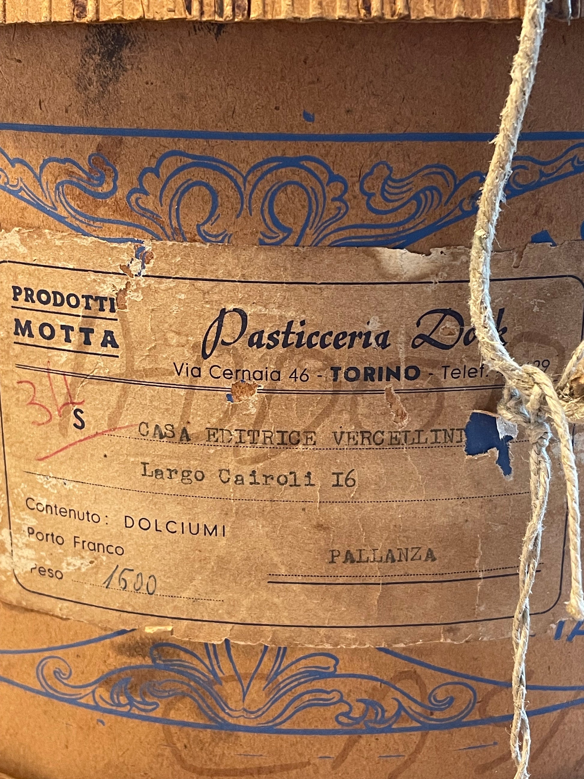 Correva l’anno 1937 e la pasticceria Dolci, in Via Cernaia a Torino, era un piccolo regno di profumi e zucchero. Ogni giorno maestri pasticceri confezionavano delizie con mani sapienti, mentre il tintinnio delle campanelle d’ingresso annunciava nuovi clienti curiosi. Questa scatola Motta, con la sua grafica blu in rilievo e i fregi che sembrano danzare sulla superficie, era stata scelta per contenere un prezioso carico di dolciumi: biscotti al burro, amaretti morbidi e caramelle alla frutta. Legata con un cordoncino robusto, avrebbe viaggiato verso un destinatario speciale: la Casa Editrice Vercellini, a Pallanza, sul Lago Maggiore. Immagina la curiosità di chi l’ha ricevuta: l’emozione nell’aprire il coperchio per scoprire il profumo dolce che saliva dal fondo. Forse era un dono pasquale, forse un ringraziamento per un racconto pubblicato. Sta di fatto che la scatola, una volta svuotata, rimase a custodire memorie. Appunti di storie, cartoline di luoghi lontani, e… lettere d’amore non spedite. Ad un certo punto della sua storia, un bimbo con una grafia incerta, scrisse sul retro “ addobbi natale”, oggi non si legge quasi più. Oggi, questa scatola è una testimone silenziosa di un tempo in cui ogni pacco portava con sé un viaggio, un’attesa e una promessa di dolcezza. È stupenda come arredo vintage in una bottega o in un locale di ristorazione. diametro 27 altezza 23 cm.