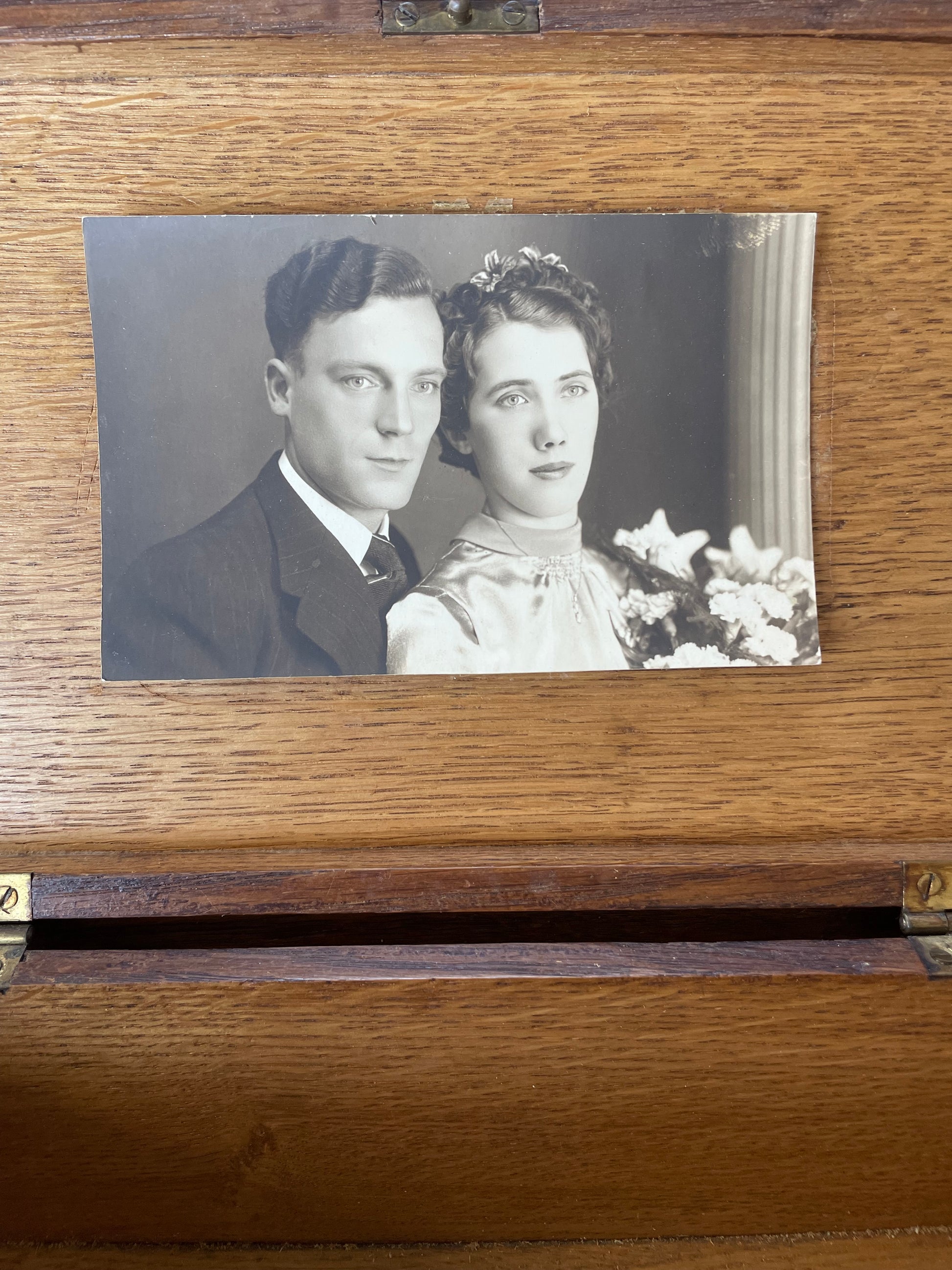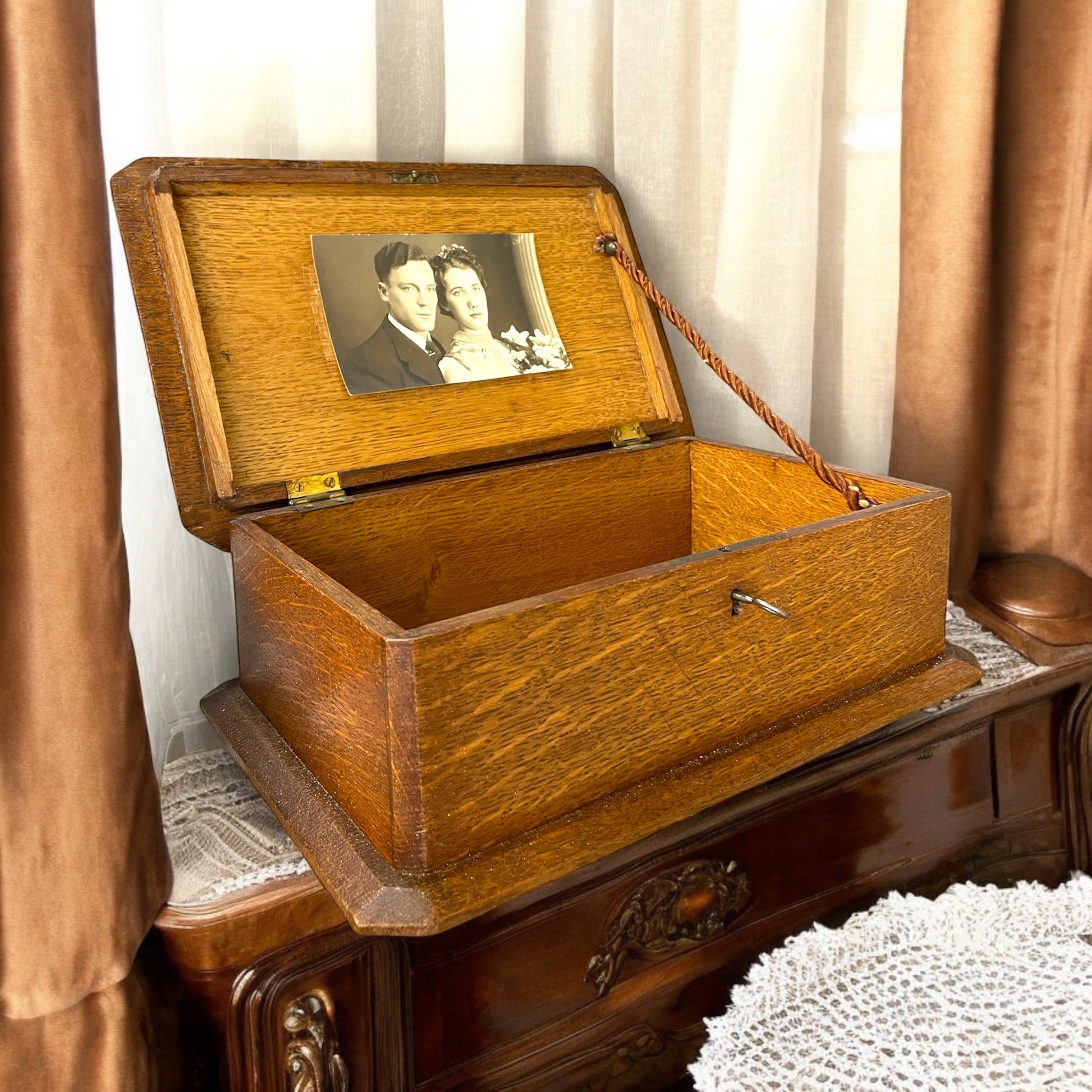 Era il 1930 quando Margaret si trovò a scegliere un dono speciale per sua nipote Edith, giovane e dolce, che stava per sposare Charles, un uomo serio e devoto il cui sguardo sembrava sempre in cerca di qualcuno da proteggere. Margaret si ricordò di quella scatola in legno massello che aveva acquistato anni prima in una bottega di artigiani nella periferia di Londra. Il coperchio era intagliato con un bouquet di rose e boccioli ancora chiusi, come a simboleggiare l’inizio di qualcosa di prezioso e delicato. Margaret sapeva che la rosa, da sempre, è simbolo di amore e promessa; le sembrò perfetta per accompagnare Edith nel suo nuovo cammino. Il giorno delle nozze, in un’umida mattina di marzo, Margaret consegnò la scatola agli sposi. Non si trattava di un semplice cofanetto, ma di uno scrigno di ricordi. All’interno, Margaret aveva riposto alcuni boccioli di rosa essiccati, raccolti il giorno in cui Edith e Charles avevano annunciato il fidanzamento. Accanto, aveva ripiegato la partecipazione di nozze; stampata su una carta spessa color avorio, con caratteri sottili e raffinati. Infine, aggiunse un velo sottile di garza, appartenuto alla madre di Edith, una donna scomparsa troppo presto, ma sempre presente nel cuore della ragazza. La scatola accompagnò Edith e Charles per tutta la loro vita. E lì, fissata all’interno del coperchio, c’era una vecchia fotografia della coppia il giorno delle nozze: Edith con i suoi occhi chiari e un filo di fiori tra i capelli, e Charles con lo sguardo fermo e la sua promessa negli occhi. Questa scatola è arrivata fino a noi, come un dono prezioso, in condizioni ottime: solo la serratura è un po’ birichina; ma basta girare la chiave tenendo ben chiuso il coperchio. 30 x 20 x 10 circa.