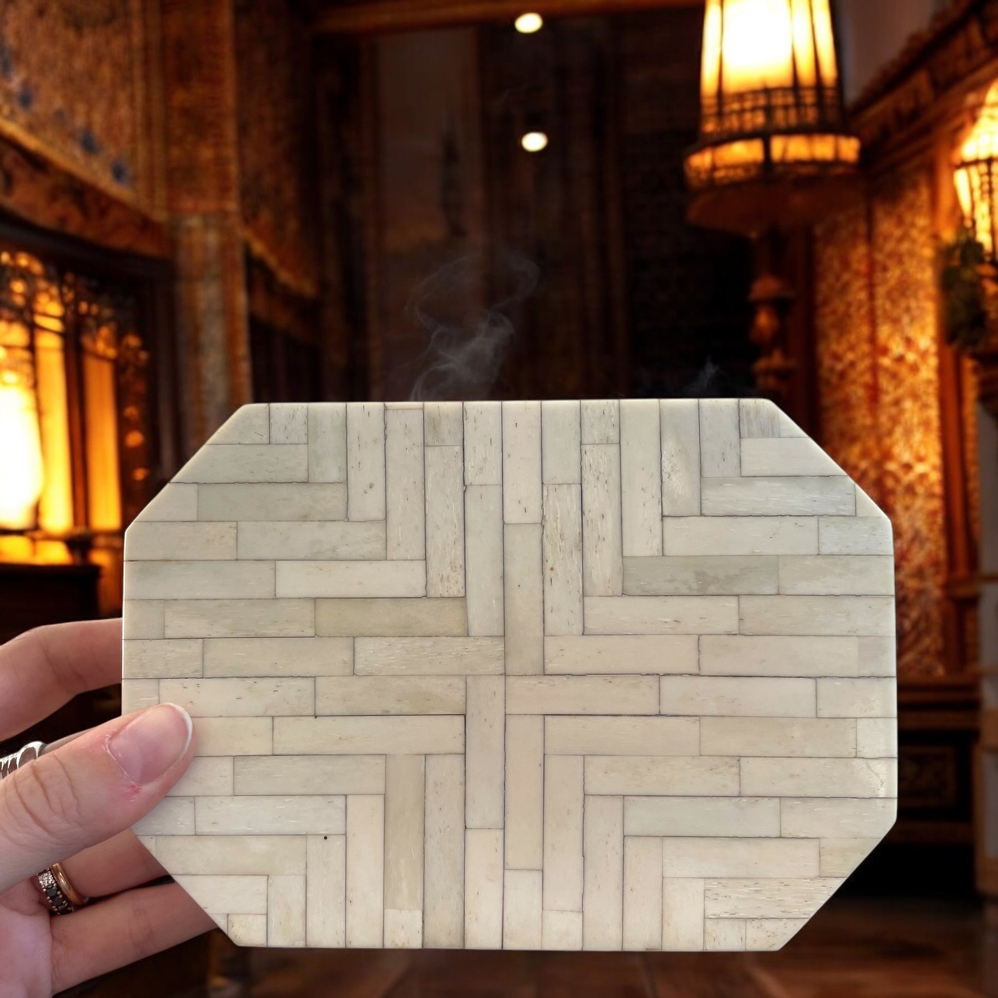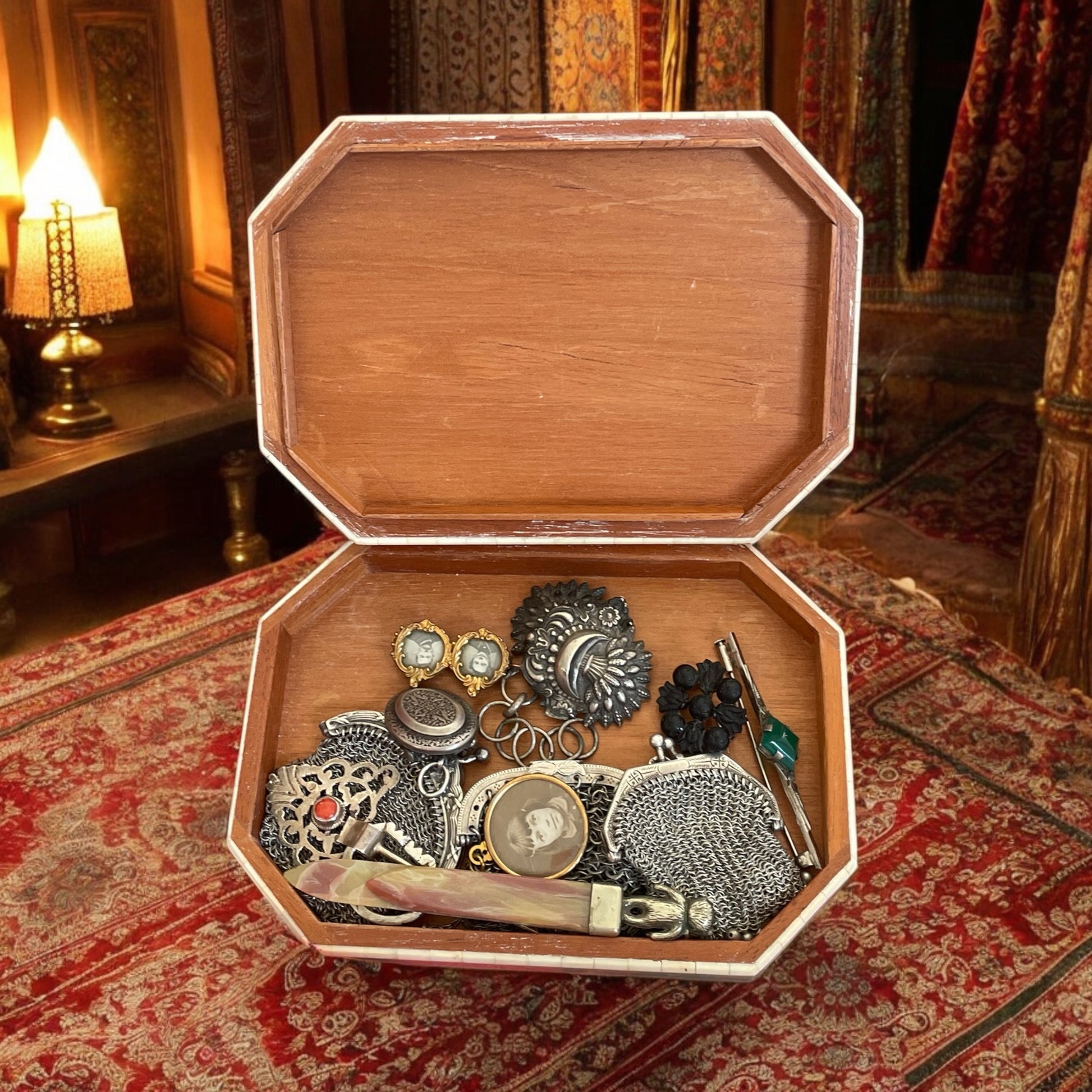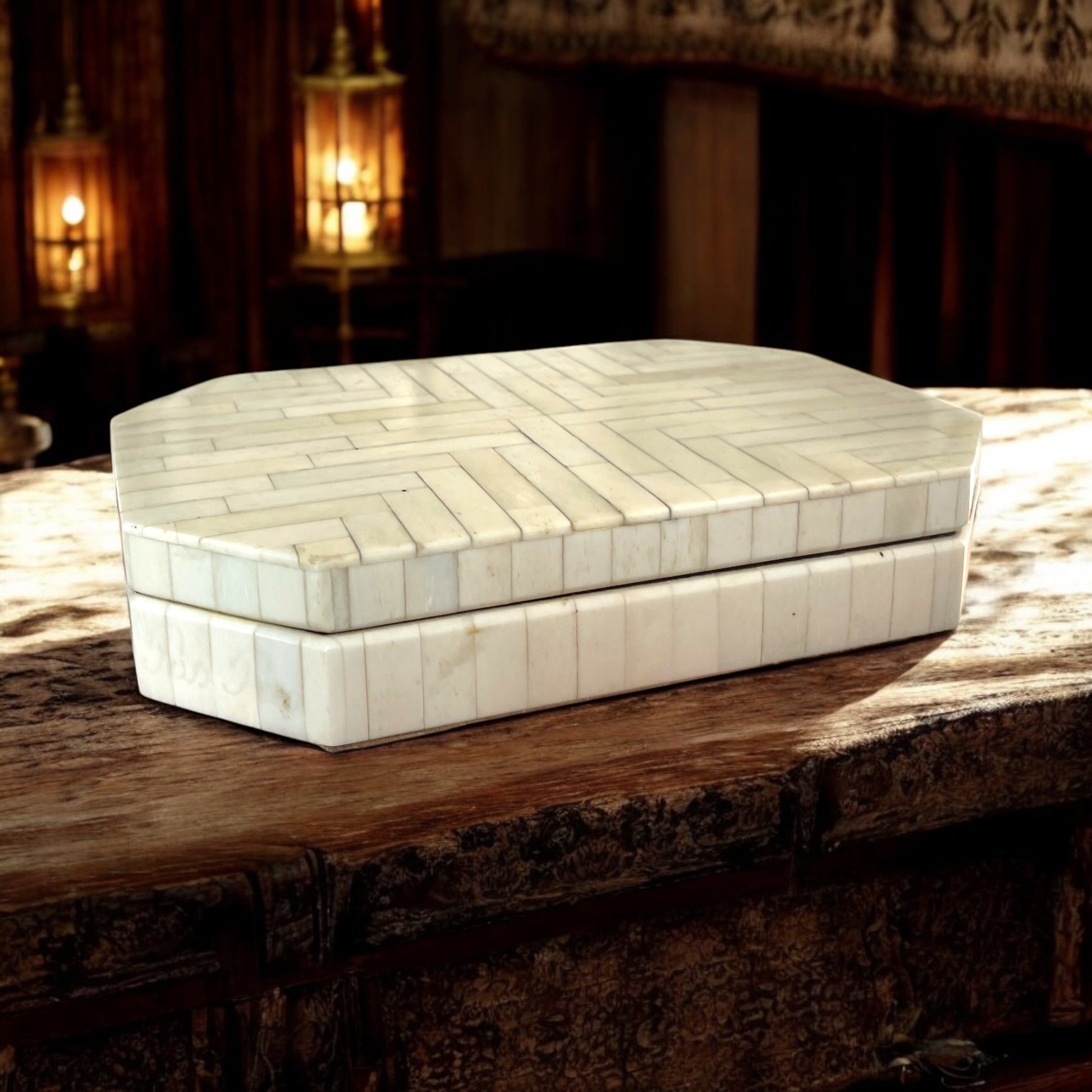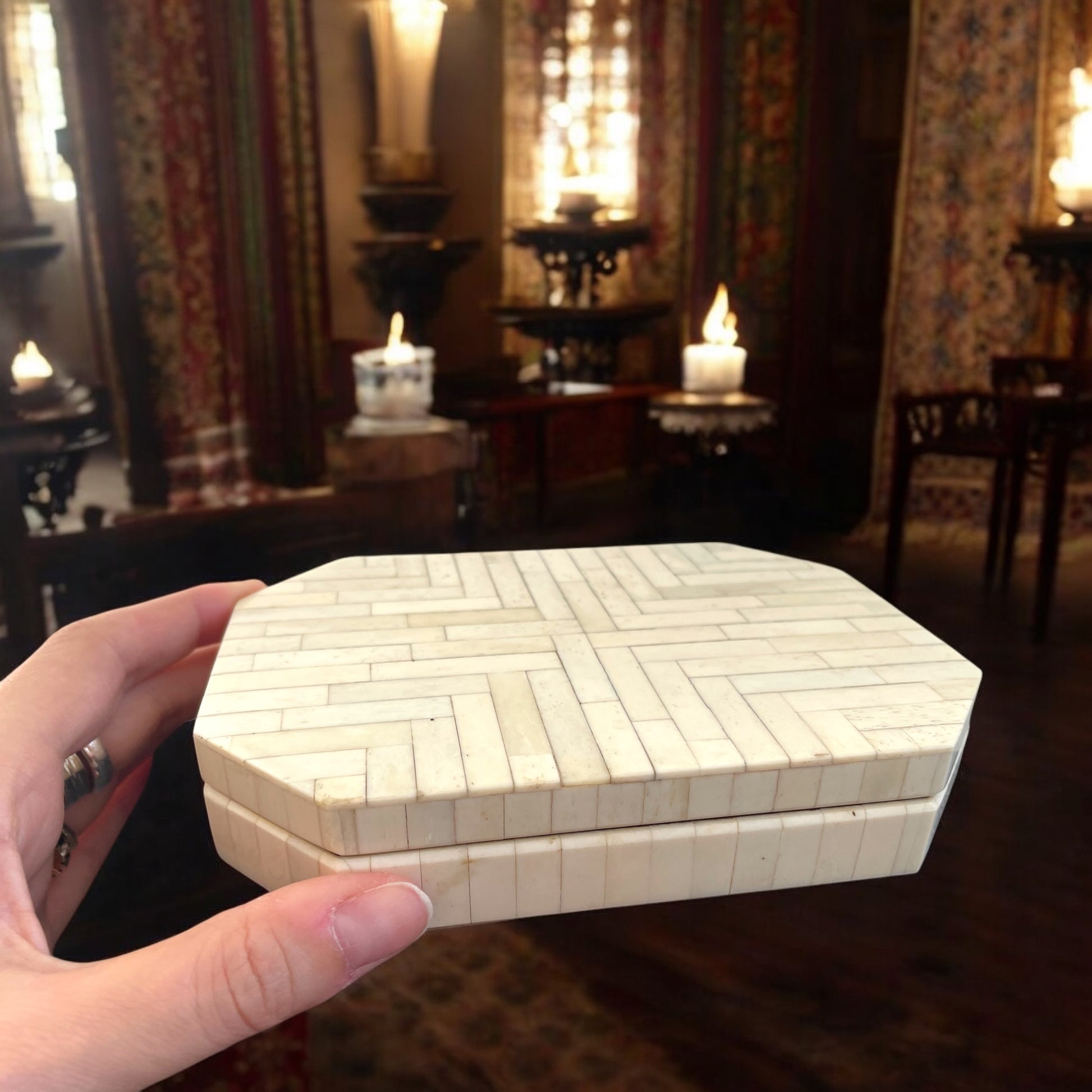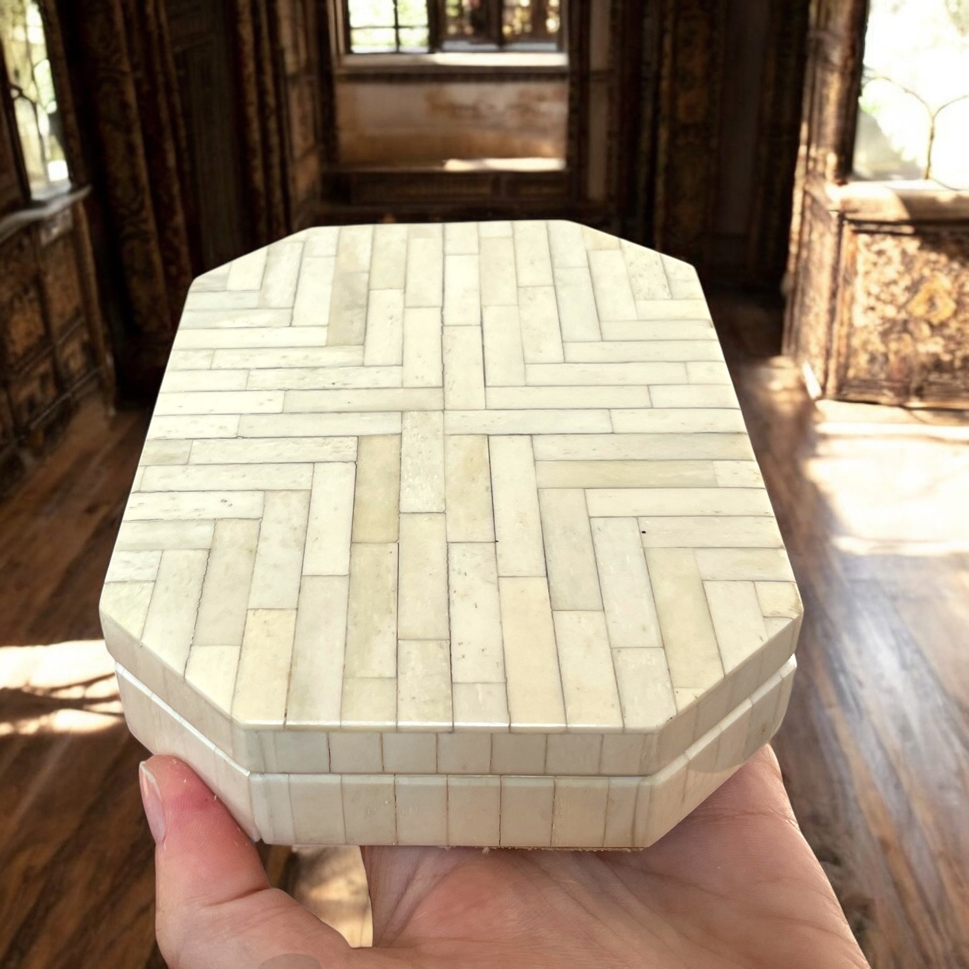 Non era una scatola qualsiasi. Era una piccola architettura di memoria… Questo elegante scrigno ottagonale custodisce il fascino silenzioso dell’Oriente coloniale e il respiro lento delle stanze in penombra, dove il tempo sembrava scorrere più piano. Misura 16x11 cm e la sua superficie, costruita con pazienza certosina da minuscole tessere di osso intarsiate a mano in un raffinato motivo a spina di pesce, ricorda un pavimento antico o l’intarsio di un tempietto in miniatura. Al tatto è fresca e liscia, ma irregolare quanto basta da tradire l’artigianalità del lavoro. All’interno, la semplicità del legno naturale può accogliere piccoli segreti, ricordi, o gioielli dimenticati da generazioni. È un oggetto che racconta: forse era un dono portato da un viaggio lungo, forse faceva parte del corredo di una giovane donna cresciuta sognando terre lontane. Ogni dettaglio parla di un’epoca in cui l’oggetto aveva ancora un’anima. Perfetta da esporre, certo, ma ancora più bella da usare, come scrigno personale di cose preziose.