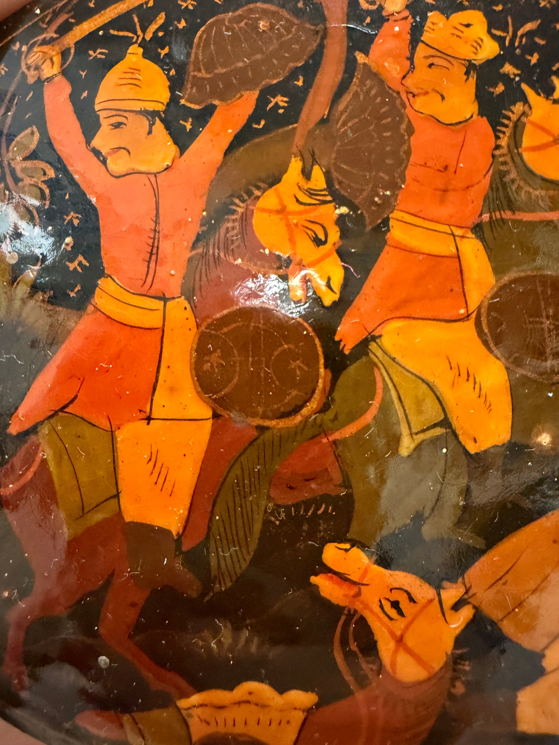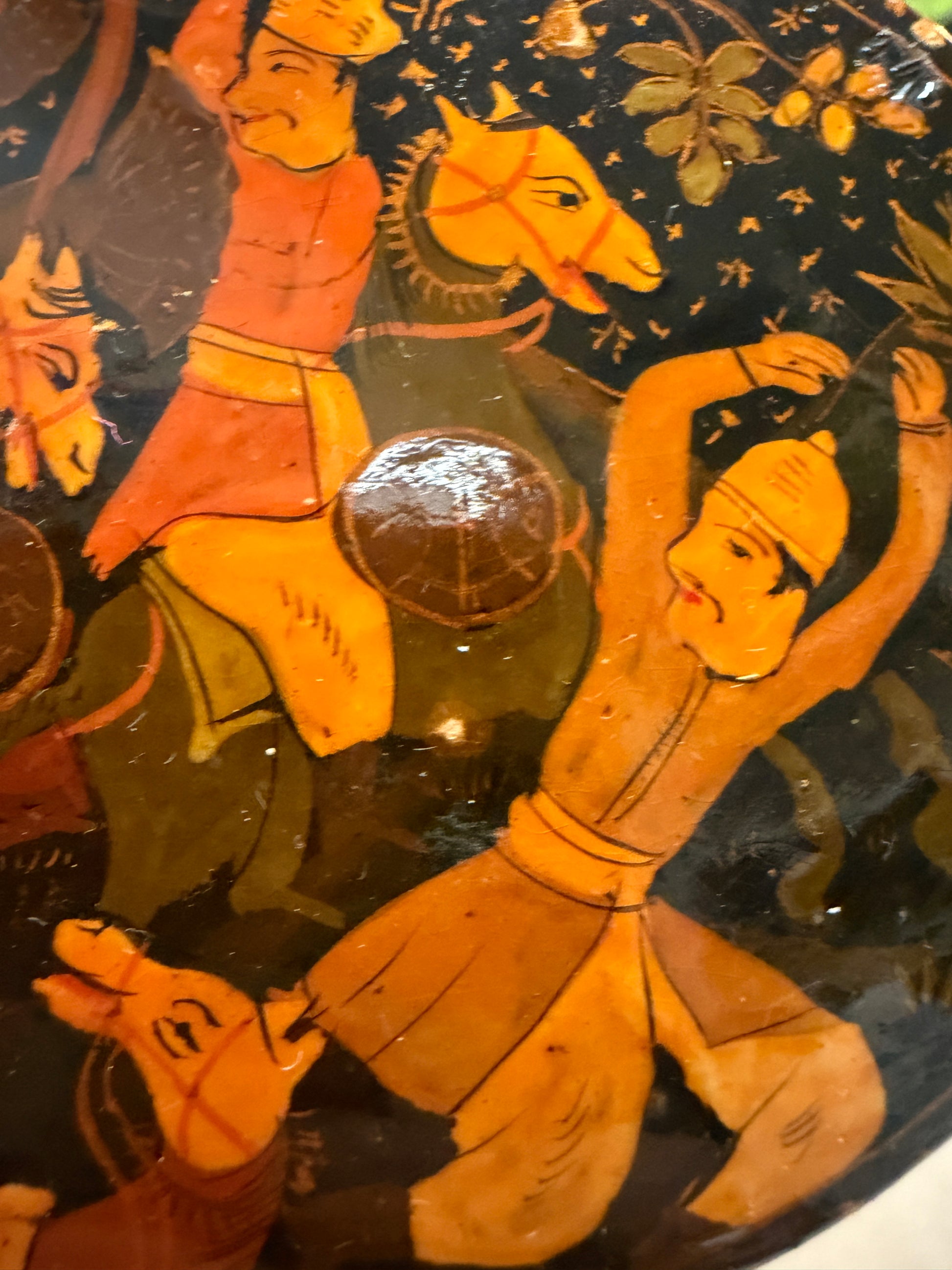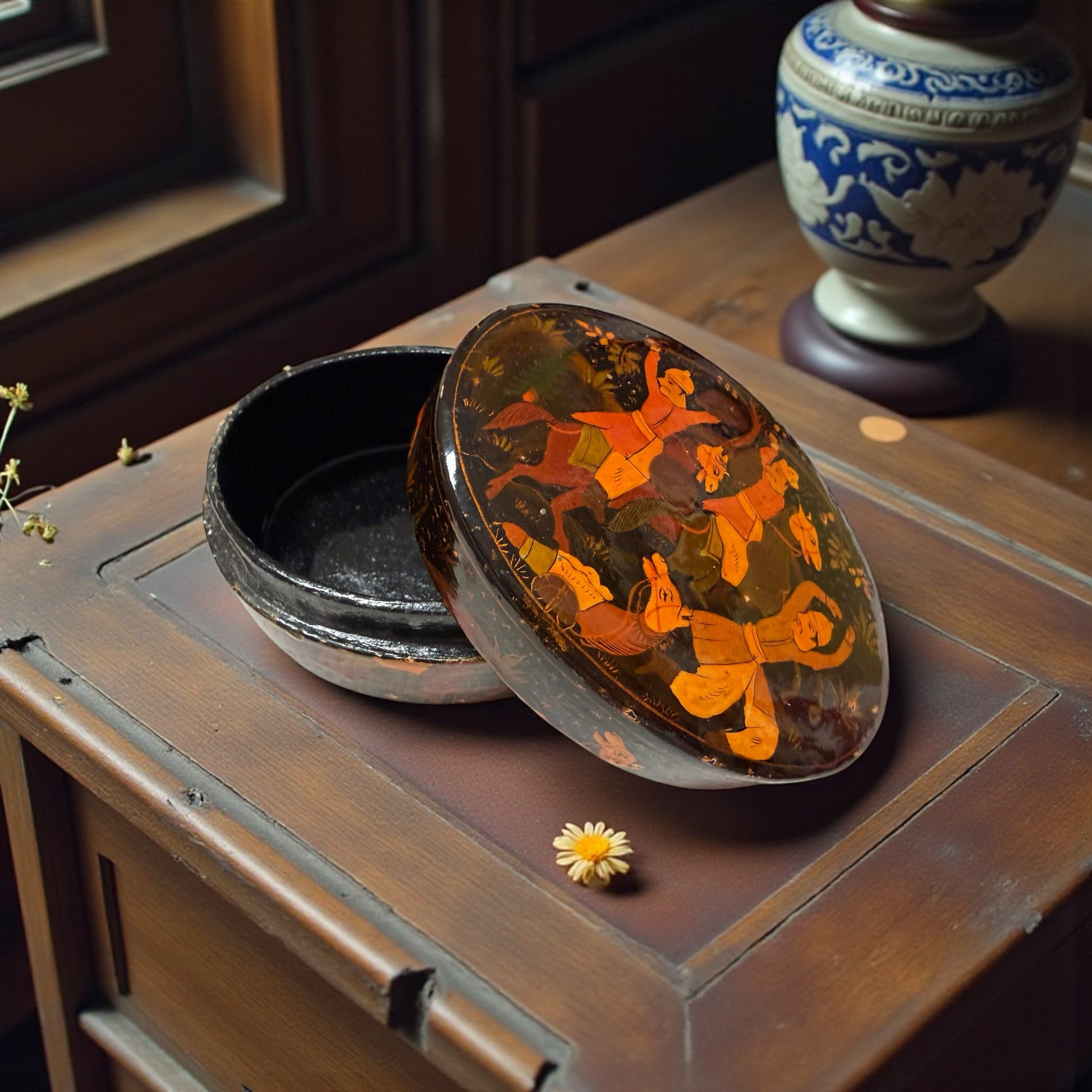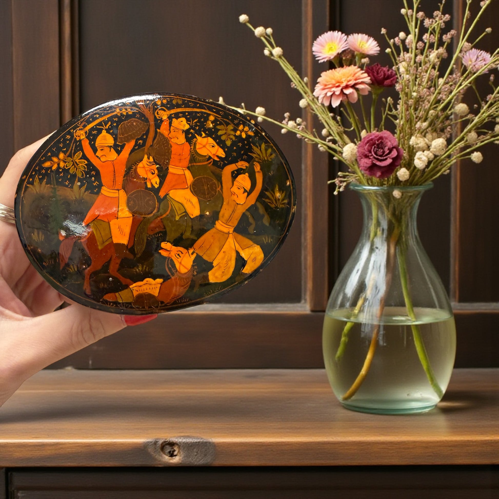 Aprire questa scatola è come sollevare il sipario su una danza che non si è mai fermata. Sotto la lacca scura, figure leggere continuano a muoversi: uomini con turbanti, cavalli stilizzati, braccia alzate in un gesto che sembra rituale, quasi musicale. È una scena viva, ritmata, sospesa nel tempo, dipinta a mano su papier-mâché secondo la tradizione del Kashmir. Questa piccola scatola ovale nasce a Srinagar, e lo racconta senza bisogno di parole: nei colori caldi, nei fondi punteggiati d’oro, nell’equilibrio tra movimento e silenzio. Era pensata per contenere oggetti personali, gioielli o monete, ma oggi custodisce soprattutto un immaginario lontano, arrivato fino a noi attraverso le rotte dell’artigianato d’esportazione. Sul fondo, una vecchia etichetta originale ci restituisce un nome e un luogo precisi: B. Dar & Co., Rainawari, Srinagar – India. Non una firma artistica, ma una traccia autentica di bottega, di mani che hanno lavorato per raccontare storie a chi stava dall’altra parte del mondo. Una famiglia di bottegai che fu attiva circa dal 1850 al 1950. Una scatola piccola, sì. Ma dentro, c’è un intero racconto che aspetta solo di essere riaperto.