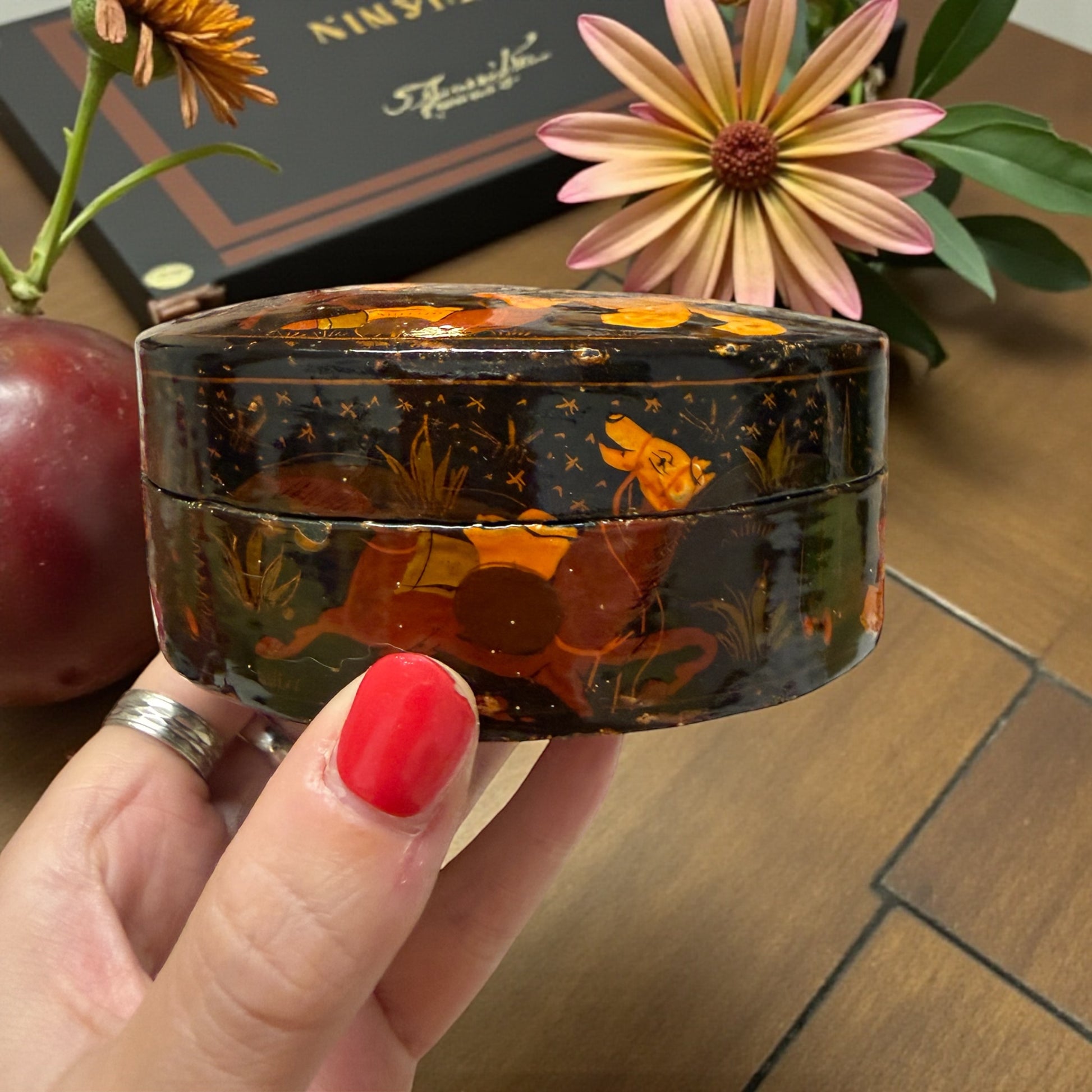Scatola ovale con coperchio in papier-mâché laccato e dipinto a mano. Decorazione: scena figurativa kashmira (figure danzanti, cavalli, vegetazione). Provenienza: Srinagar, Kashmir – India. Etichetta originale: B. Dar & Co., P.O. Rainawari. Epoca: circa anni 1930–1940. Misure: 10,5 × 8 cm – altezza 4,2 cm. Condizioni: buone, con normali segni del tempo coerenti con l’età.