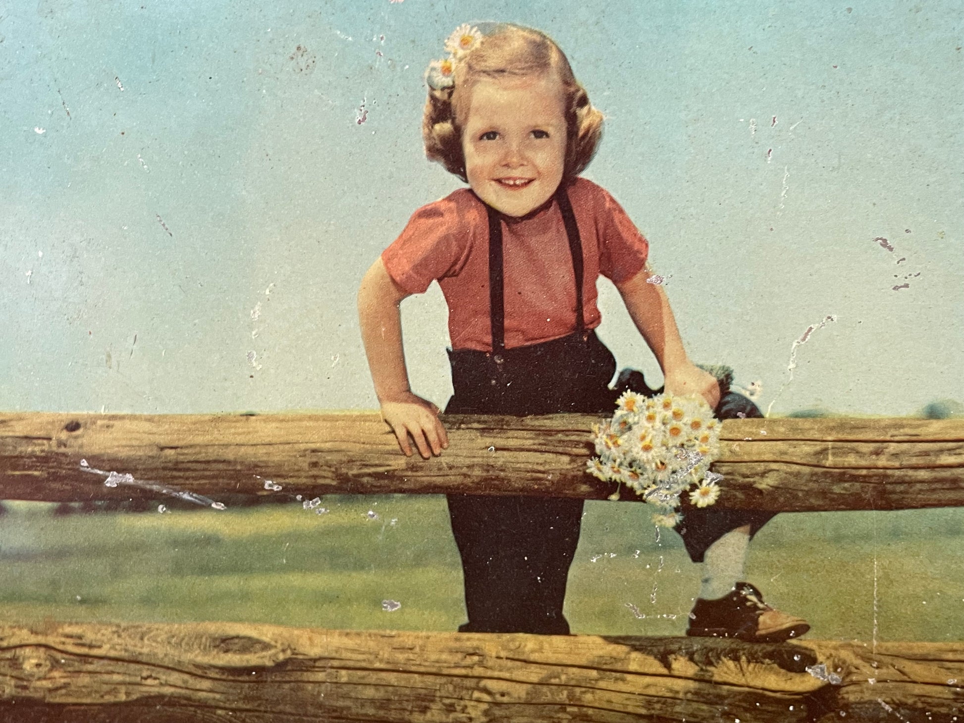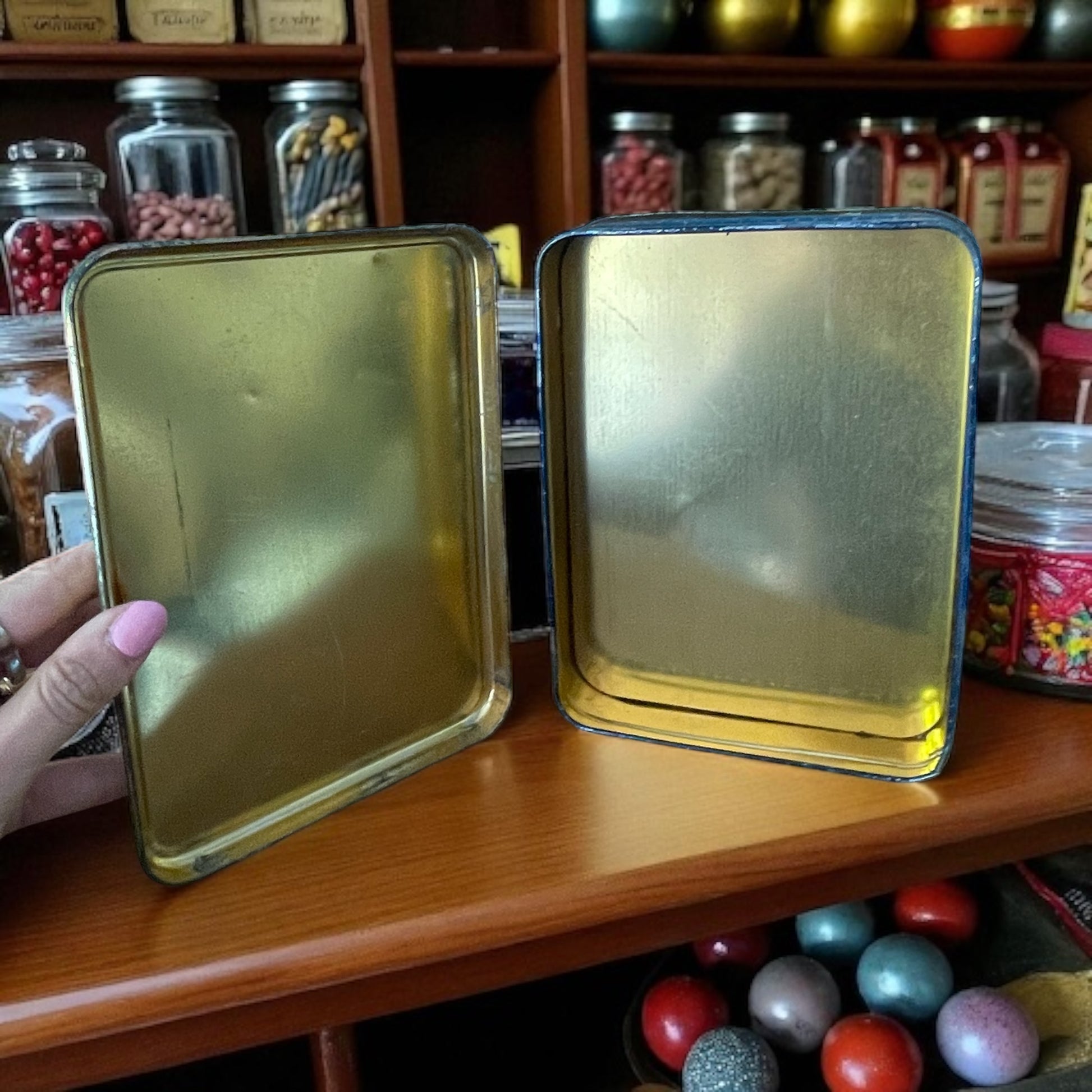 …c’erano piccoli scrigni che sembravano sorridere ai bambini. Questa scatola Preti, con la sua bambina dai ricci biondi e il mazzolino di margherite stretto tra le dita, porta con sé il profumo del dopoguerra e il sapore delle prime caramelle colorate dopo la fame e la paura. Il blu a pois racconta un tempo in cui le confezioni erano pensate per essere conservate, amate, tramandate. E quel sorriso ingenuo, stampato sul metallo, sembra ancora aspettare che qualcuno scelga il suo dolcetto preferito da una mensola di legno lucido, in un negozio profumato di zucchero e liquirizia. Una scatola così non è solo contenitore: è ricordo, infanzia, abbraccio. Perfetta per chi colleziona latta pubblicitaria d’epoca, ma anche per chi cerca un dettaglio poetico da posare su una credenza, tra biscotti e racconti. Dimensioni: 19 x 14 x 4.5 cm.