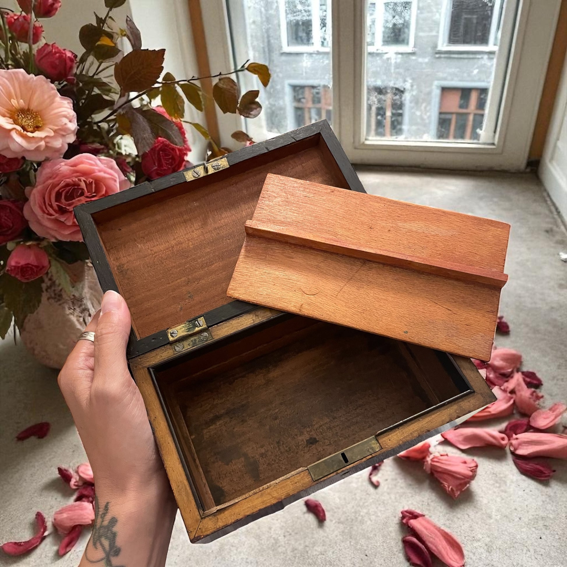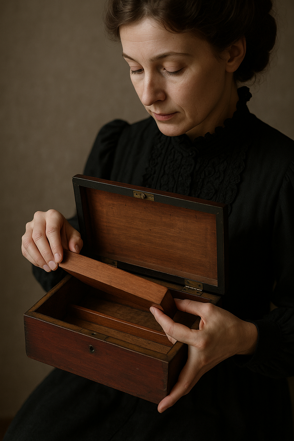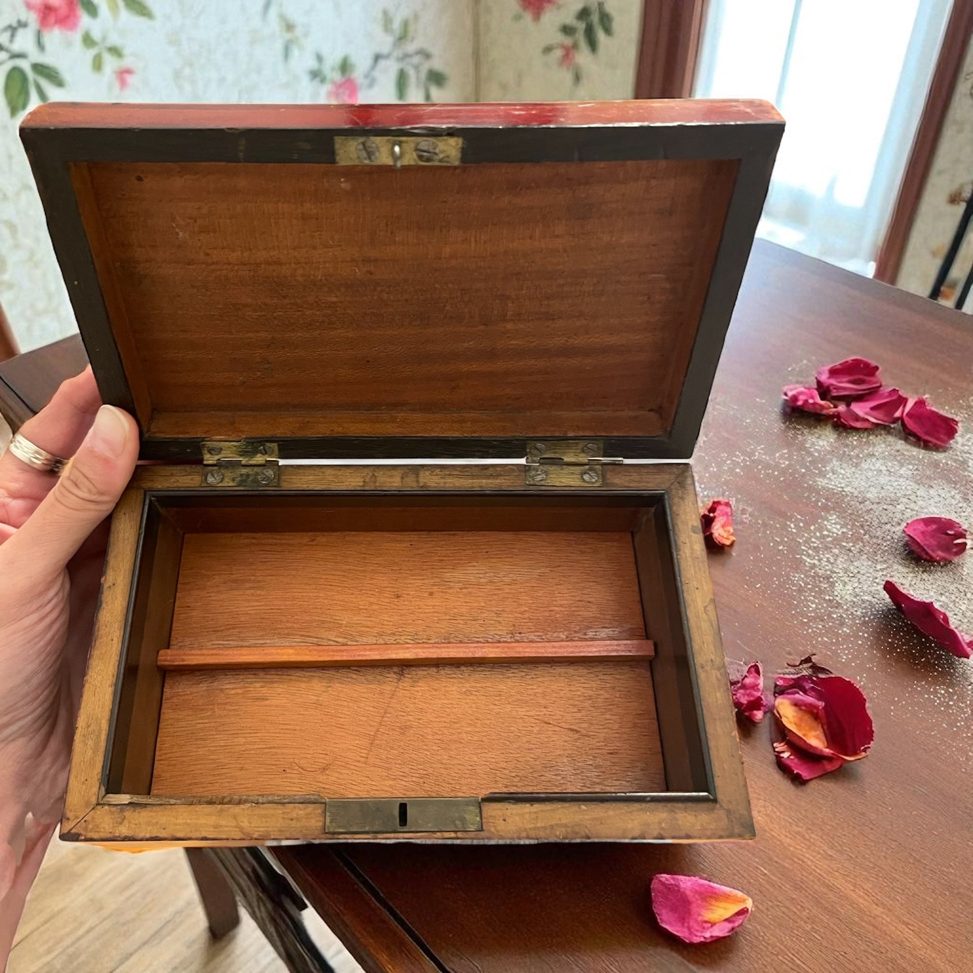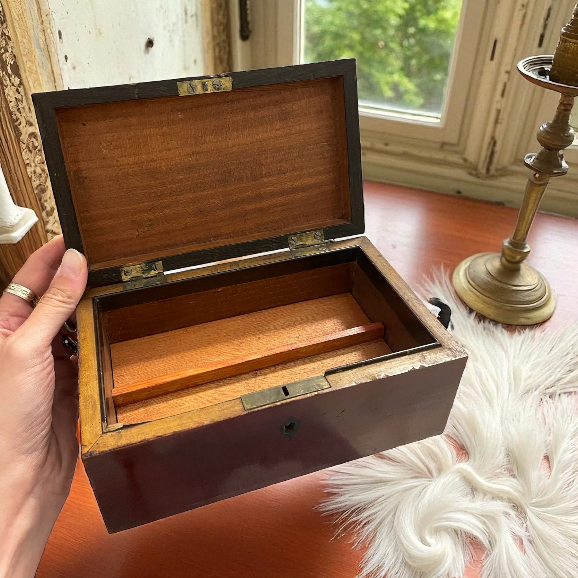 Una semplice scatola in legno, direte. Ma chi la prende in mano scopre presto che custodisce un segreto. Sotto il divisorio, celato da un ingegnoso meccanismo a molla, si nasconde un doppio fondo perfettamente funzionante: un rifugio segreto per gioielli, lettere o piccoli tesori da proteggere da occhi indiscreti. Realizzata tra la fine dell’Ottocento e i primi del Novecento, la scatola porta con sé i segni autentici del tempo: qualche graffio, piccole mancanze nella lucidatura originale, l’assenza della chiave della serratura frontale. Difetti che non tolgono fascino, anzi lo accrescono, perché raccontano di vite passate e di mani che l’hanno aperta con emozione e cautela. Oggi, come allora, il suo valore non sta nel legno e nelle finiture, ma nel gesto segreto che rivela il doppio fondo. Una piccola meraviglia d’ingegno, capace di riportarci al tempo in cui il custodire era un’arte e il mistero un lusso. Naturalmente, a chi l’acquista verranno fornite le istruzioni su come aprire il doppio fondo.
