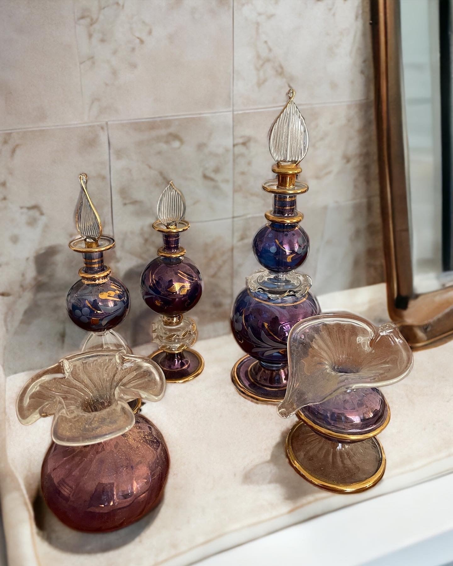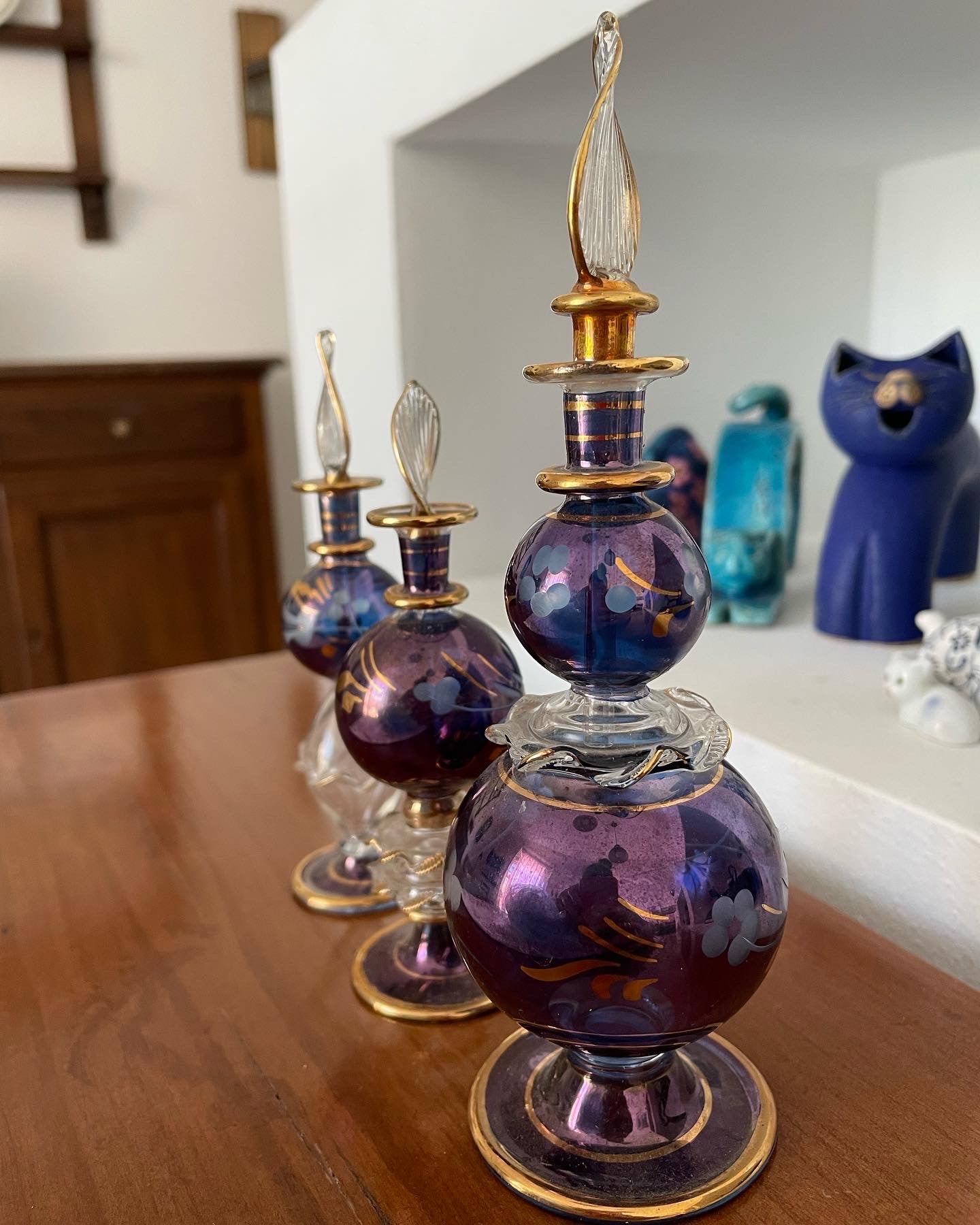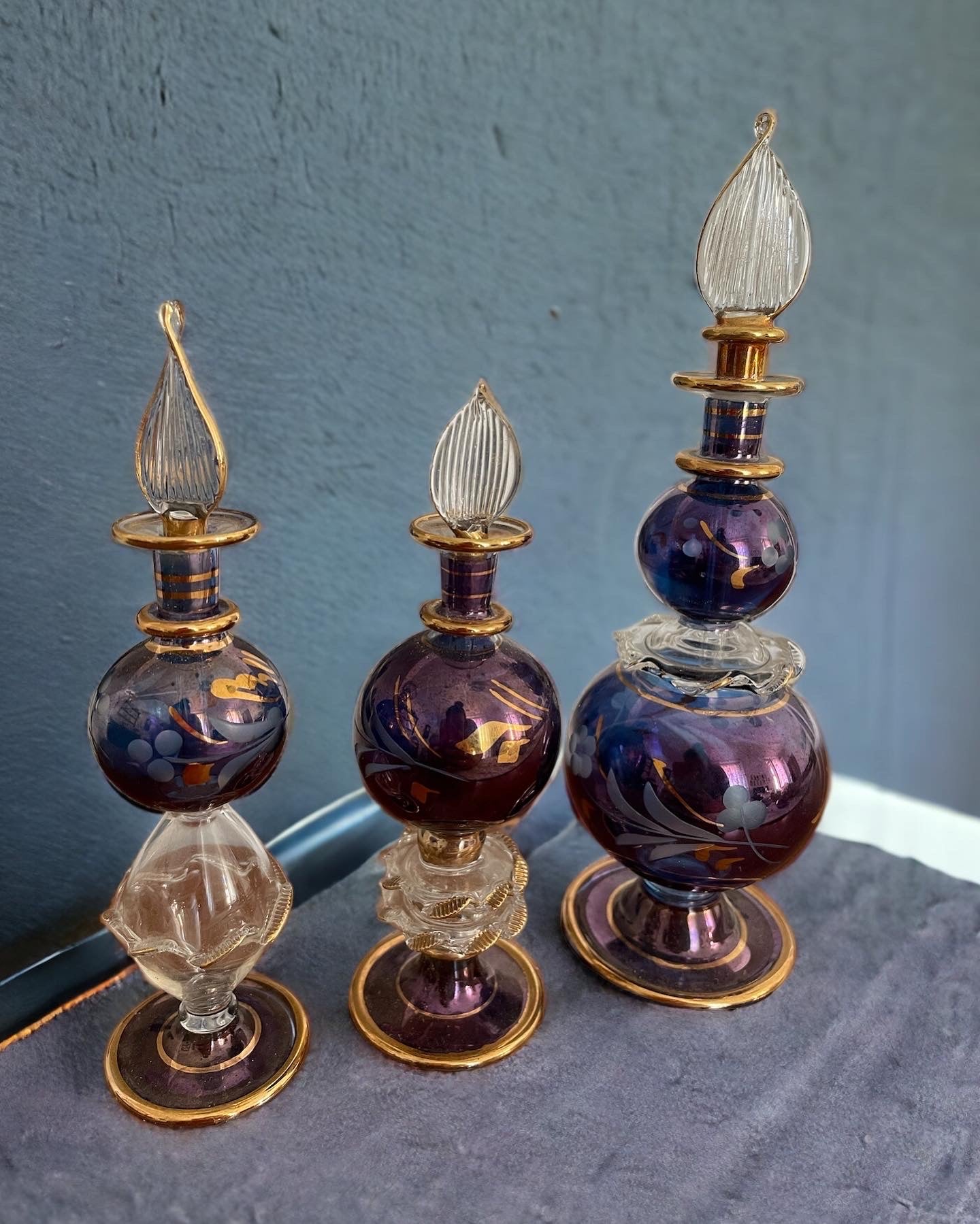 Set of 5 #antique #blownglass #bathroom #glasses: 3 #antique #perfume #bottles and 2 small #vases. The height of the largest #perfume #vial is 19 cm and the smallest measures 15. #Precious decorations on each; beautiful workmanship. Very light and... very delicate, elegant, refined.