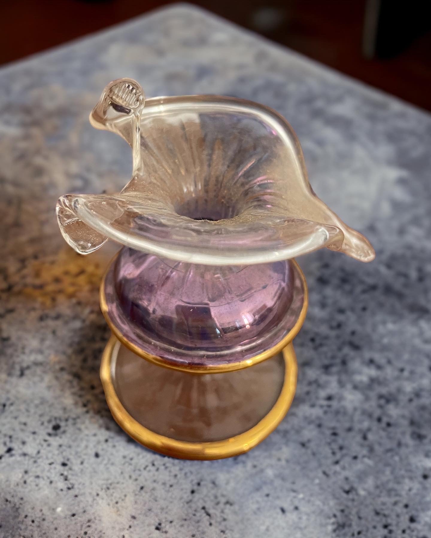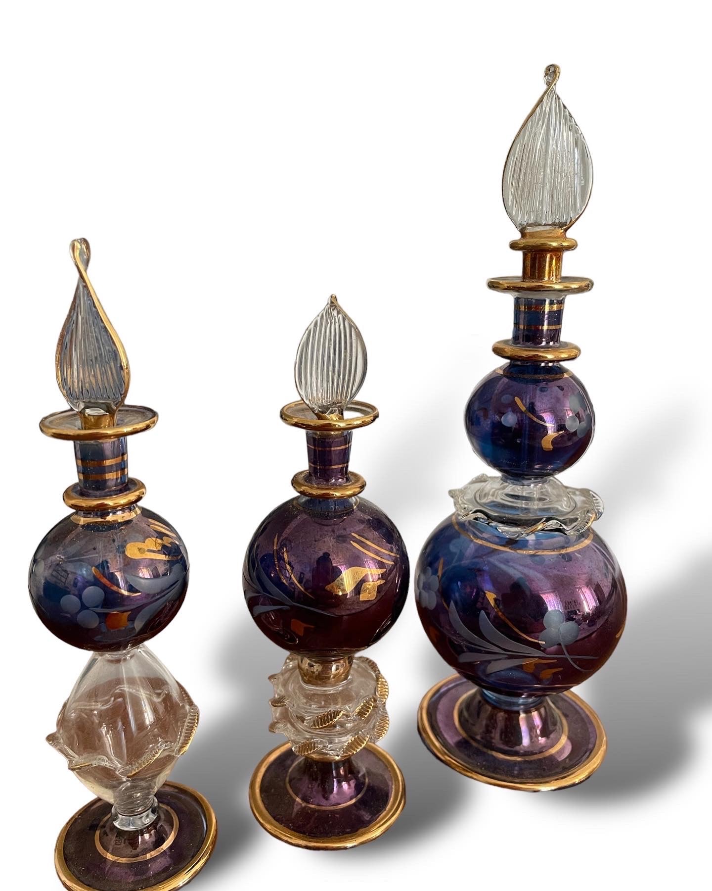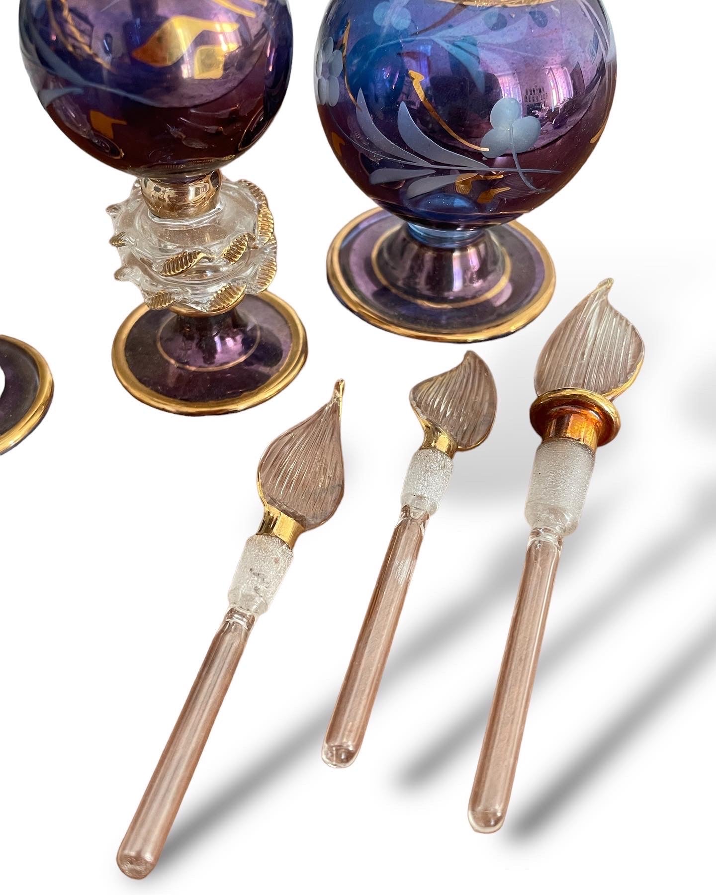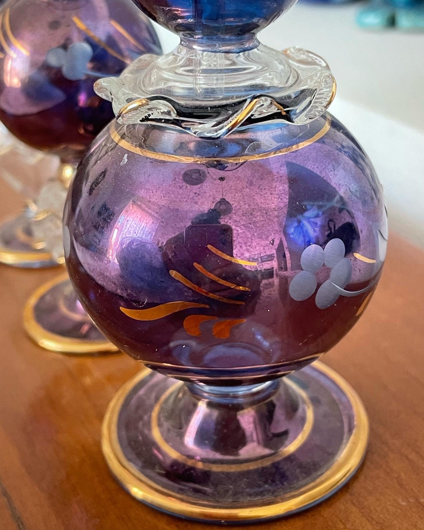 Set of 5 #antique #blownglass #bathroom #glasses: 3 #antique #perfume #bottles and 2 small #vases. The height of the largest #perfume #vial is 19 cm and the smallest measures 15. #Precious decorations on each; beautiful workmanship. Very light and... very delicate, elegant, refined.