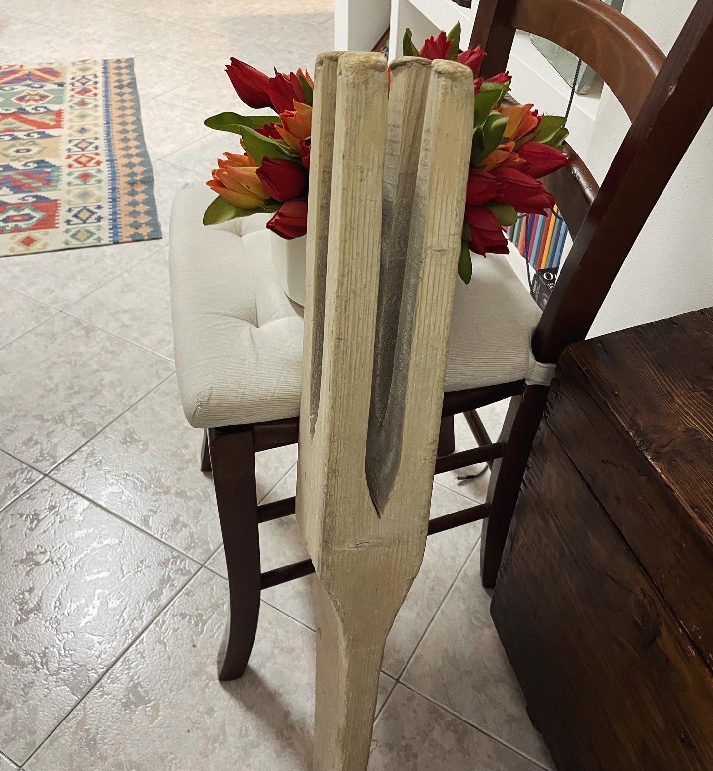 Some objects are so large and so exclusive that they need a known reference: this is why we have displayed them near a chair! So you can realize their size... but above all answer the question: what is it?!? An ancient STIRRER for clothes. Patented in the Victorian era, this model with four wooden arms allowed washerwomen to stir the laundry in boiling water with soda. Bear in mind that it is 81 cm long!! This example was recovered in 1931 (date marked on the wood).