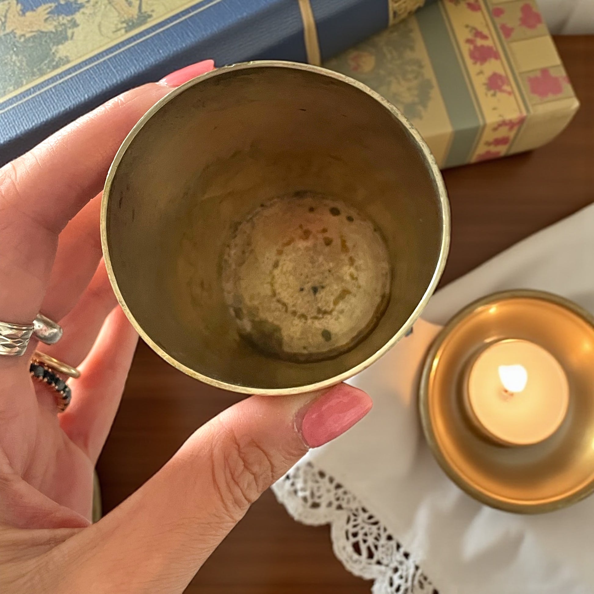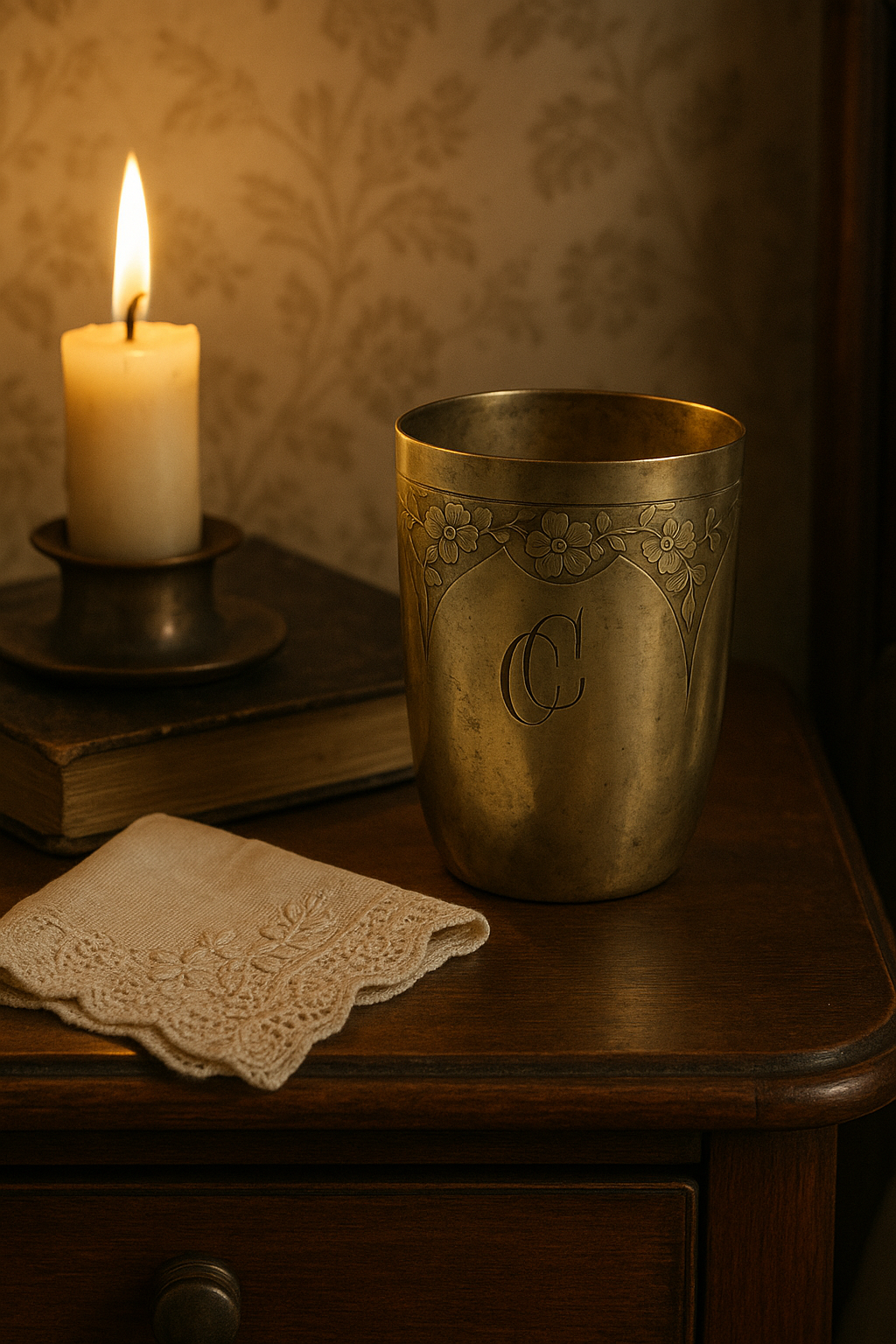 Immagina una camera elegante, rischiarata dalla luce soffusa di una lampada a petrolio. Sul comodino, accanto a un libro rilegato in tela e a un paio di occhiali sottili, riposa questo piccolo bicchiere in metallo bianco inciso, pronto per la consueta bevuta serale d’acqua prima del riposo. Realizzato tra fine Ottocento e primissimi del Novecento, questo bicchiere da camera francese è un delicato esempio di gusto Belle Époque. Il bordo superiore è decorato da un fregio floreale in stile Art Nouveau, mentre al centro campeggia un elegante monogramma inciso “C C”, che racconta l’appartenenza personale e borghese di un tempo in cui anche gli oggetti quotidiani erano segni di stile e intimità. La superficie, con la sua ossidazione autentica e i segni del tempo, restituisce tutta la poesia delle notti silenziose di fine secolo. Un pezzo che non ha perso la sua grazia, perfetto per chi ama circondarsi di storie silenziose e dettagli d’altri tempi 🌿
