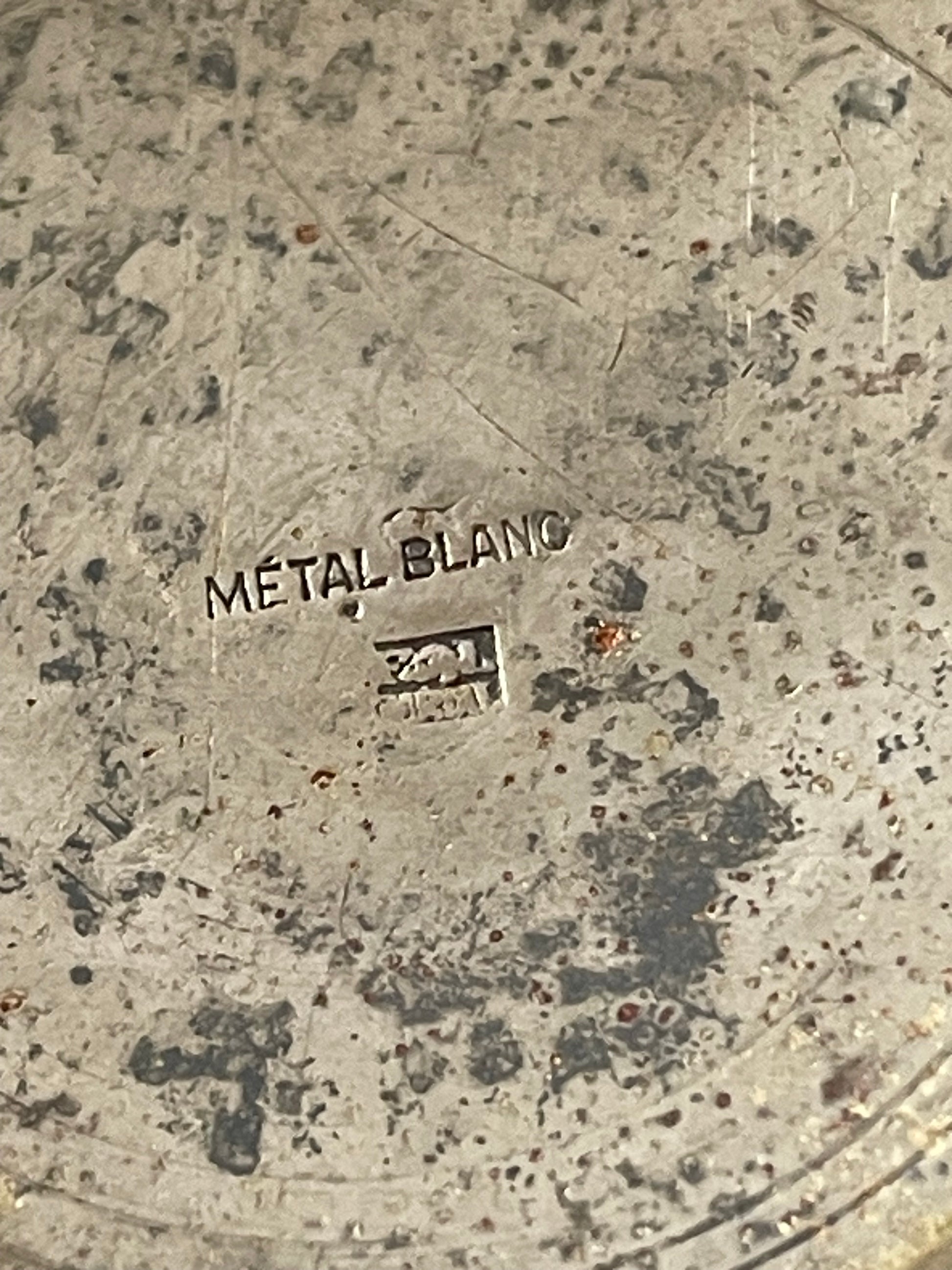Bicchiere da camera inciso. Materiale: Métal blanc (lega francese, argentatura in gran parte consumata). Marchio: “MÉTAL BLANC” + punzone francese. Provenienza: Francia. Epoca: Fine XIX – inizio XX secolo (circa 1890–1910). Stile: Art Nouveau / Belle Époque