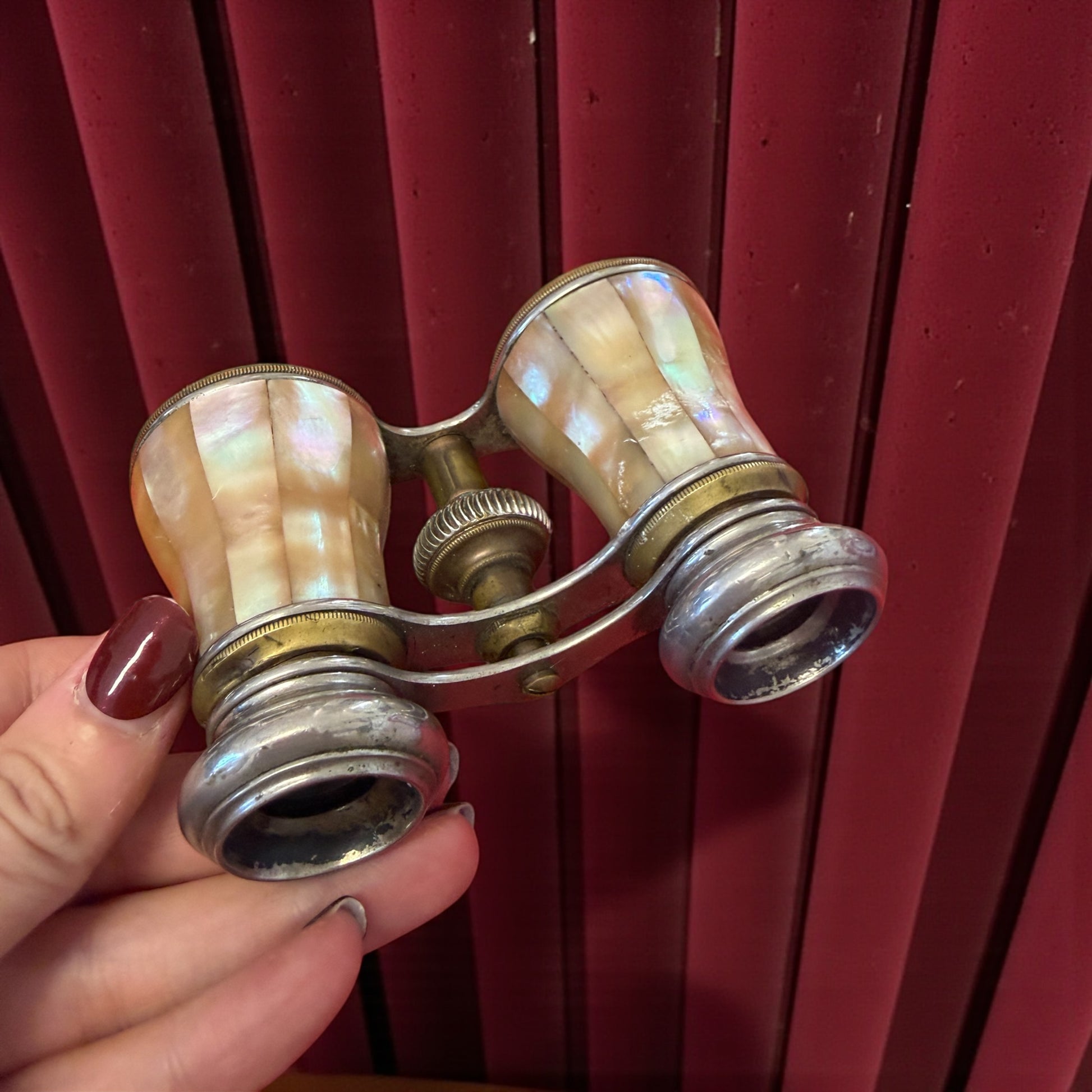 Ci sono oggetti nati per guardare il mondo da vicino, senza farsi notare. Questo binocolo da teatro racconta l’eleganza silenziosa delle sale ottocentesche, quando lo sguardo era un gesto educato e la curiosità un fatto privato. Il corpo è rivestito in madreperla, luminosa e vibrante, capace di catturare la luce con riflessi cangianti che cambiano a ogni movimento. La struttura in metallo e ottone incornicia le superfici con equilibrio, mentre la rotella centrale di regolazione, perfettamente funzionante, restituisce ancora oggi una messa a fuoco fluida e precisa. Le lenti sono in ottimo stato, limpide, pronte a fare il loro lavoro come allora. Solo osservando con attenzione si notano lievissime schiacciature sui bordini in ottone delle lenti frontali: tracce minime di vita vissuta, che non compromettono né l’uso né l’armonia dell’insieme. È un oggetto che porta con sé l’atmosfera dei teatri illuminati, dei velluti rossi, delle attese prima che il sipario si apra. Un pezzo pensato per essere usato ma anche per abbellire come gioiello esso stesso, oggi capace ancora di emozionare chi ama osservare i dettagli da una distanza scelta.