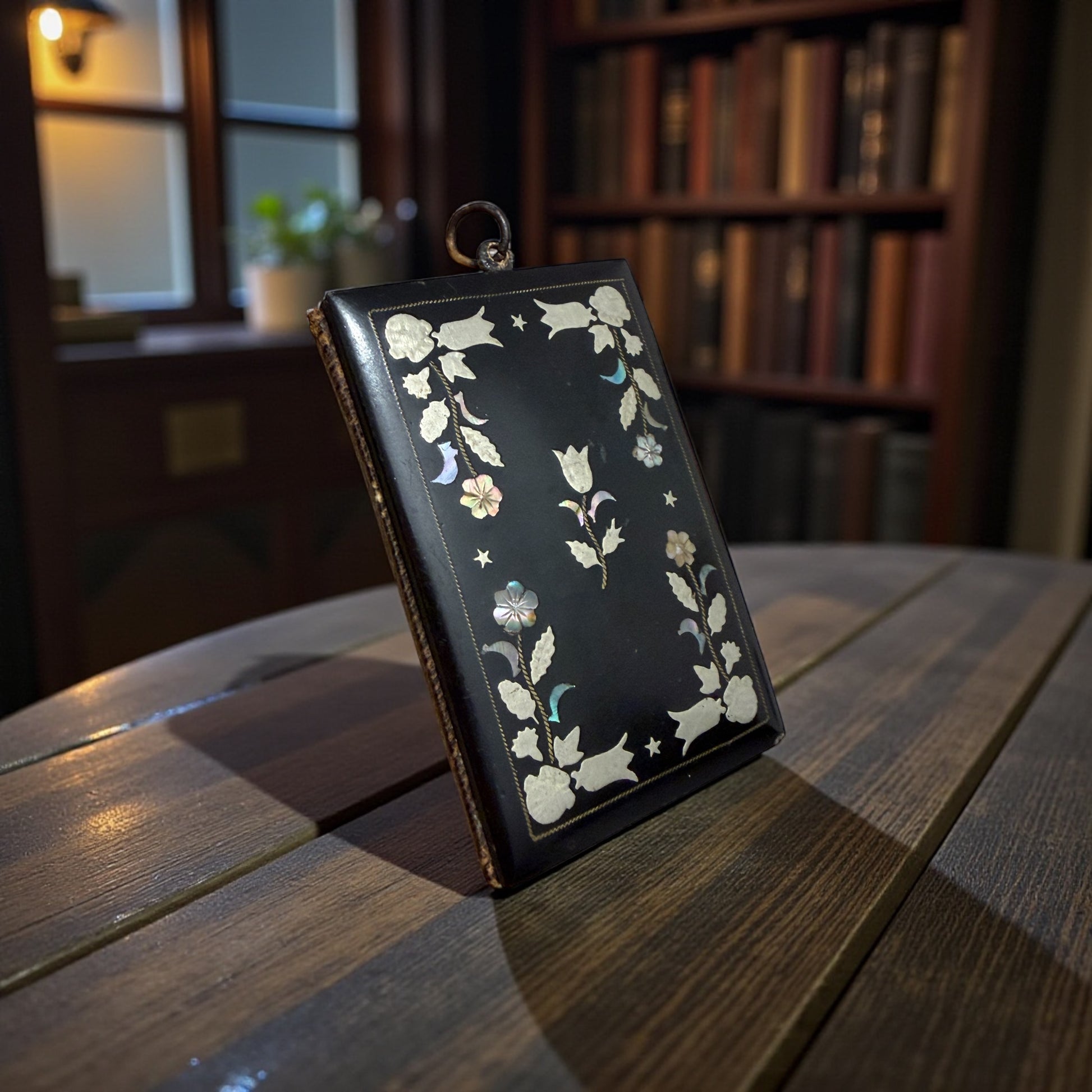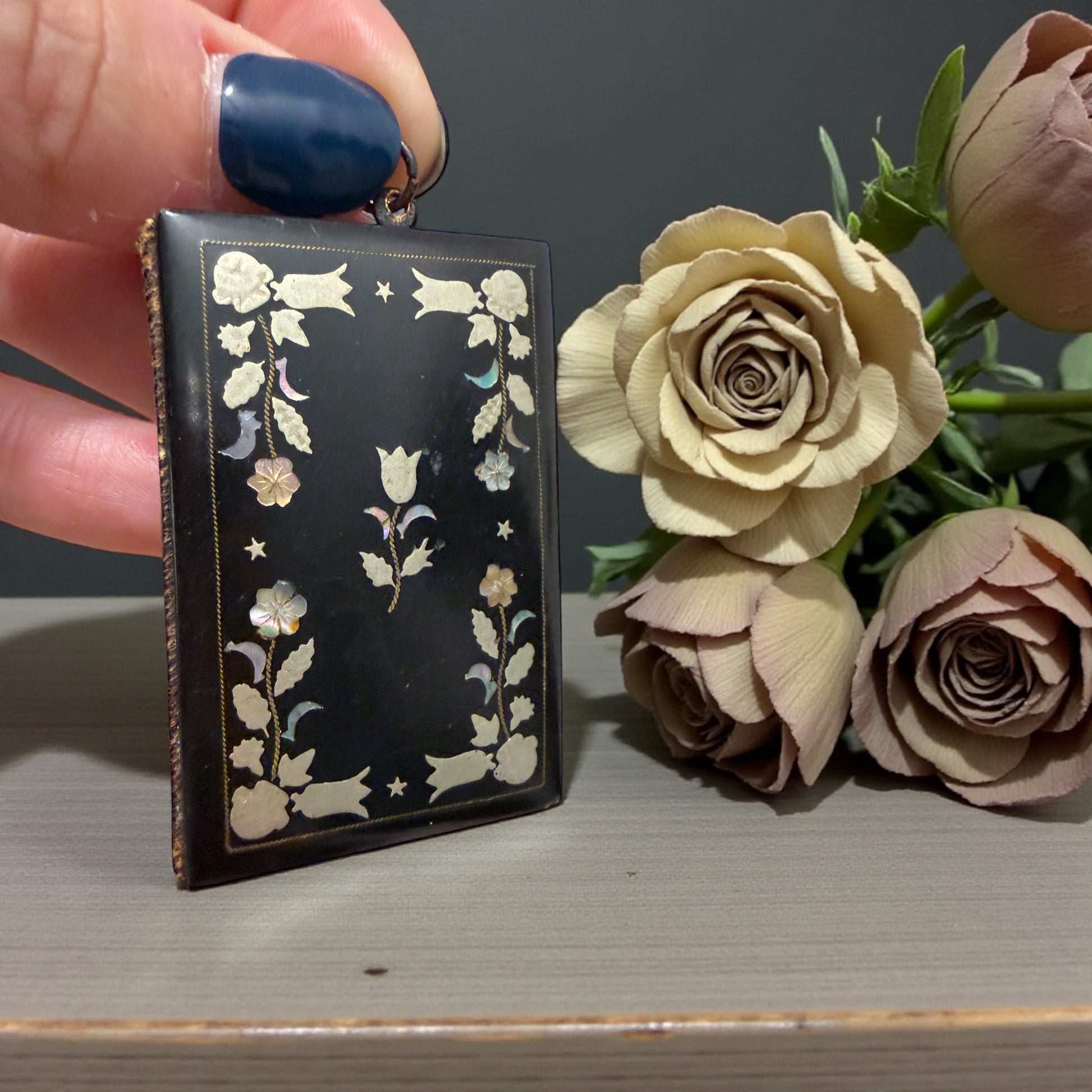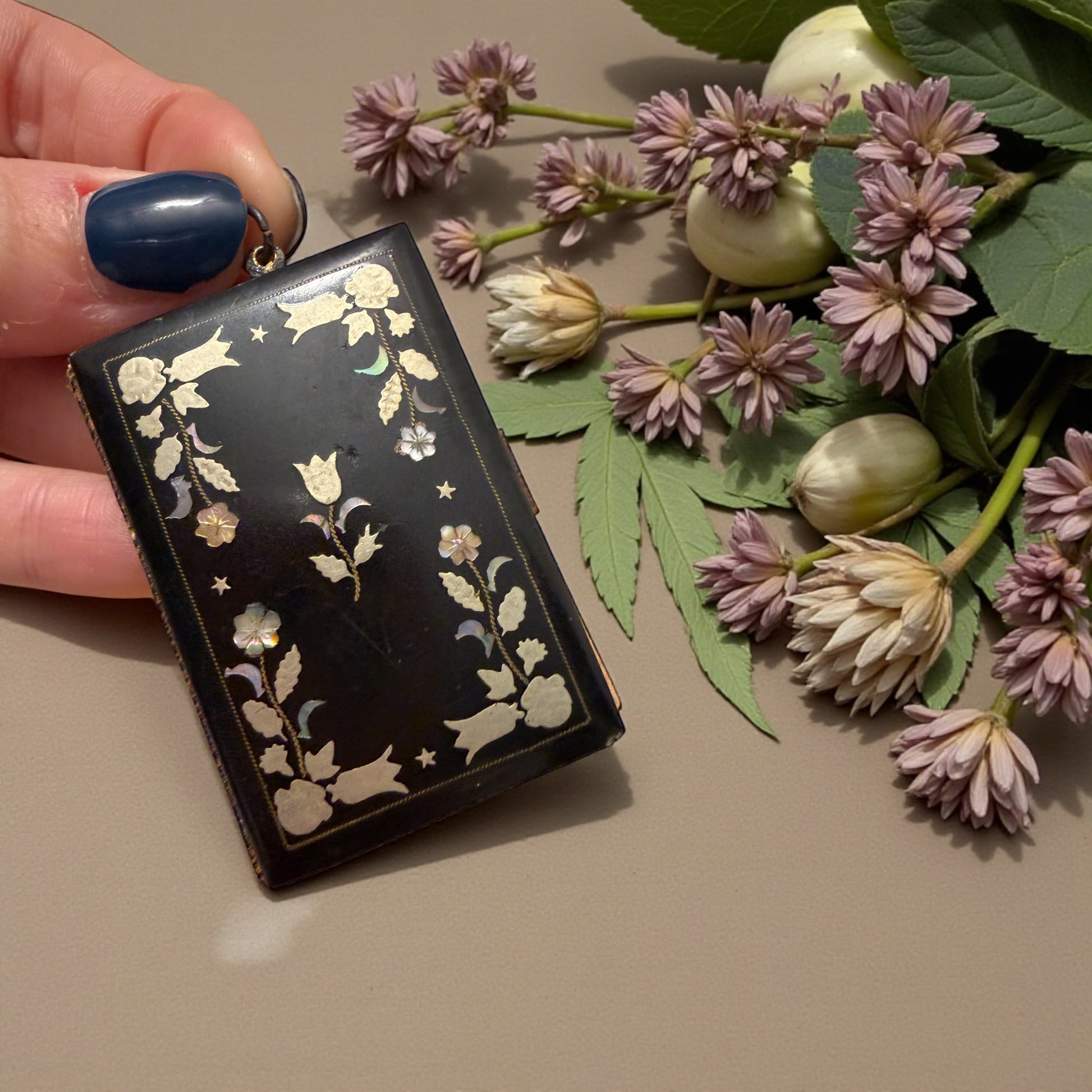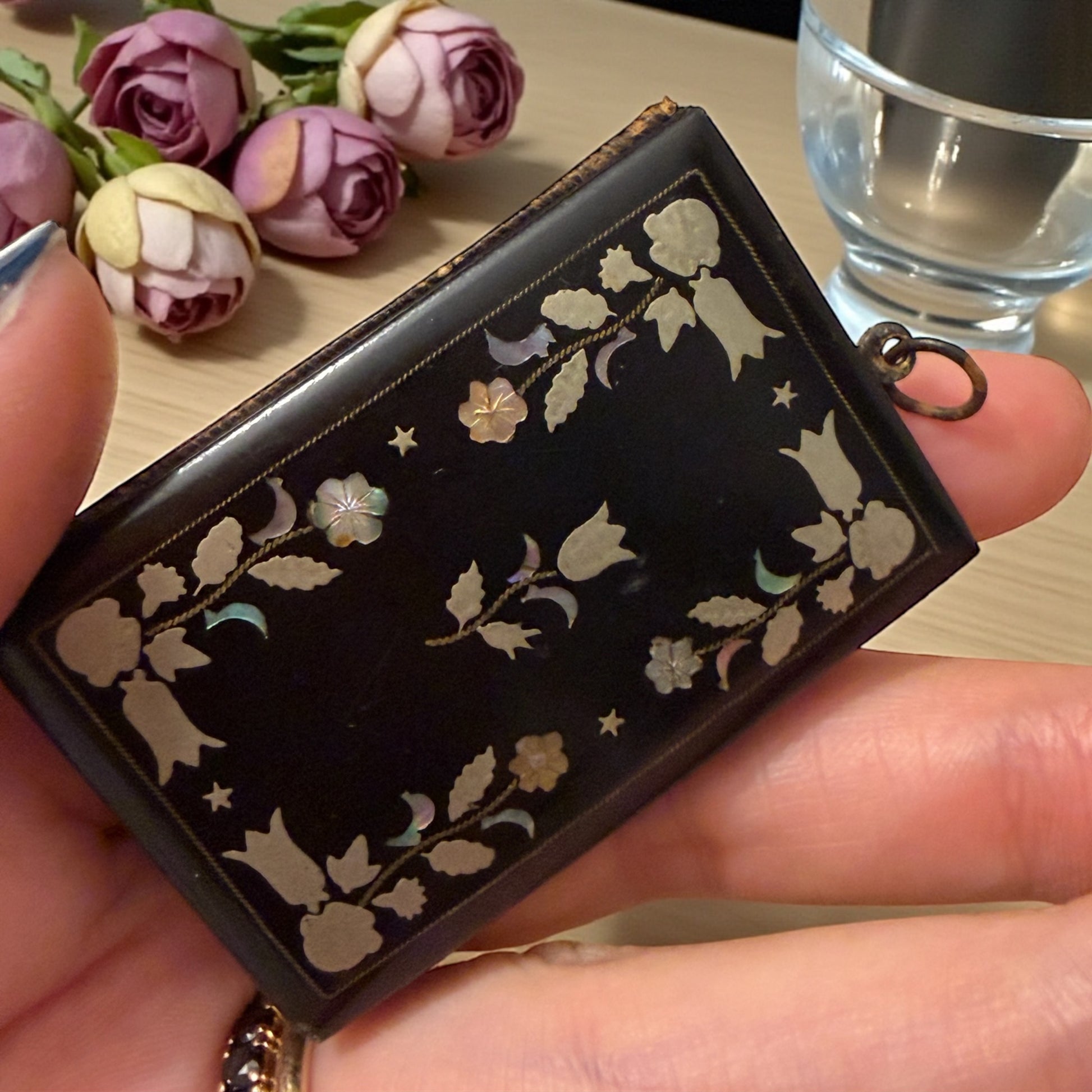C’era un tempo in cui anche un nome scritto a matita meritava un oggetto speciale. Questo carnet de bal nasce per essere tenuto al polso o alla chatelaine, tra un valzer e una quadriglia, mentre la musica riempiva le sale illuminate. La copertina nera è decorata da un raffinato intreccio floreale: inserti argentati e splendida madreperla naturale, ancora tutta presente, viva, cangiante. All’interno restano due fogli originali, silenziosi, come se aspettassero ancora un nome. La matitina non c’è più, ma l’anellino è al suo posto, testimone discreto di un gesto ripetuto mille volte: annotare, sorridere, chiudere, tornare a danzare. Un piccolo oggetto da collezione, poetico e colto, che oggi può vivere come oggetto da vetrina, porta-messaggi, o semplice frammento di memoria da custodire.