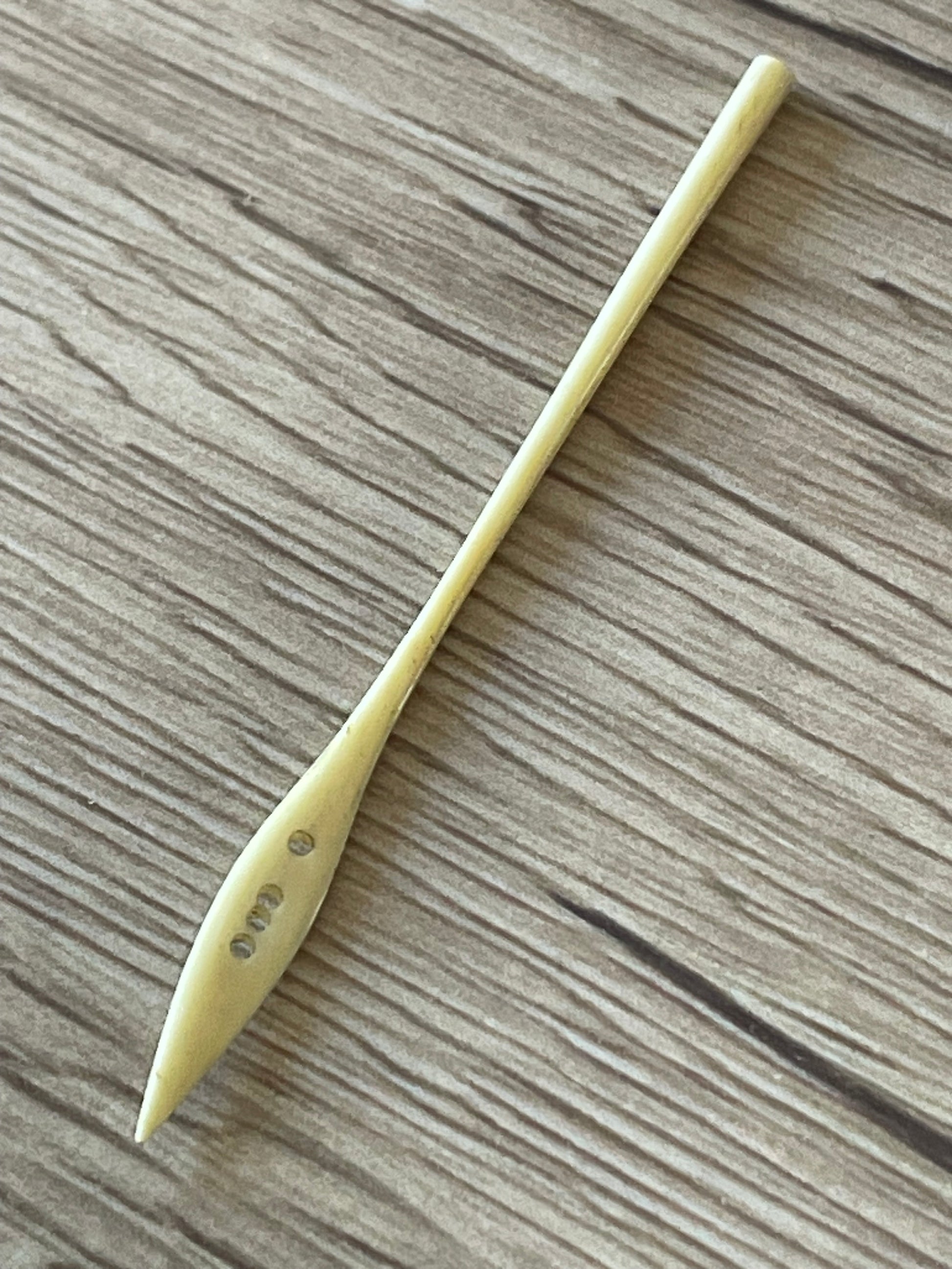 • Alesatore in osso forato, veniva usato per allargare con delicatezza asole e fori nei tessuti, ma anche per guidare passamanerie o come micro-uncinetto nei lavori più minuti.