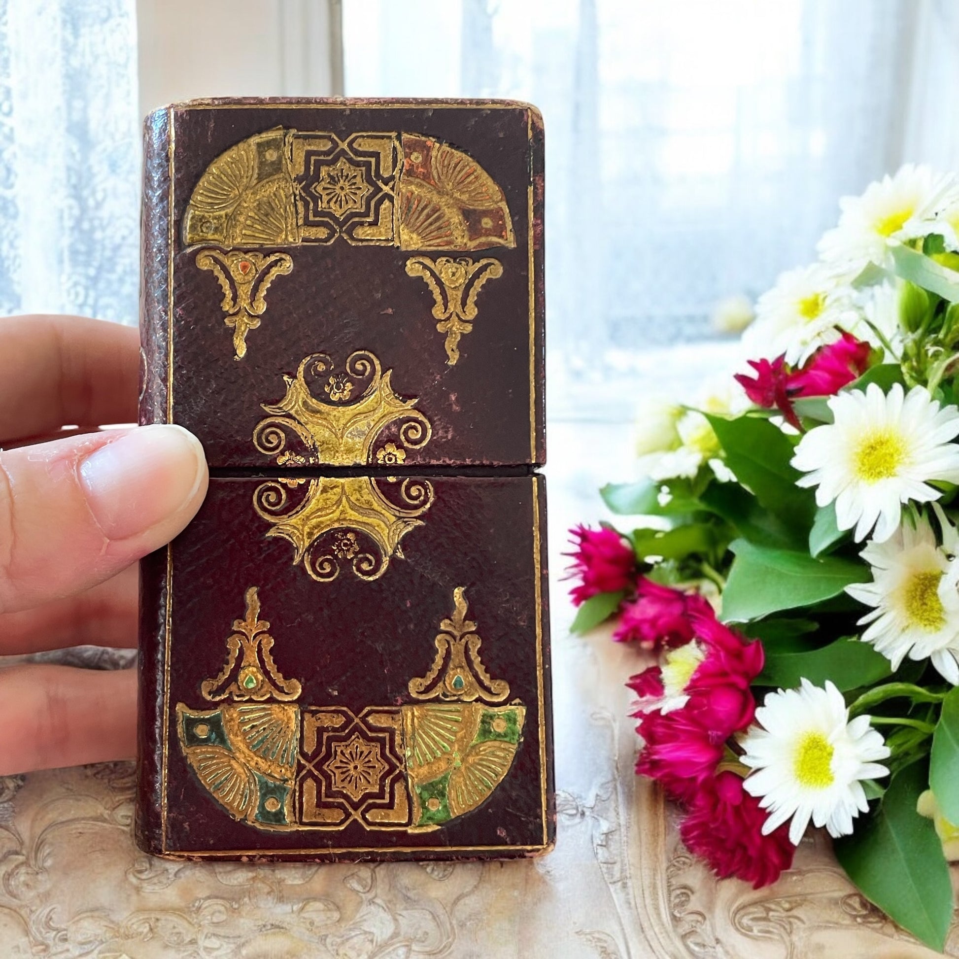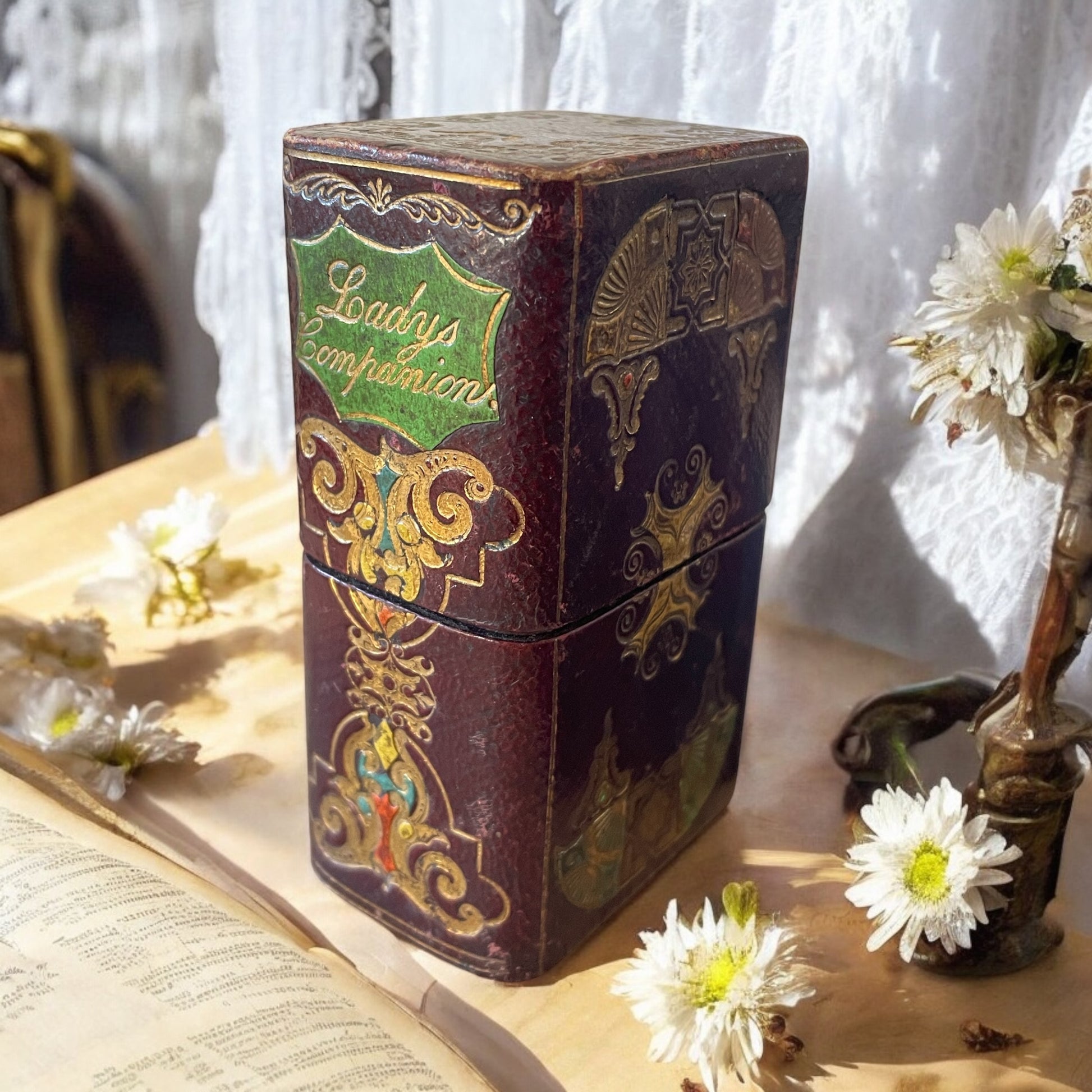 “Lady’s Companion” – Kit da cucito da viaggio, fine XIX secolo. Sul tavolino di una dama vittoriana, tra una tazza di tè e un romanzo rilegato in cuoio, poteva trovarsi proprio lui: un raffinato Lady’s Companion, piccolo scrigno tascabile pensato per contenere tutto il necessario per i lavori d’ago. Realizzato con elegante rivestimento simil libro, bordeaux, decorato con motivi dorati e smaltati in stile orientaleggiante, questo cofanetto si apre in due sezioni su un interno di velluto rosso, a protezione degli oggetti contenuti. Al suo interno troviamo: