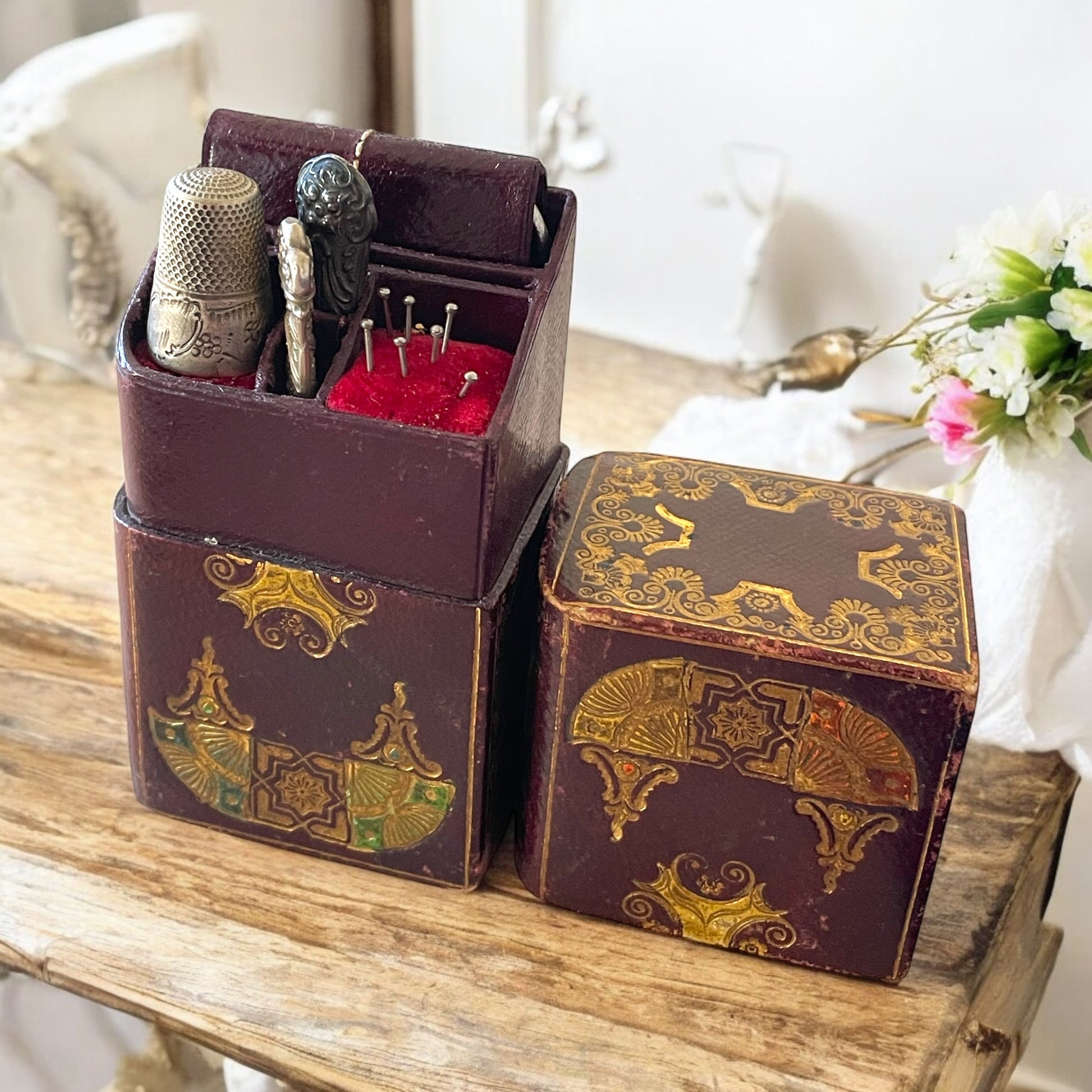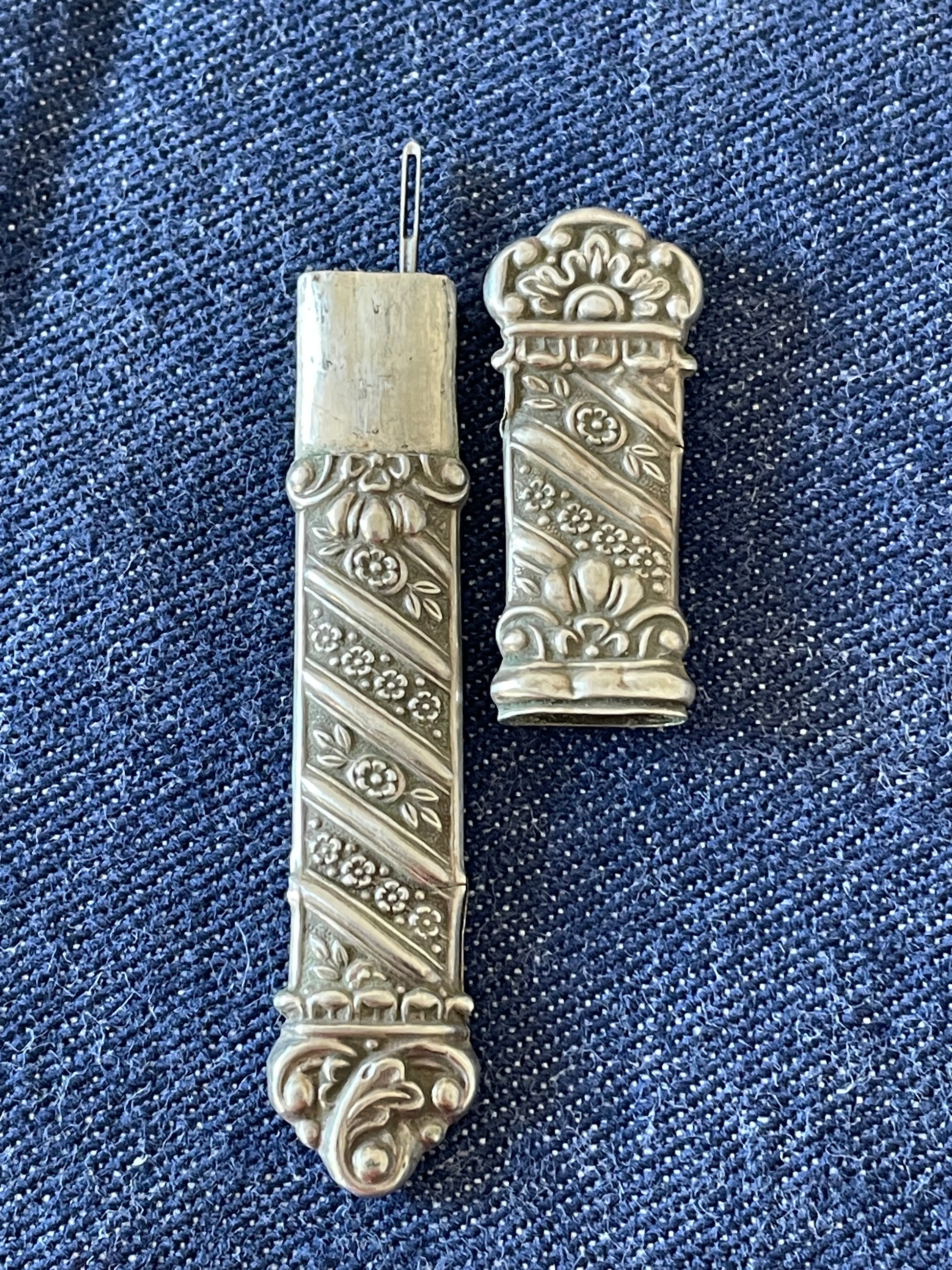 • Porta-aghi decorato in metallo cesellato, con motivo floreale a rilievo.