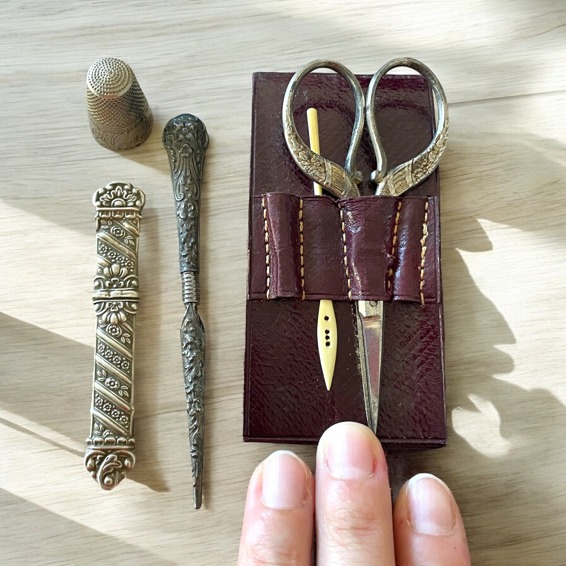 Chi lo ha posseduto un tempo forse lo portava con sé in viaggio, custodito tra biancheria finemente piegata e libri di preghiera. Forse era un dono ricevuto in giovane età, parte di un corredo curato con amore. È facile immaginare le mani che hanno sfiorato questi strumenti, i pensieri che li accompagnavano, la soddisfazione di ogni punto eseguito con cura. Oggi, questo Lady’s Companion non è solo un insieme di oggetti. È una testimonianza silenziosa di gesti antichi, di un tempo in cui la pazienza era un’arte e ogni strumento parlava di un’intimità femminile fatta di creatività, precisione e dedizione.