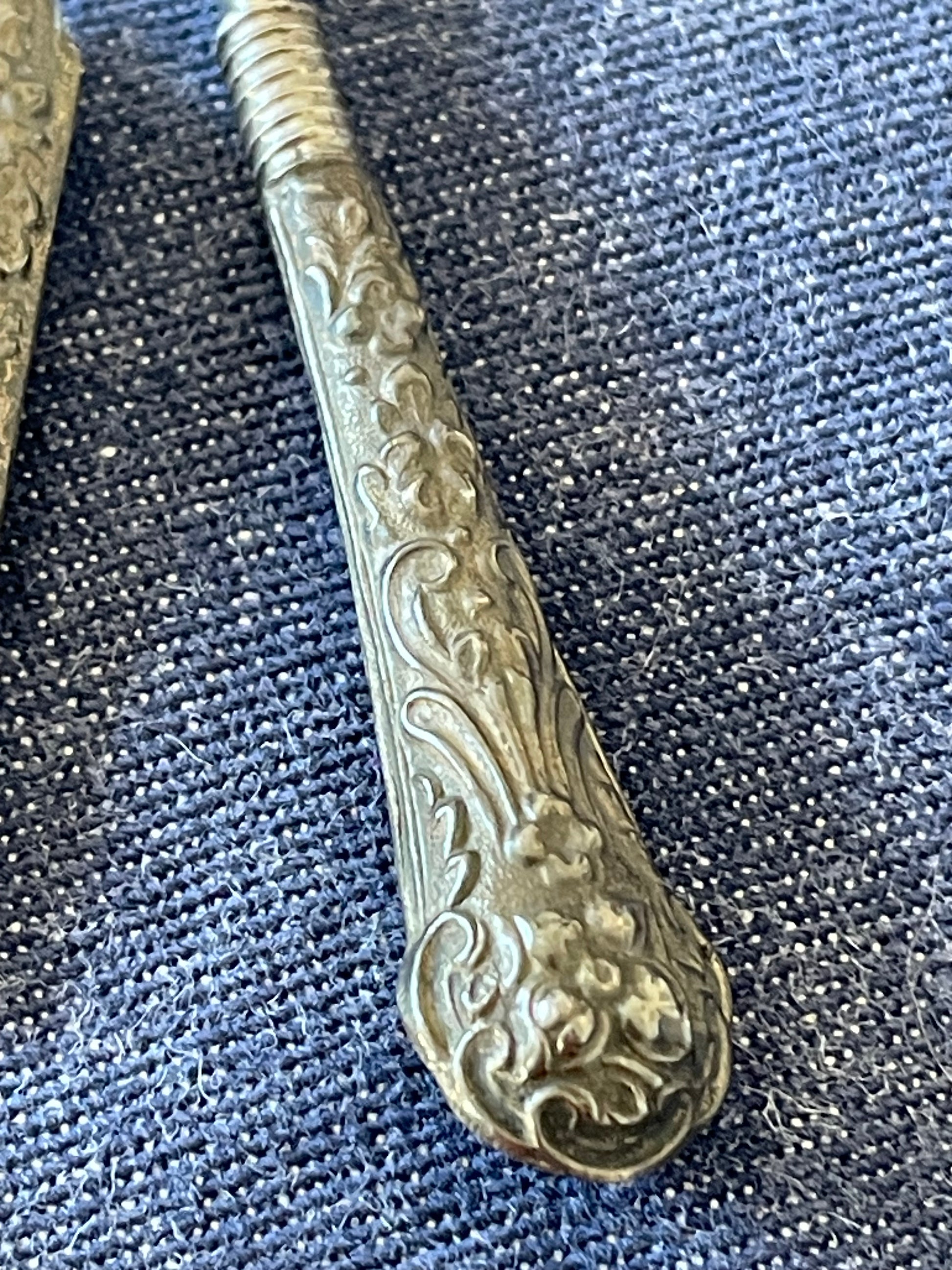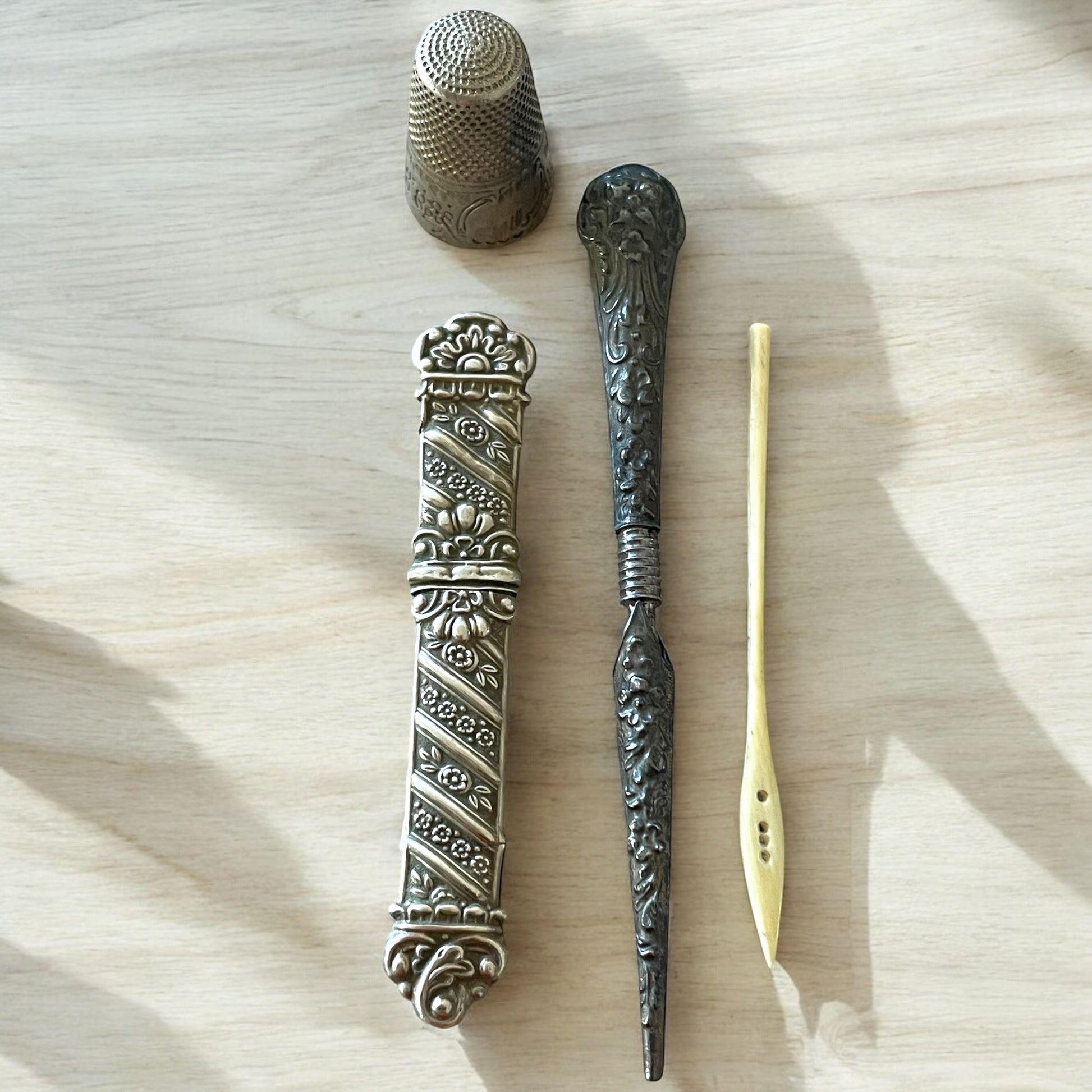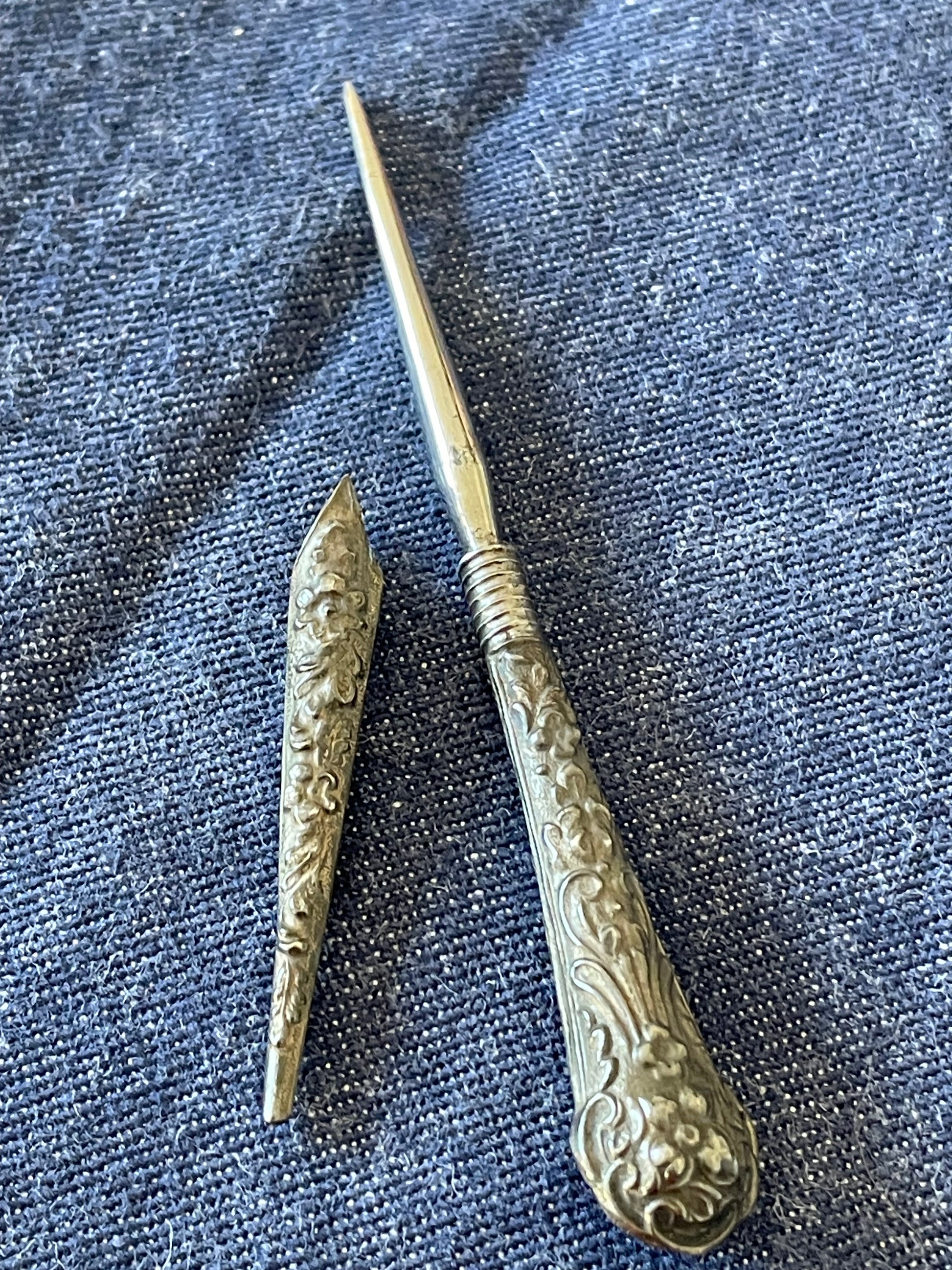 • Pungigrafo (o stiletto da ricamo) con manico e proteggi punta in argento e punta in acciaio: impiegato per forare delicatamente tessuti spessi o per creare fori guida nei lavori di broderie anglaise e merletti, era anche usato per spingere fili e nodi con precisione.
