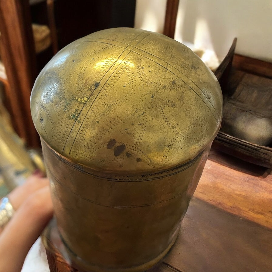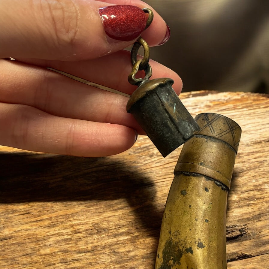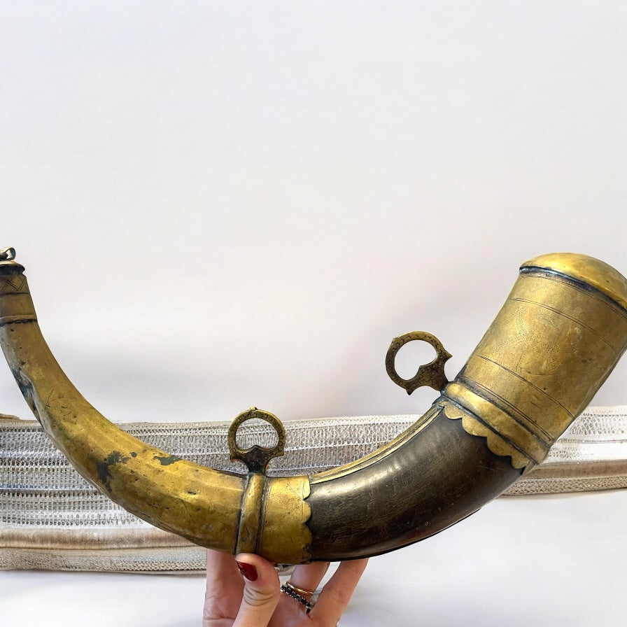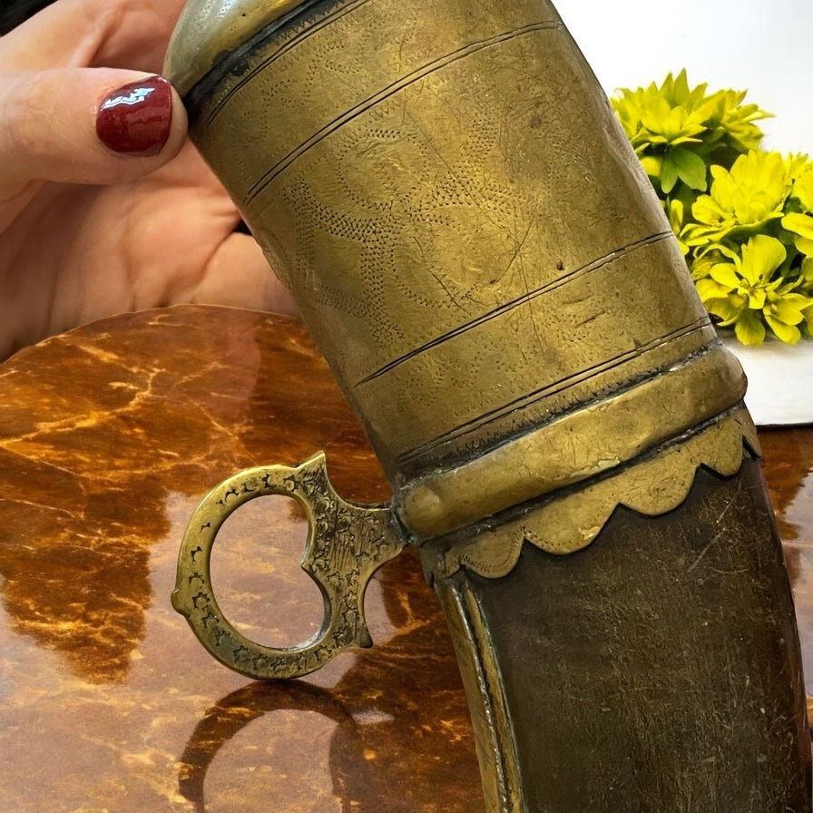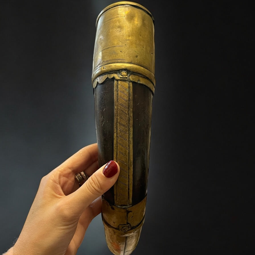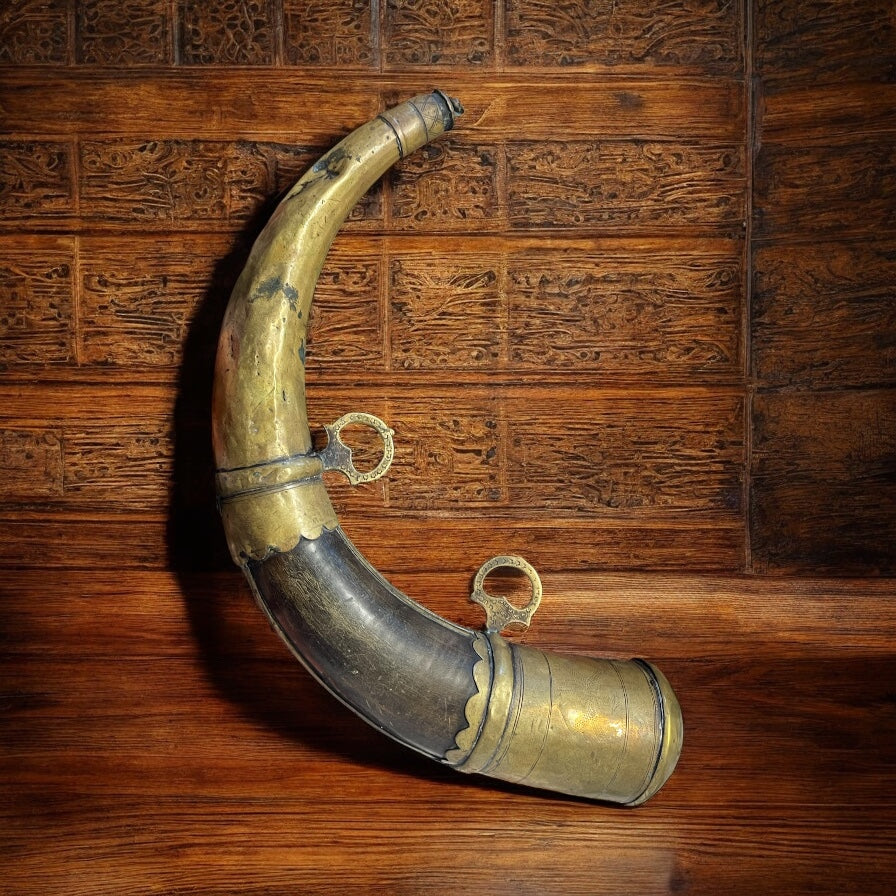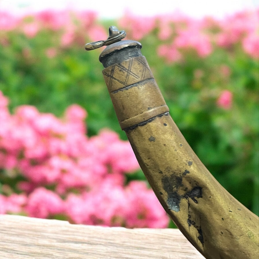 Tieni tra le mani un oggetto che ha attraversato boschi silenziosi, bivacchi fumosi e polvere da sparo. È un corno da polvere ottocentesco, un frammento di epoche in cui il metallo si lavorava con lentezza, a colpi di cesello, e il corno animale si trasformava in custode di precisione e sopravvivenza. Avvicinandolo al viso, potresti percepire ancora quel profumo antico, misto a ottone scaldato dal tempo, cuoio, e un vago sentore di zolfo ormai attenuato ma mai scomparso. È il respiro di una storia che si annida nelle trame della materia. La superficie brunita del corno è saldata a bande d’ottone finemente decorate, con bordature scalloped e due anelli sagomati, per essere agganciato alla cintura o alla bandoliera. Il tappo, ancora presente e funzionante, è collegato da una piccola catena in ottone annerito: un dettaglio raro, spesso va perduto. Ogni graffio racconta un giorno di cammino, ogni intaglio è una firma silenziosa dell’artigiano che lo ha creato, forse in un piccolo laboratorio di confine, con il rumore del martello che scandiva le ore. È un oggetto che si può osservare, toccare, annusare. E immaginare. Chi lo ha usato? Un cacciatore di montagna? Un soldato di confine? O forse un giovane che portava con sé solo il necessario: fucile, polvere, coraggio.