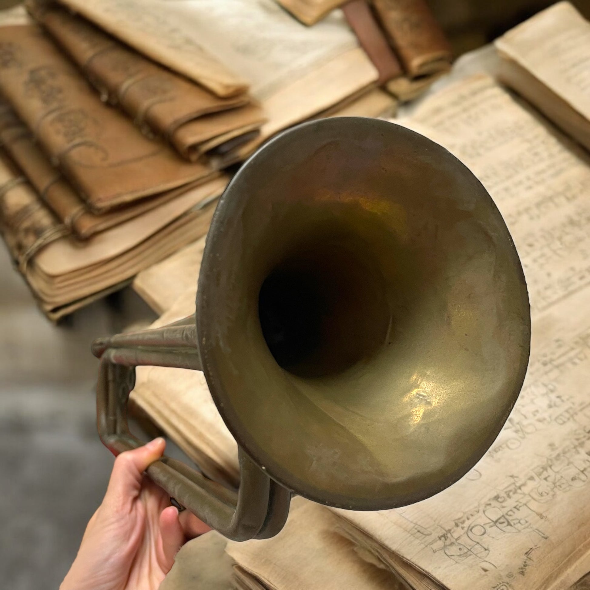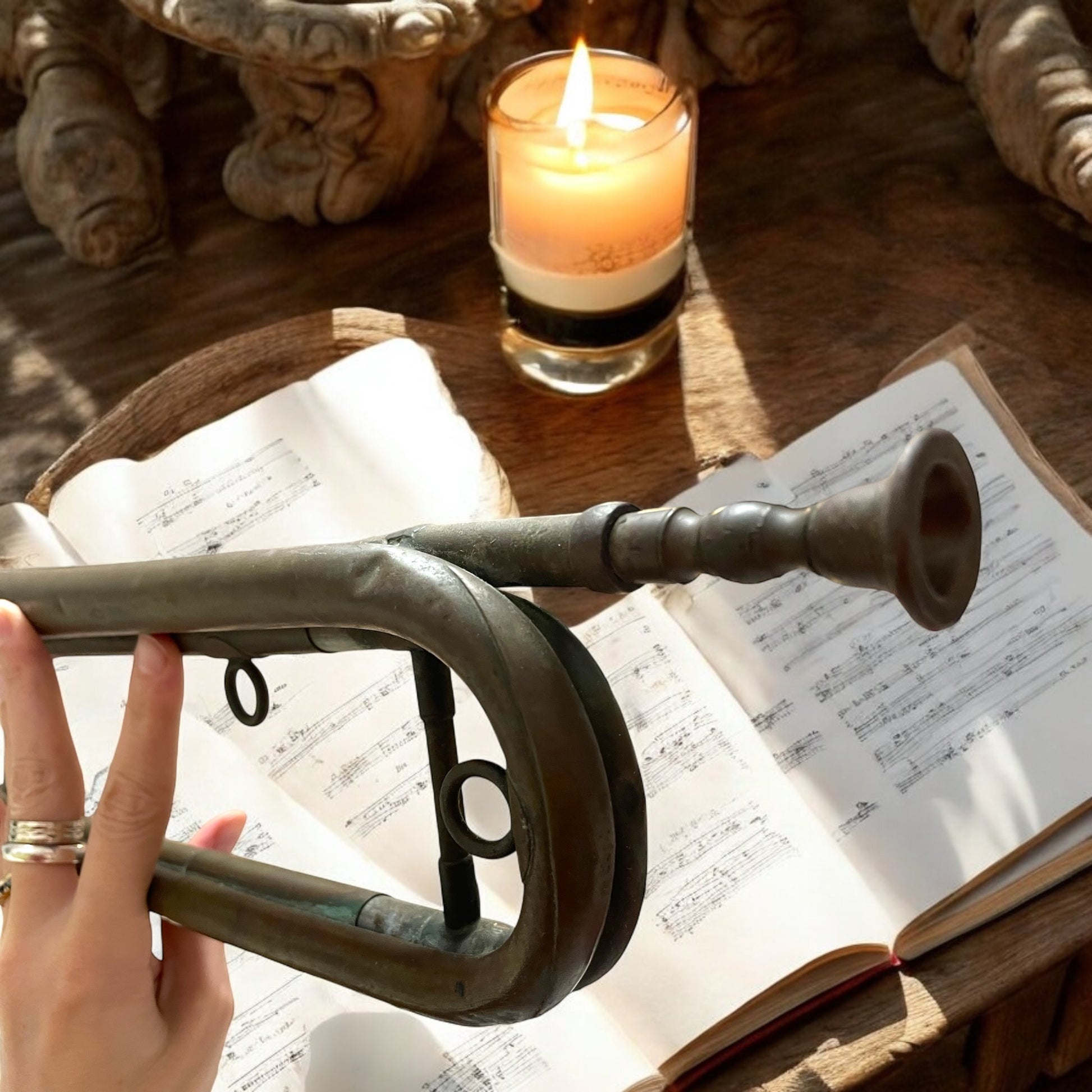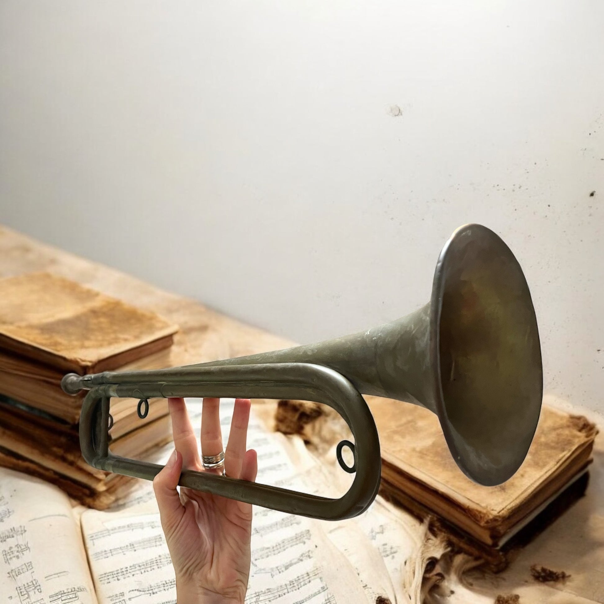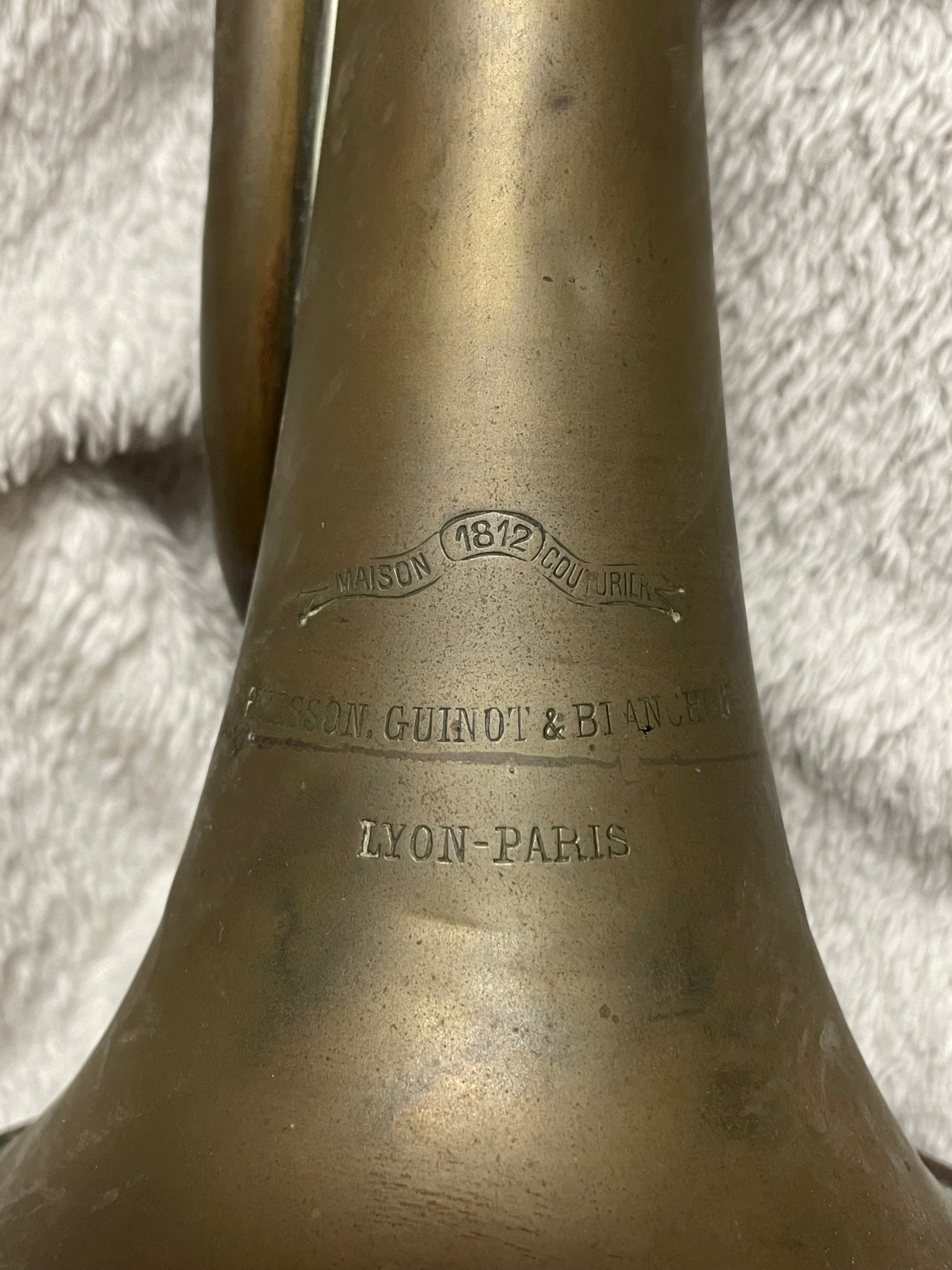 Tra le mani non stringi solo un antico strumento, ma un frammento di storia che riecheggia i suoni di un’epoca passata. Questa tromba, realizzata dalla celebre casa francese Pélisson, Guinot & Blanchon tra gli anni ‘20 e ‘30, porta con sé l’eredità di un’azienda fondata nel lontano 1812. La “Maison Couturier”, nata a Lione e successivamente espansa a Parigi, era rinomata per la qualità artigianale dei suoi strumenti musicali, molti dei quali destinati alle fanfare militari e ai cerimoniali ufficiali - come questa, che risuonava nei campi di addestramento e accompagnava marce solenni durante gli anni difficili del primo dopoguerra. Il suo ritrovamento, in una polverosa casa di campagna che un tempo apparteneva a un ex soldato, sembra quasi restituirla al suo contesto originario. Immaginate questa tromba, appoggiata in un angolo di quella dimora, testimone silenziosa di una vita che intrecciava sacrifici, disciplina e ricordi di un tempo di trincee e parate. Forse l’ex soldato, rientrato a casa dopo anni di servizio, l’aveva custodita con cura, come simbolo di un passato che non poteva essere dimenticato. Lo strumento presenta segni del tempo, schiacciamenti in alcuni punti. È firmato dalla casa produttrice, è lungo cm 50.